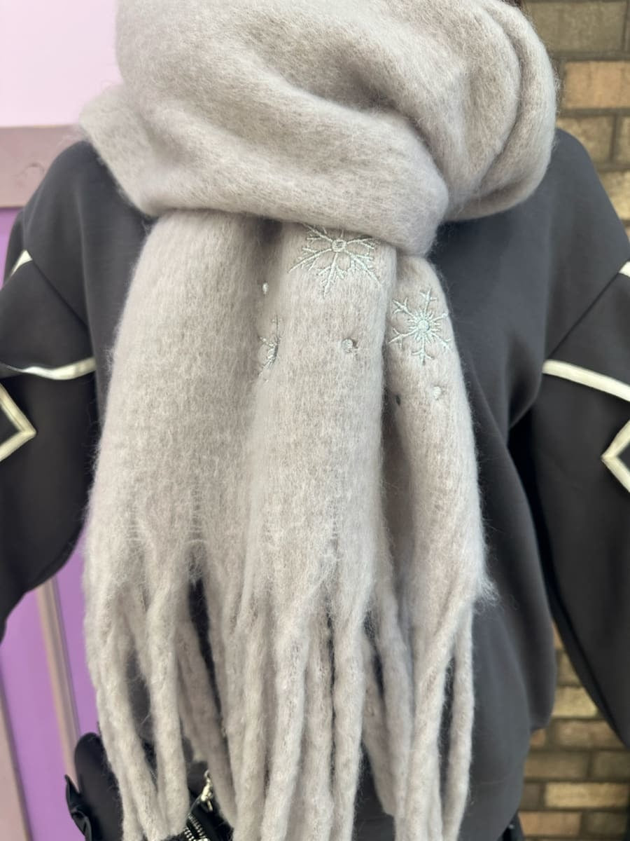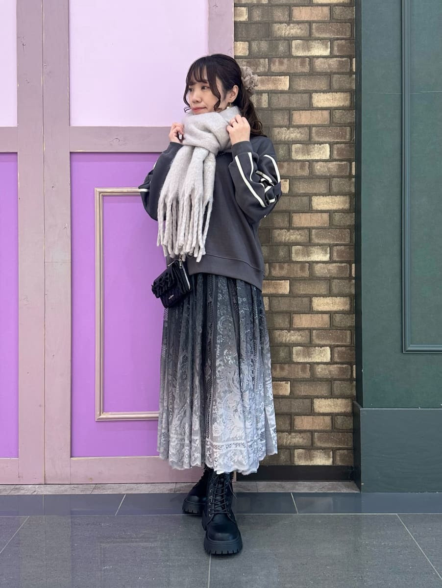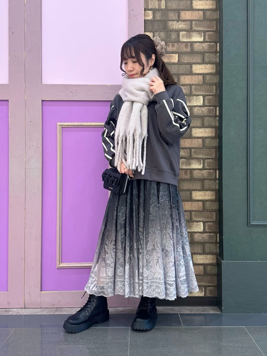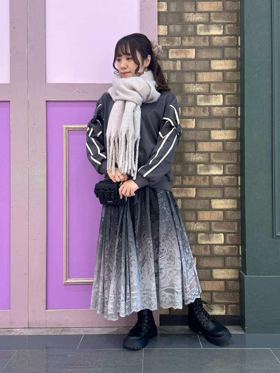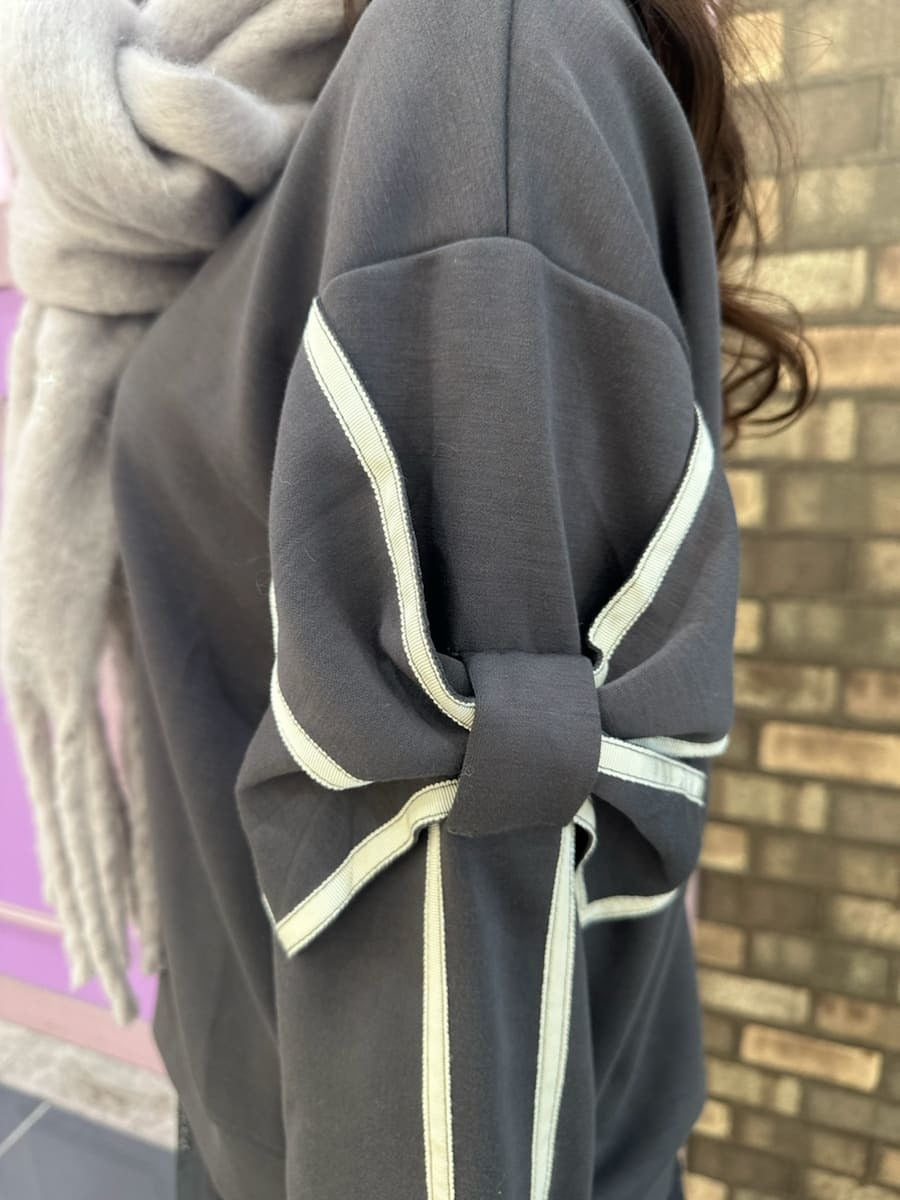 A casual look♡ This top, available only in select stores, features a ribbon design on the sleeves for a cute and sophisticated look☺︎ A fluffy scarf can be wrapped around your neck for cute protection from the cold⛄️
