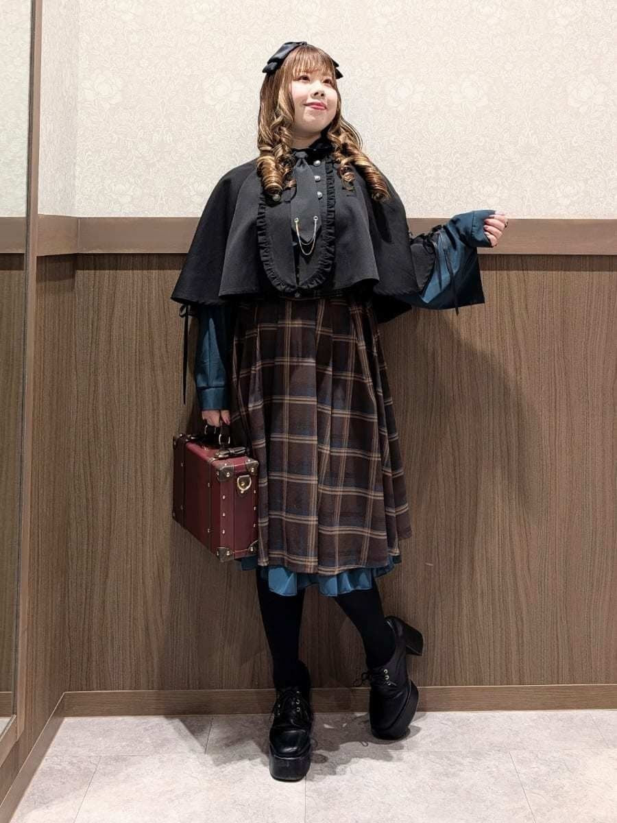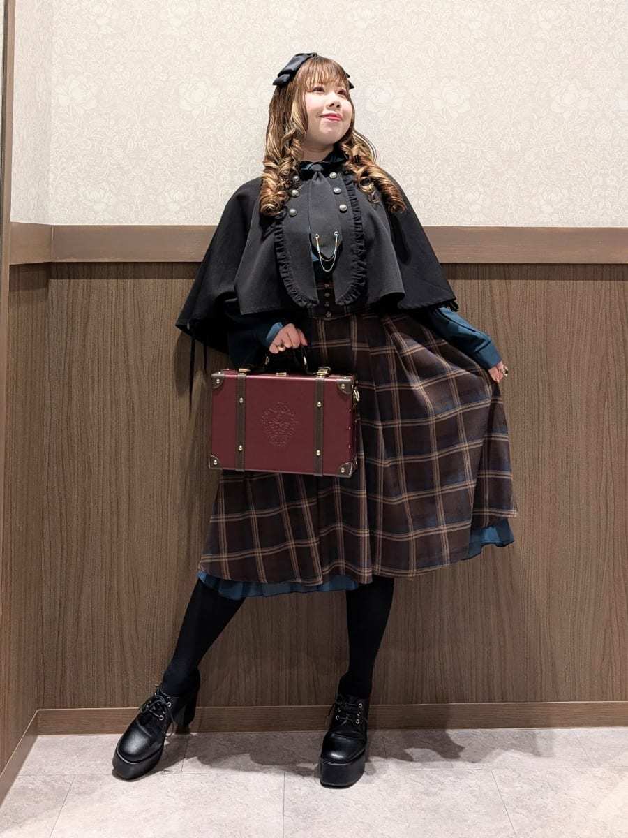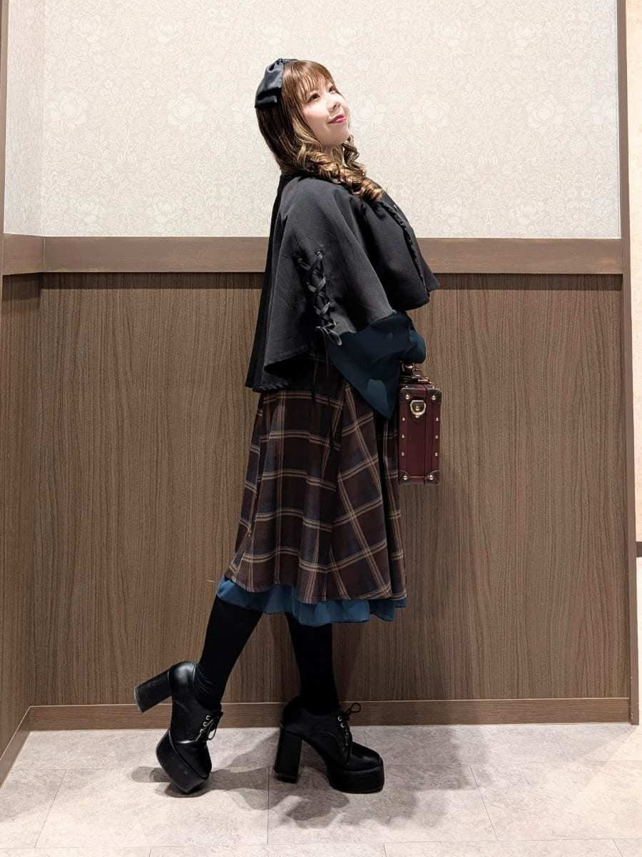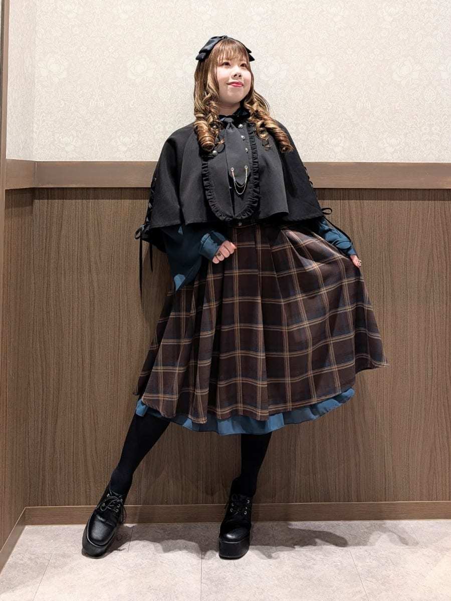 An outfit perfect for outings and oshi events, using the Cape Style Oversized Blouse with Tie, Lace-Up Skirt with Suspenders, and Double Button Lace-Up Cape.