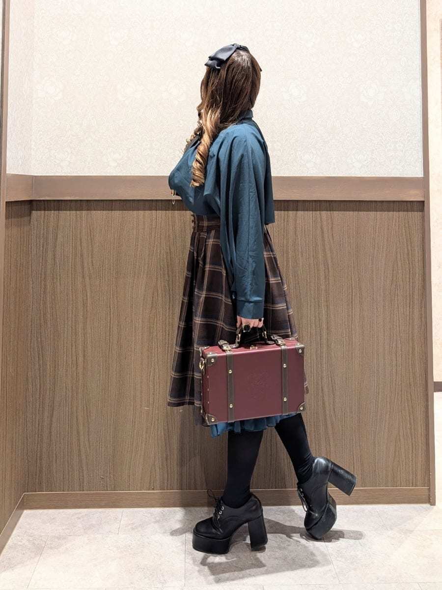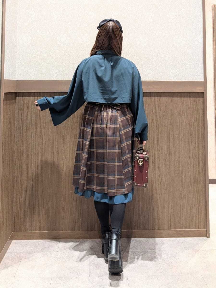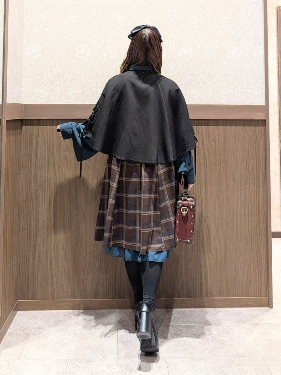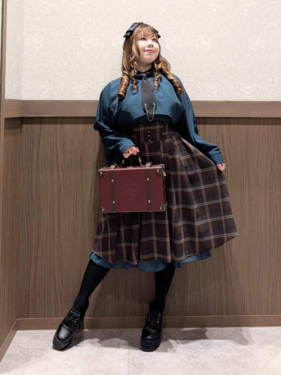An outfit perfect for outings and oshi events, using the Cape Style Oversized Blouse with Tie, Lace-Up Skirt with Suspenders, and Double Button Lace-Up Cape.
