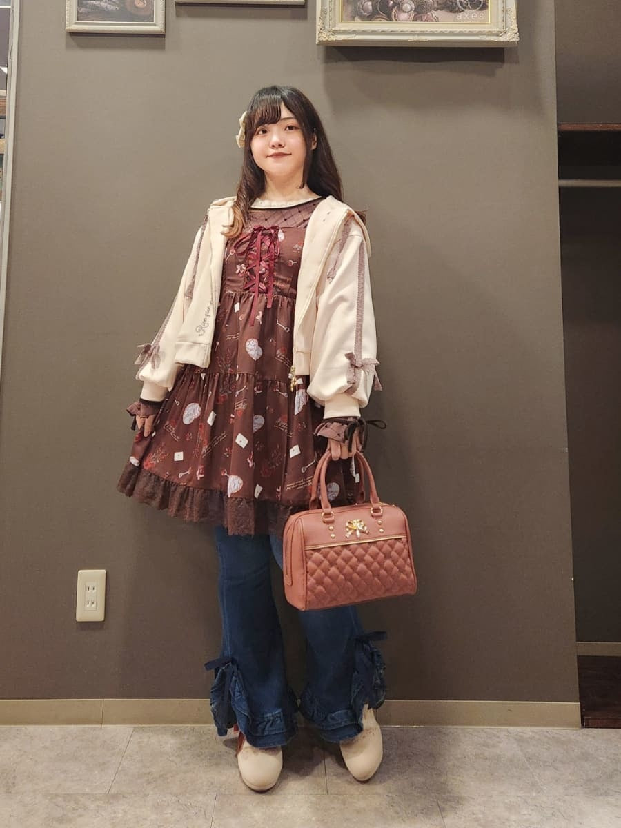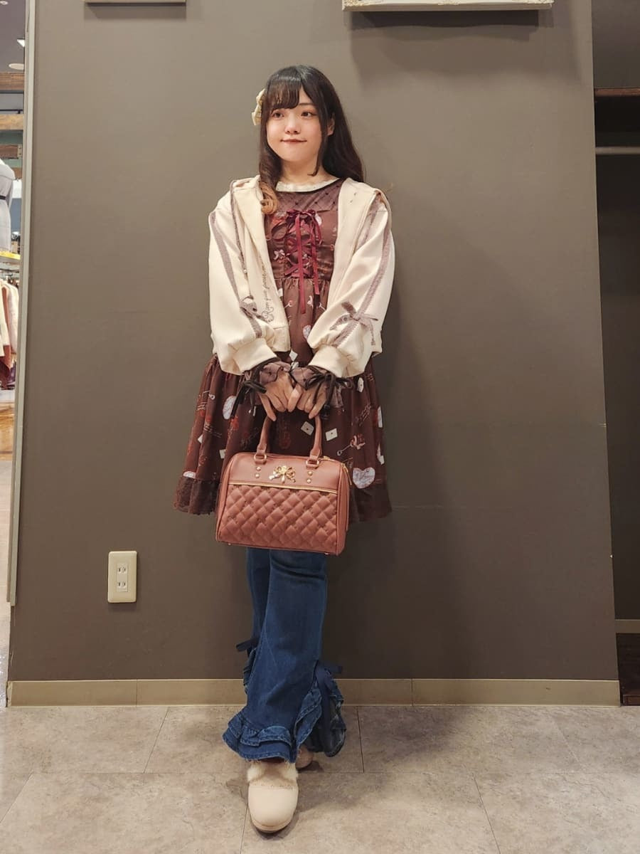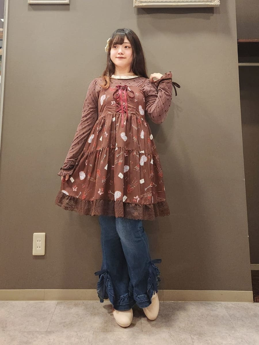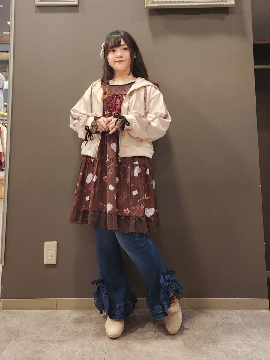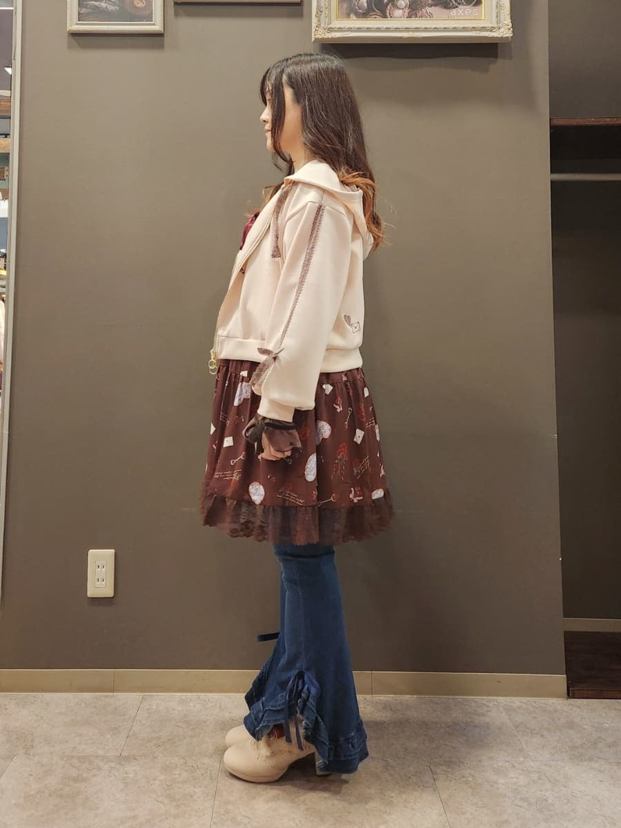 The bottoms are cute denim pants with frilly hems! The stretchy material makes them easy to wear, and the high-waisted design flatters your waistline✨ Available in sizes M and L.