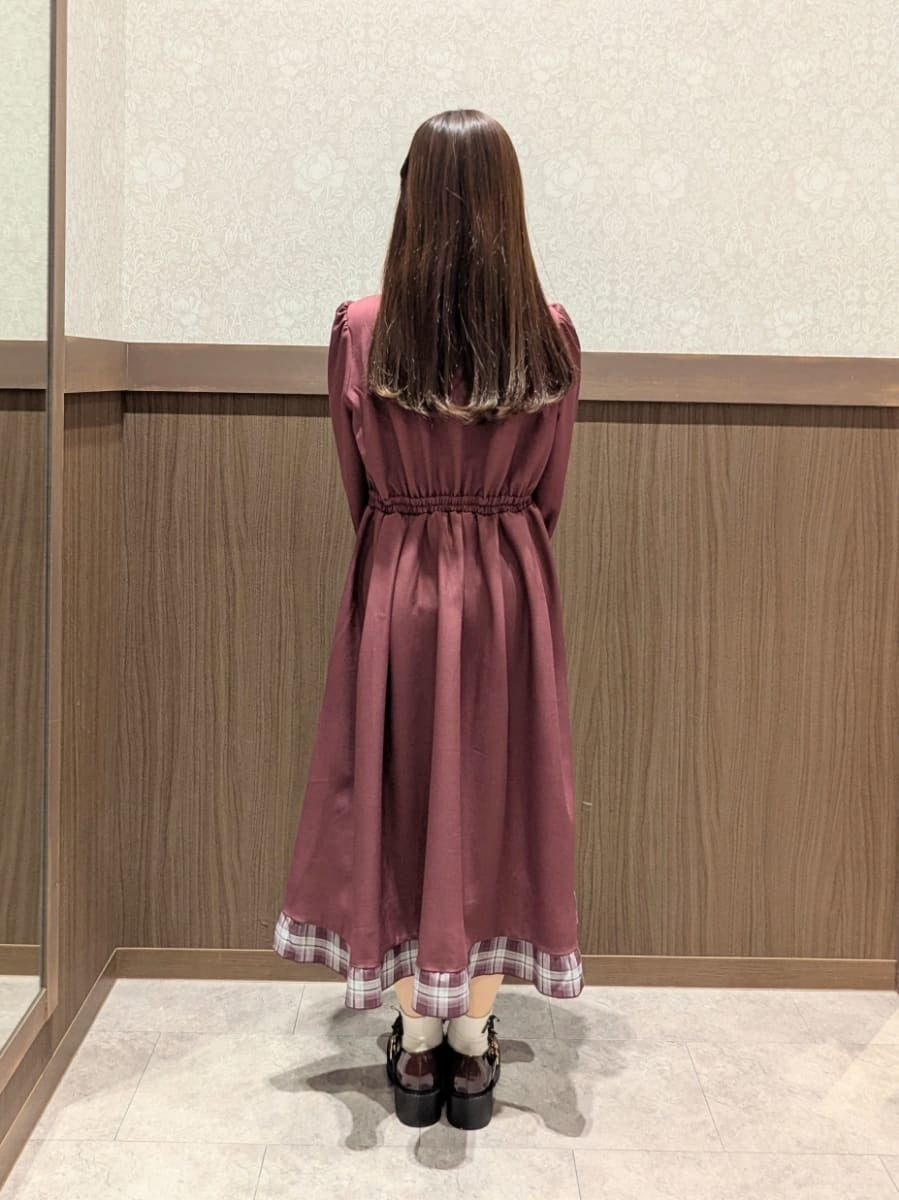 This dress has a cute checkered pattern♡I added a chocolate ring and brown shoes for a Valentine's Day-themed look🍫The one- piece ribbon piping is so cute with its checkered fabirc!It also looks cute with the cardigan🫶🏻