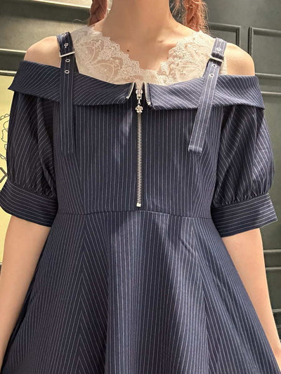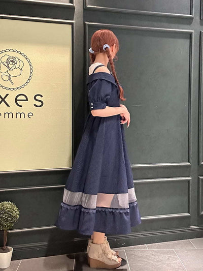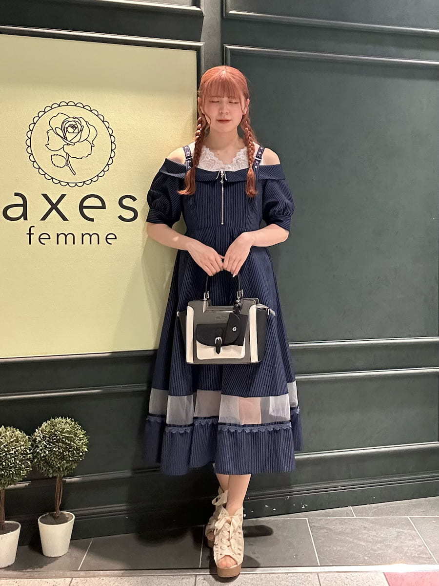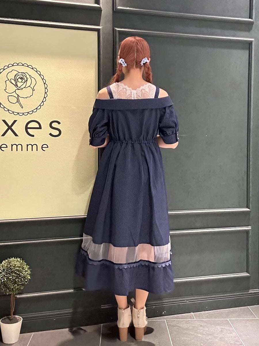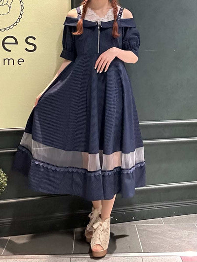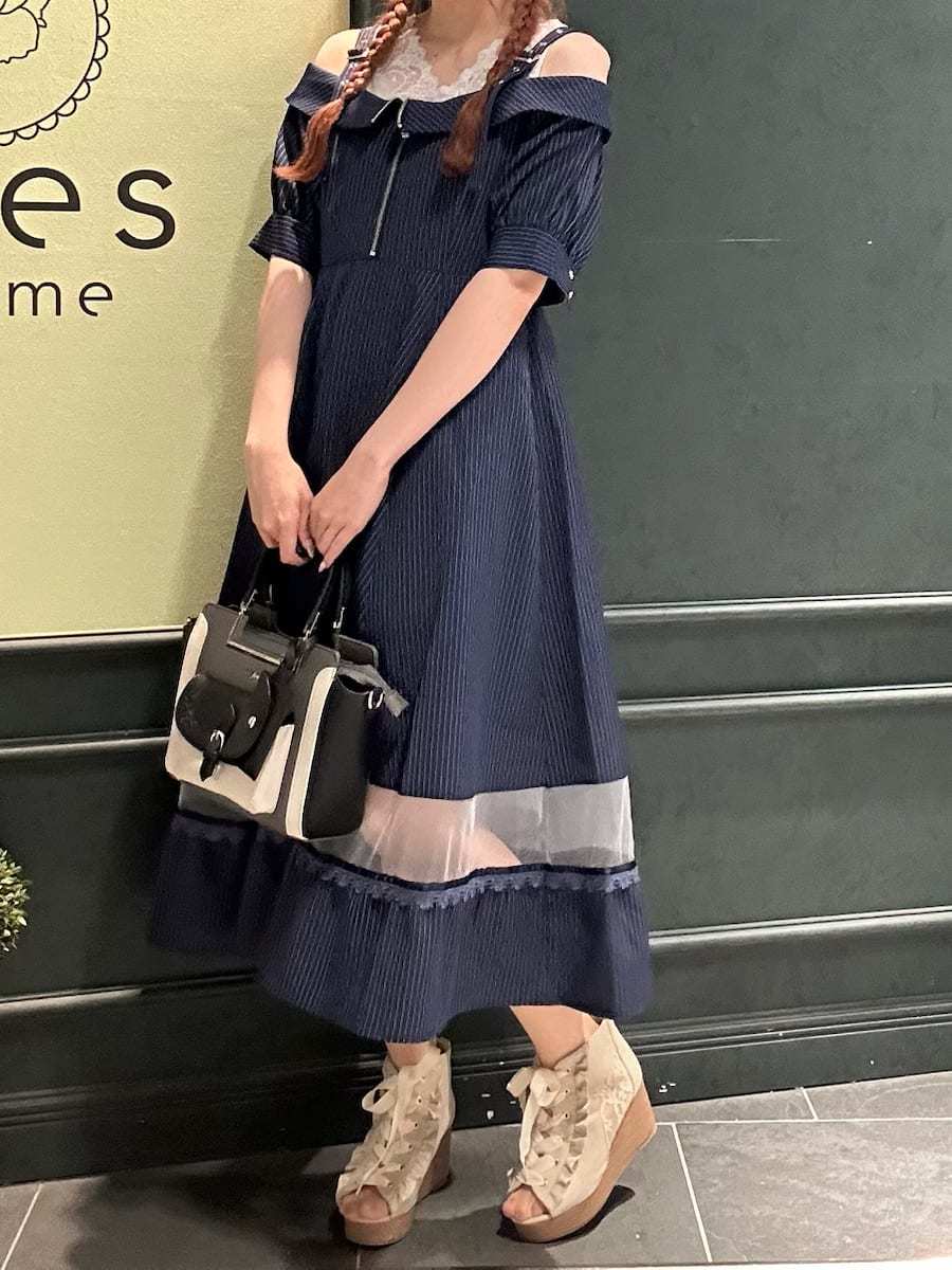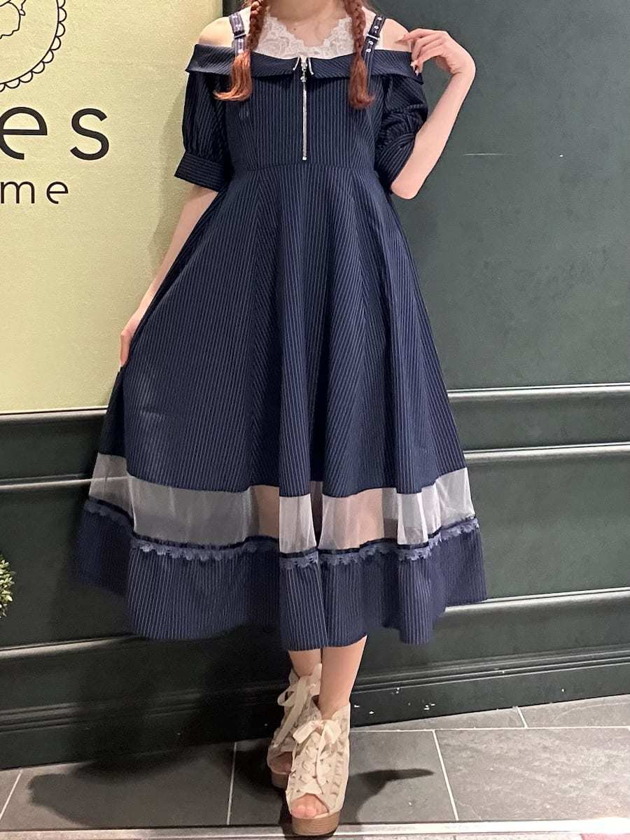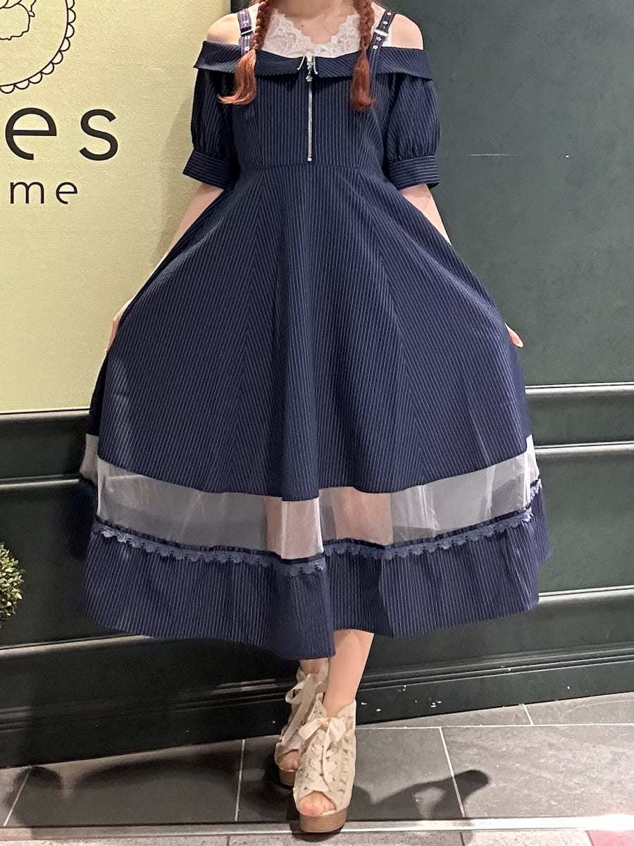 Summer outfit for going out✩.*˚An off-shoulder dress with a striped pattern♡The sheer panel at the hem is perfect for summer dates and outings⟡.·Definitely try this one🪄︎︎◝✩⋆┈┈┈┈┈┈┈┈┈┈┈┈┈┈┈┈┈⋆ Blouse⇒Snug fitSkirt⇒RoomyShoes⇒Snug fit