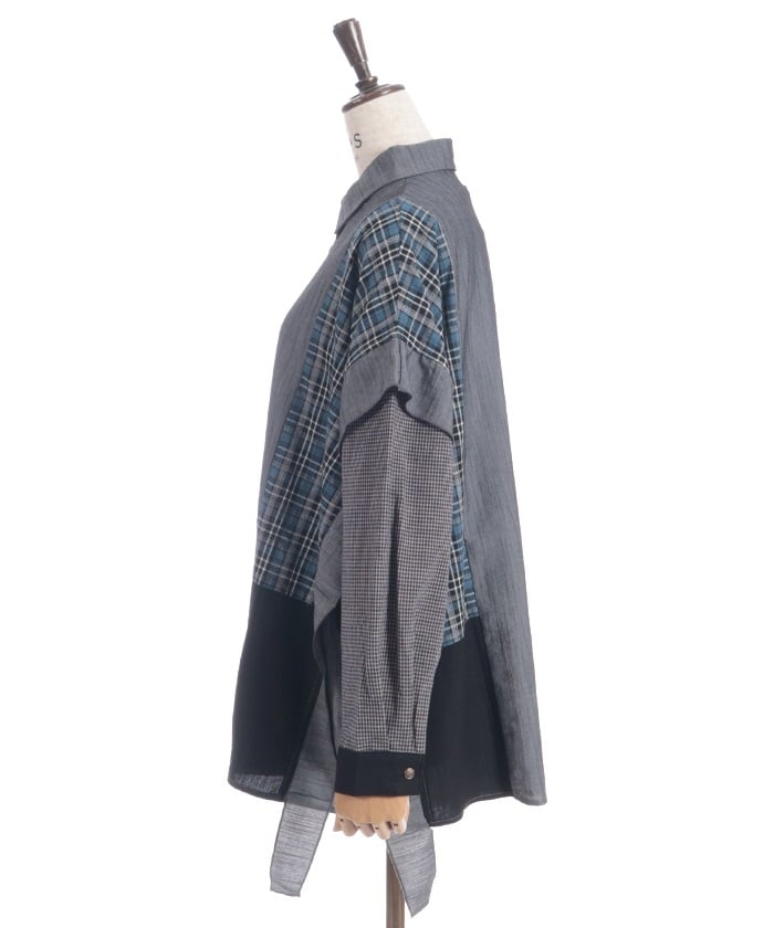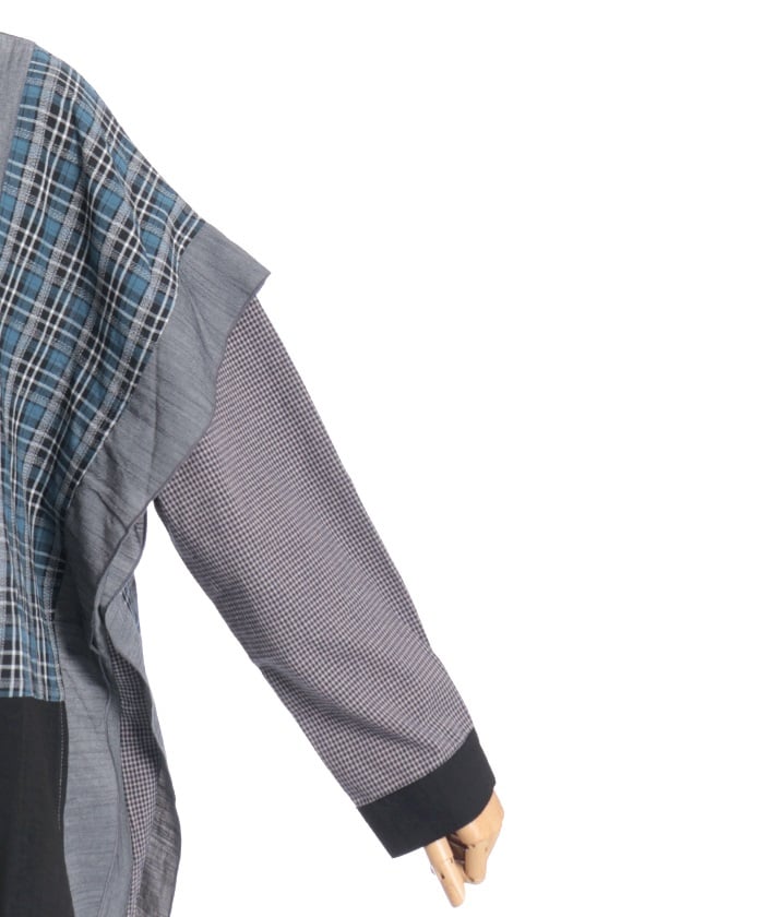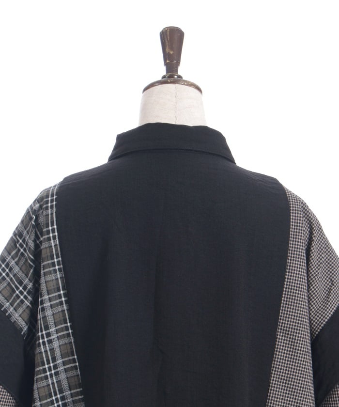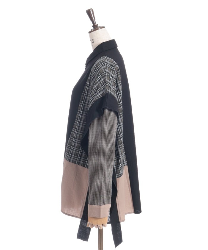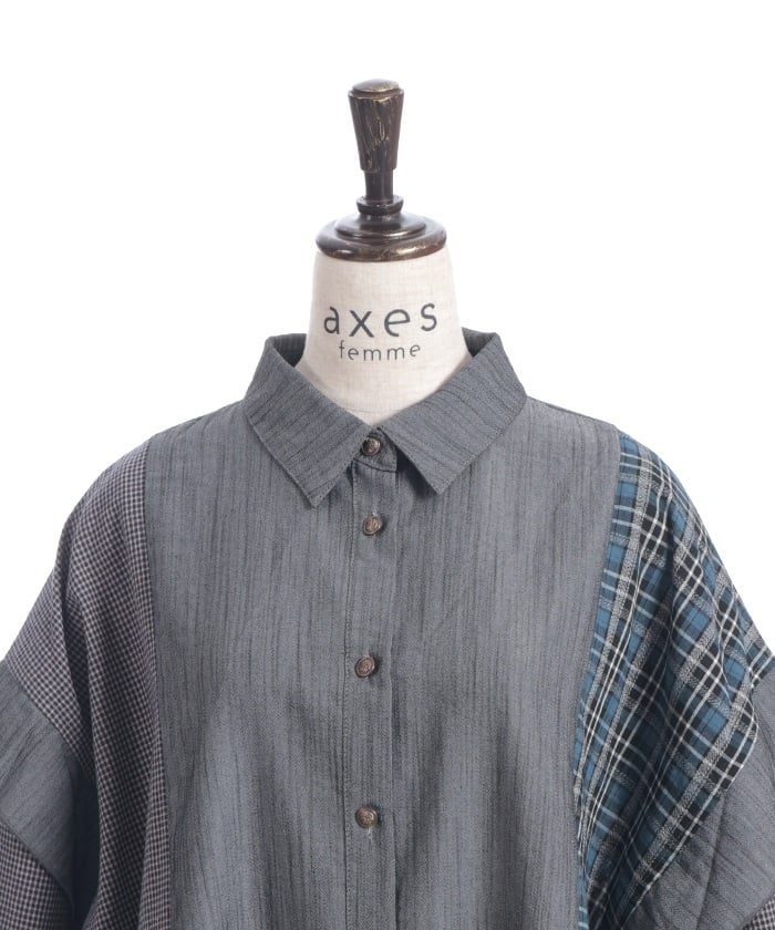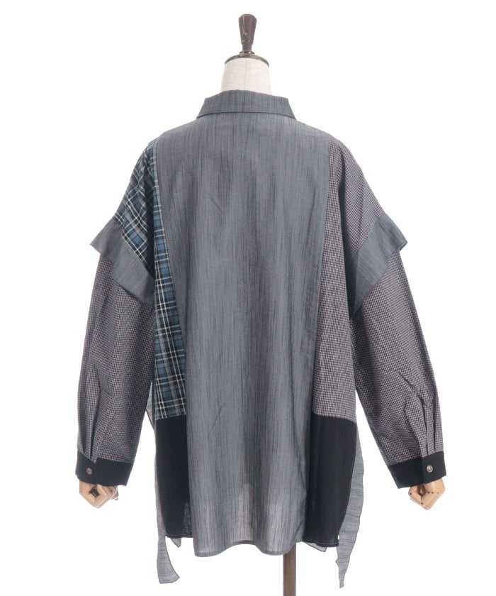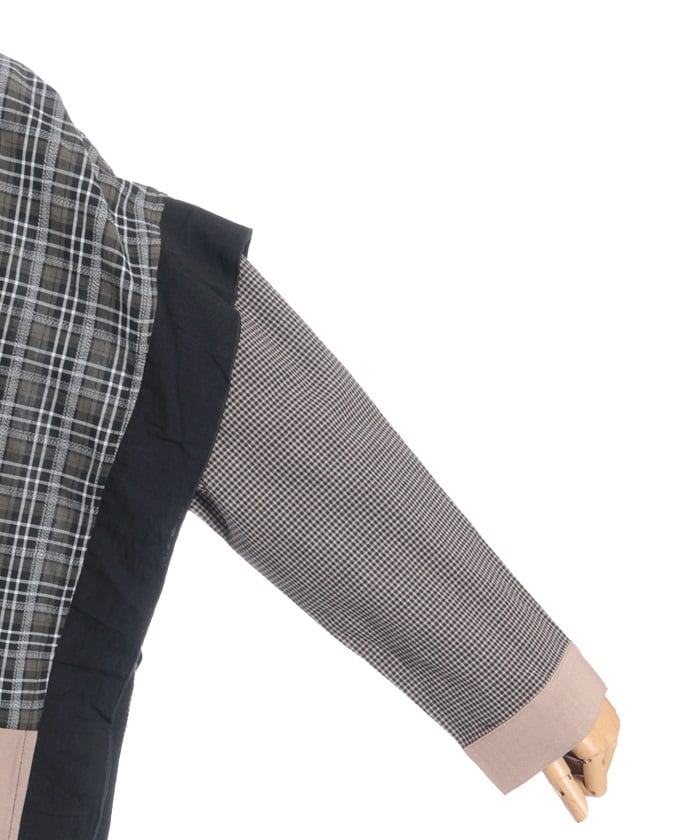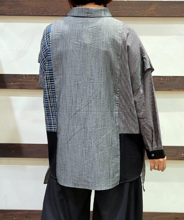 This shirt features an eye-catching patchwork design that combines multiple check patterns.