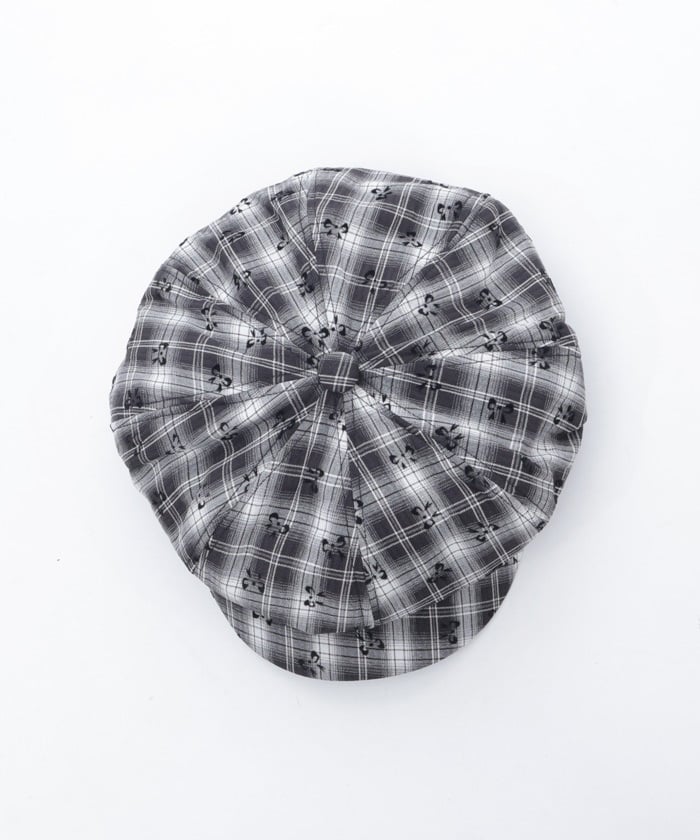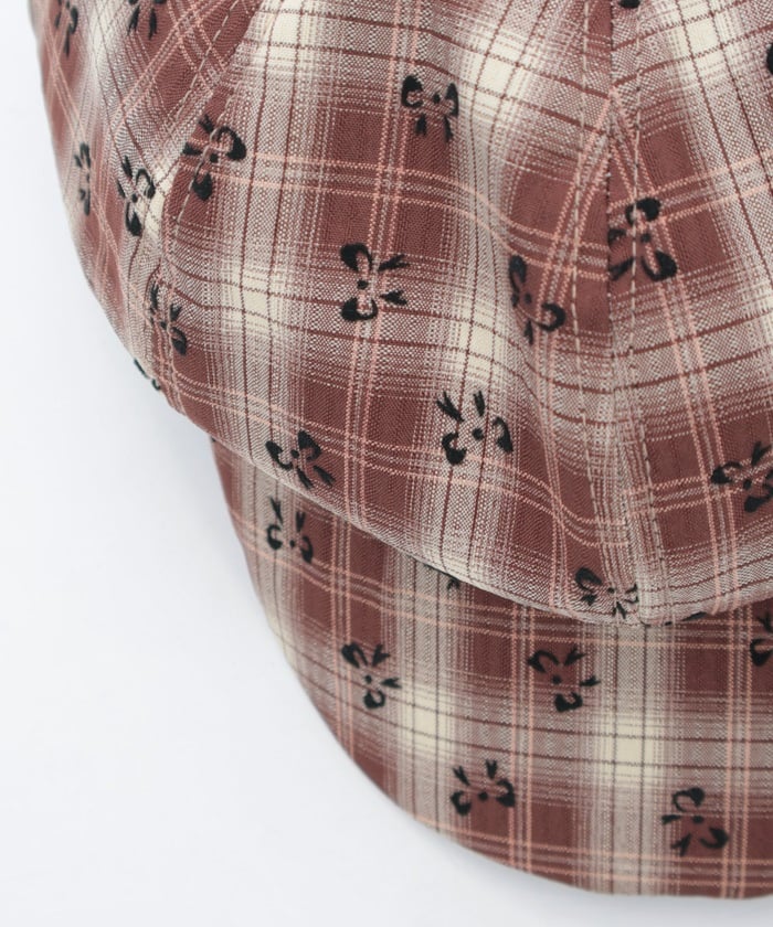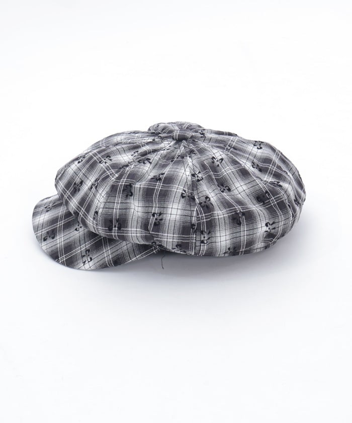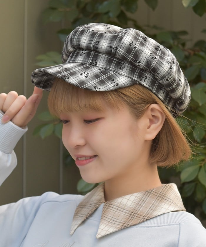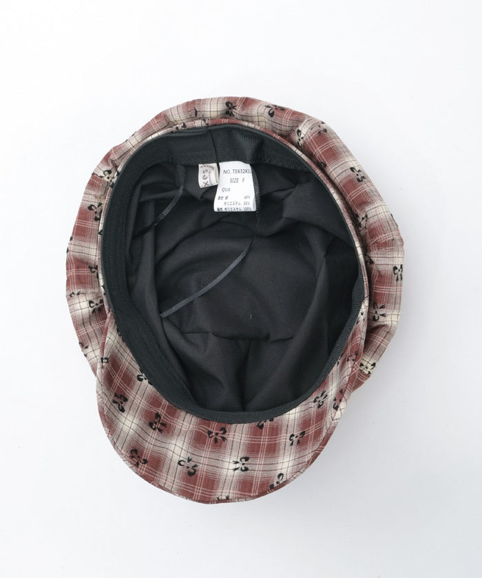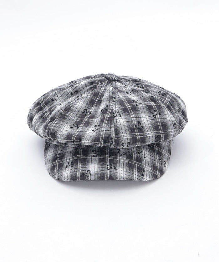 This checkered newsboy cap features a ribbon-patterned flocked print.