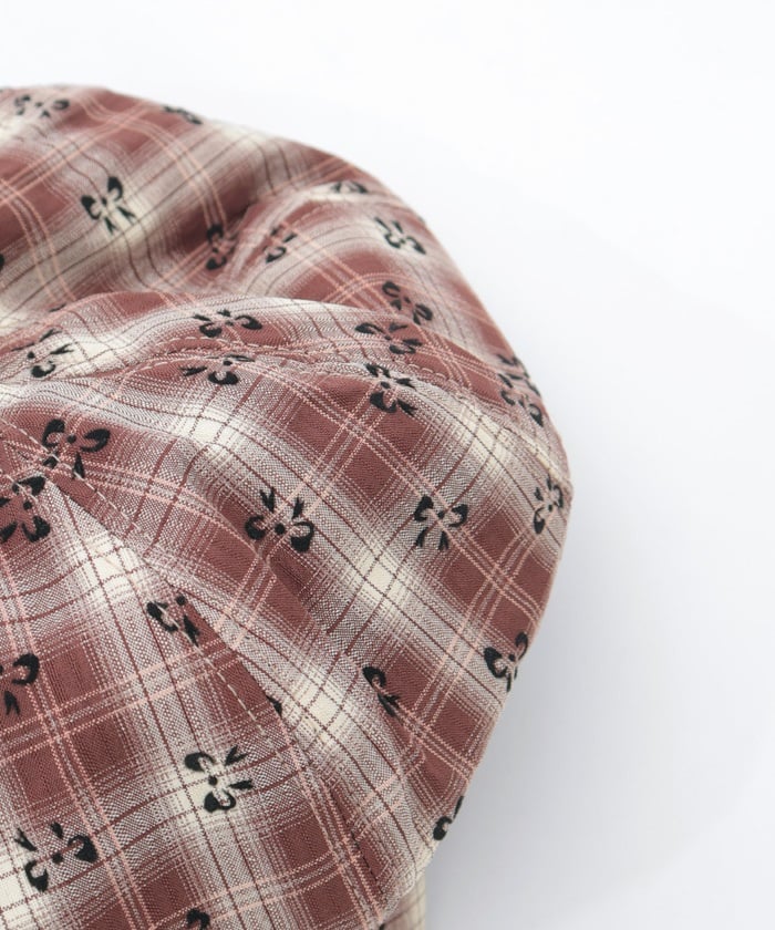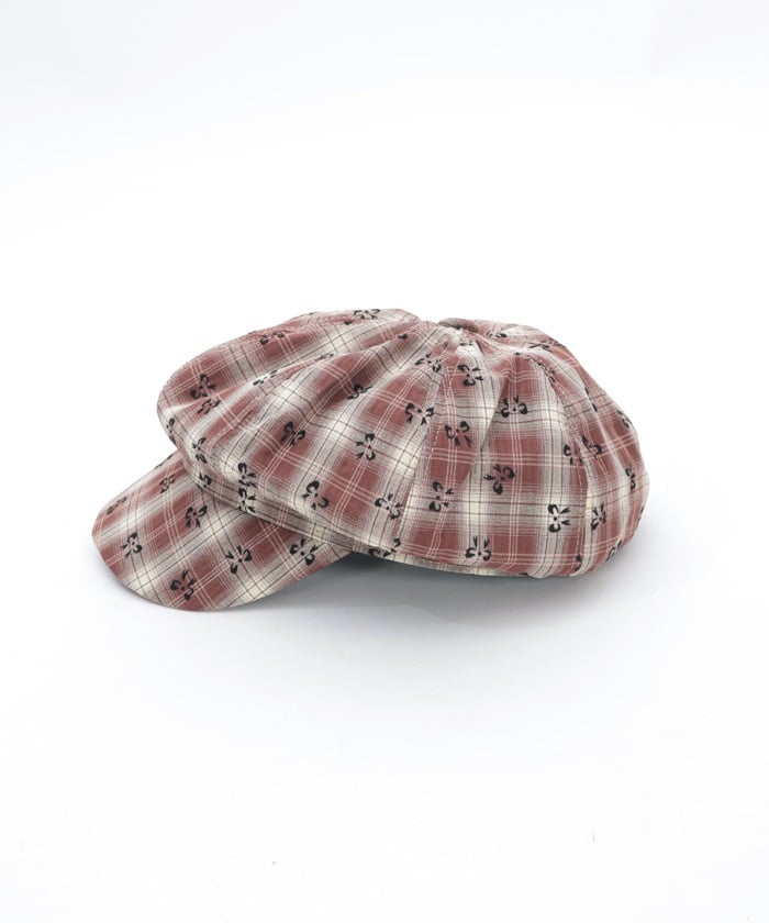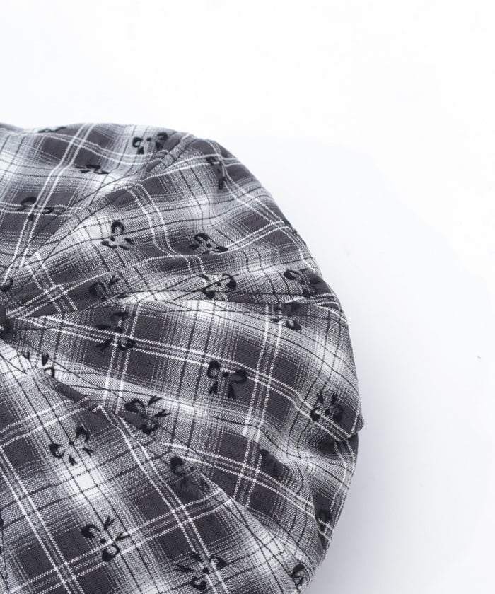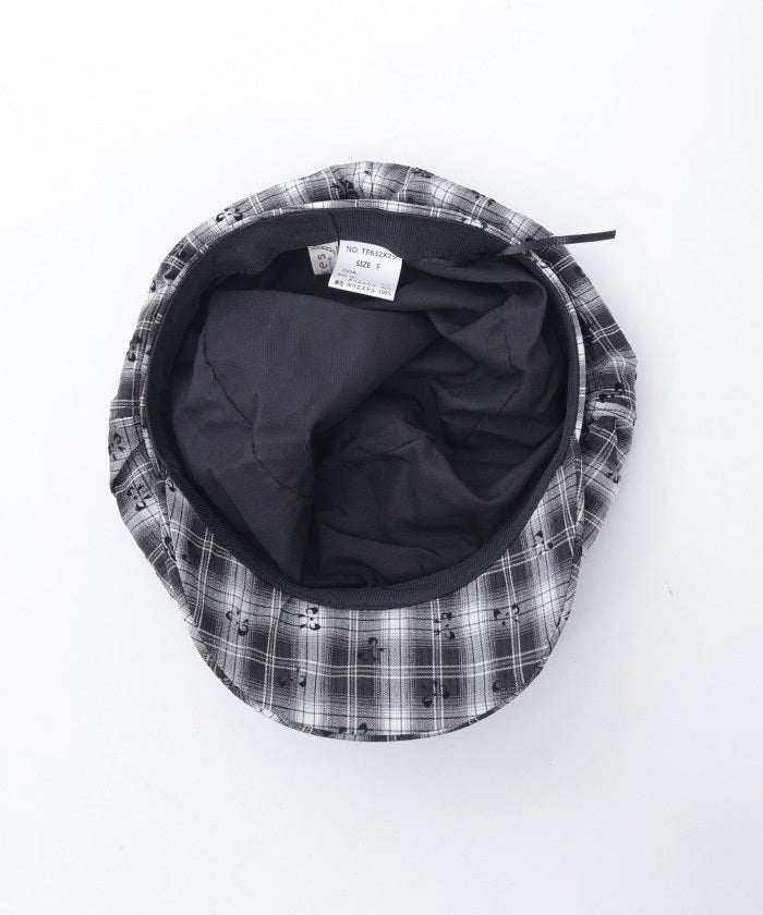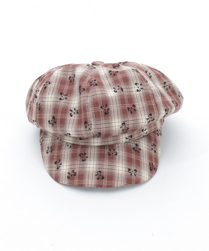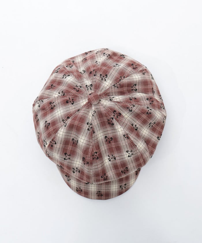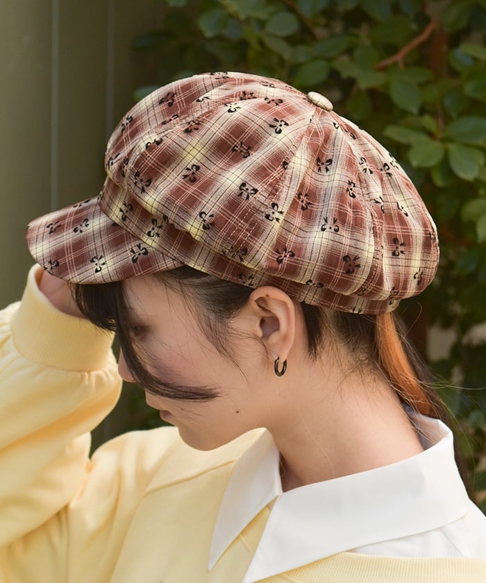 This checkered newsboy cap features a ribbon-patterned flocked print.