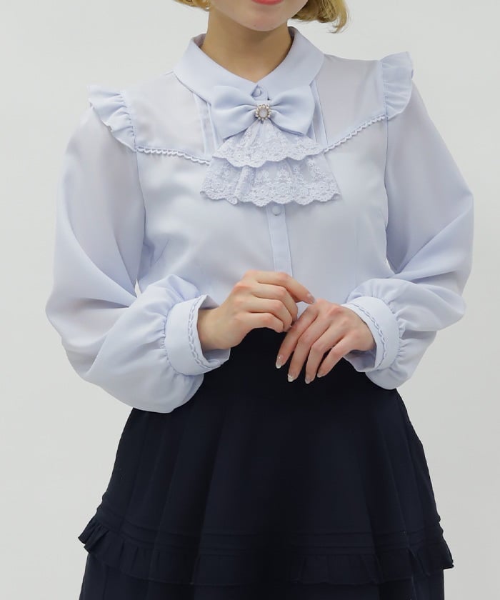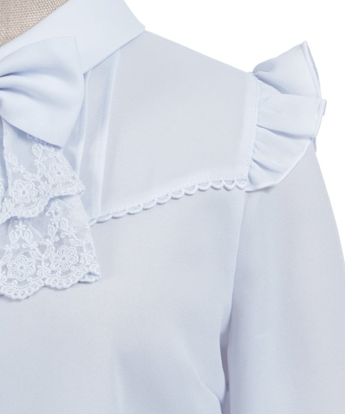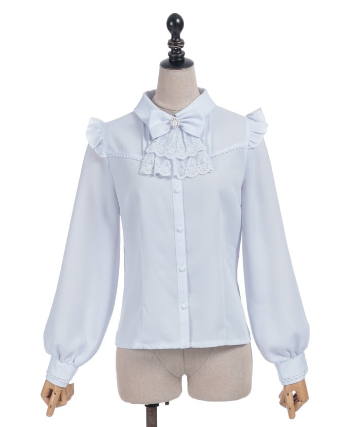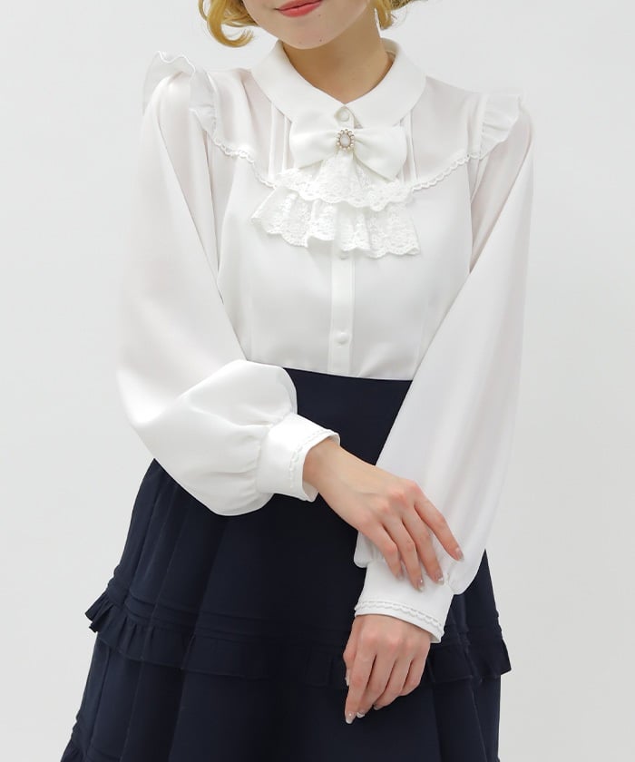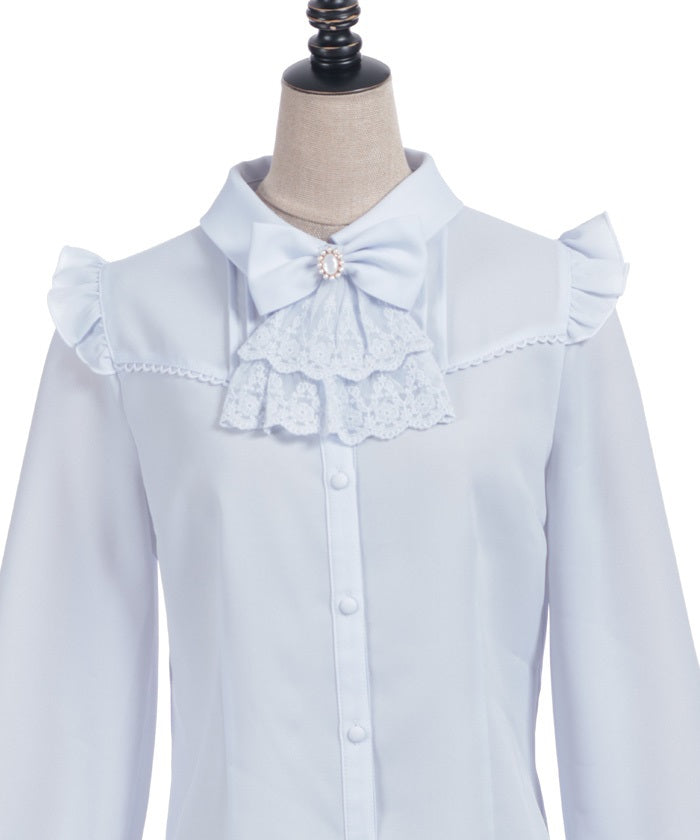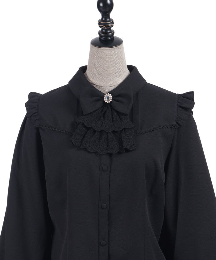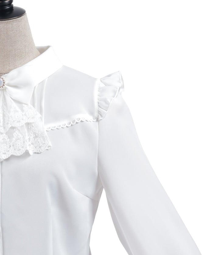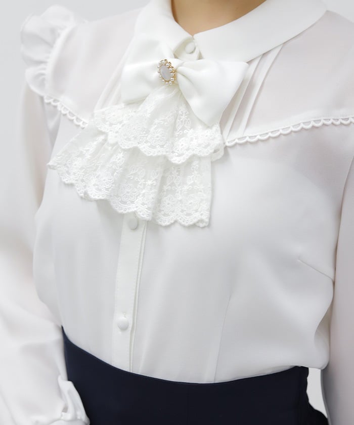 This blouse features lace ruffles for a three-dimensional look and a ribbon jabot brooch.