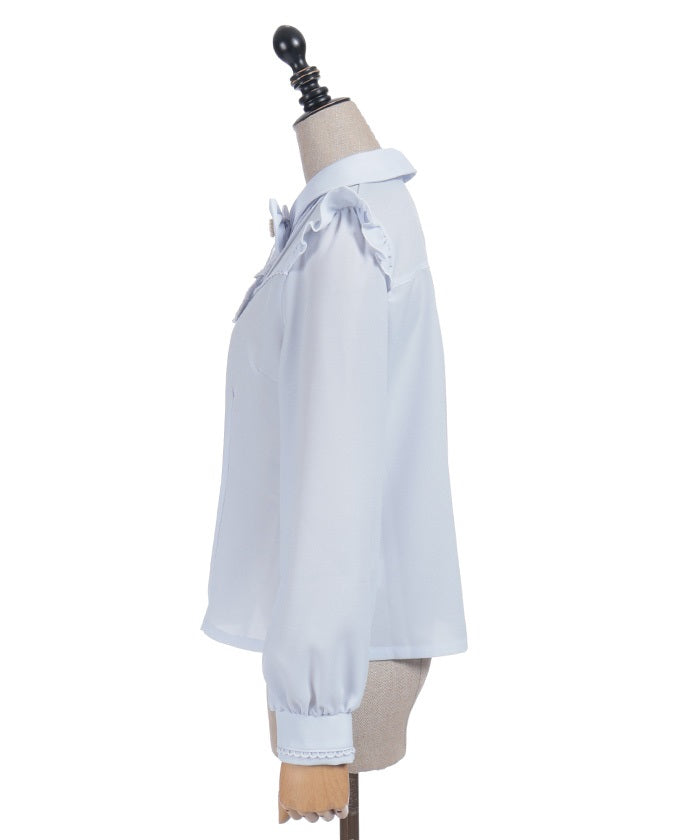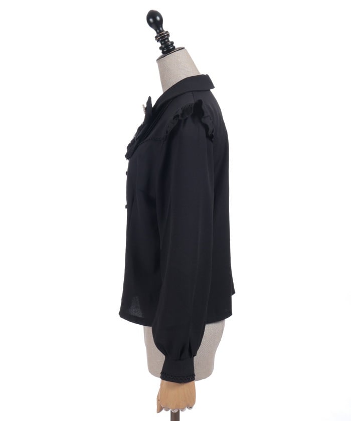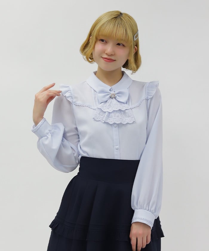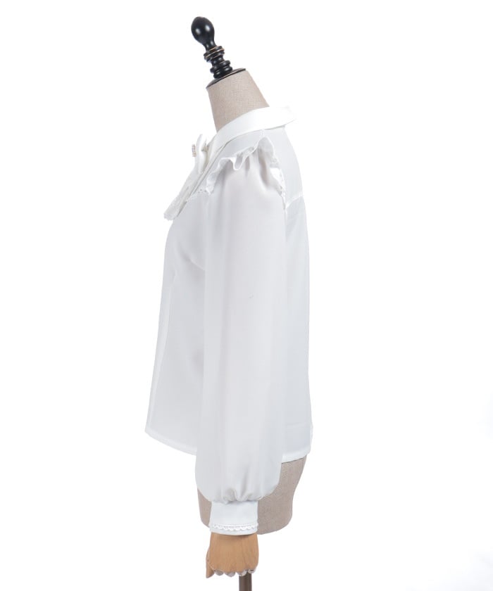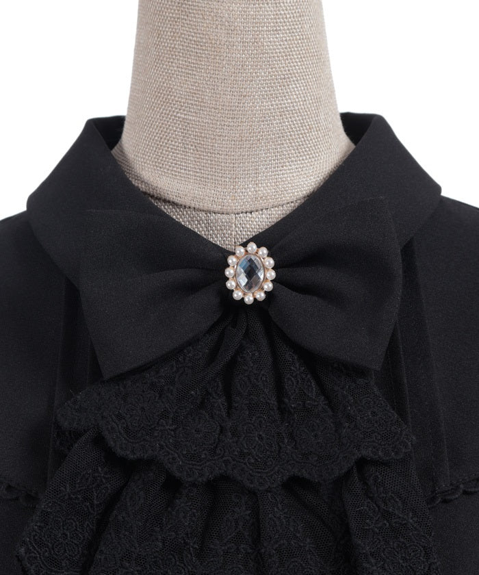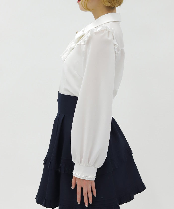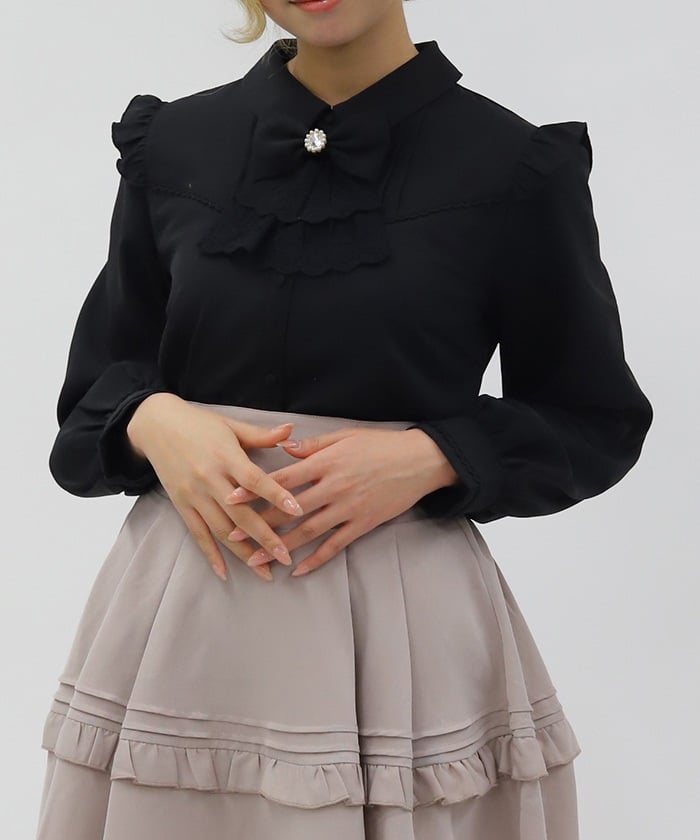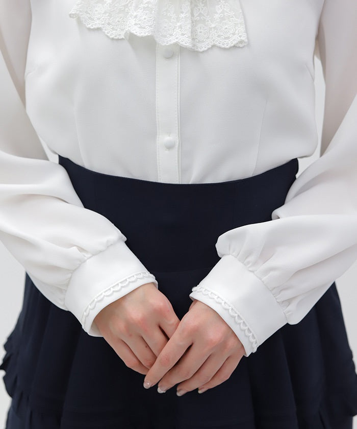 This blouse features lace ruffles for a three-dimensional look and a ribbon jabot brooch.