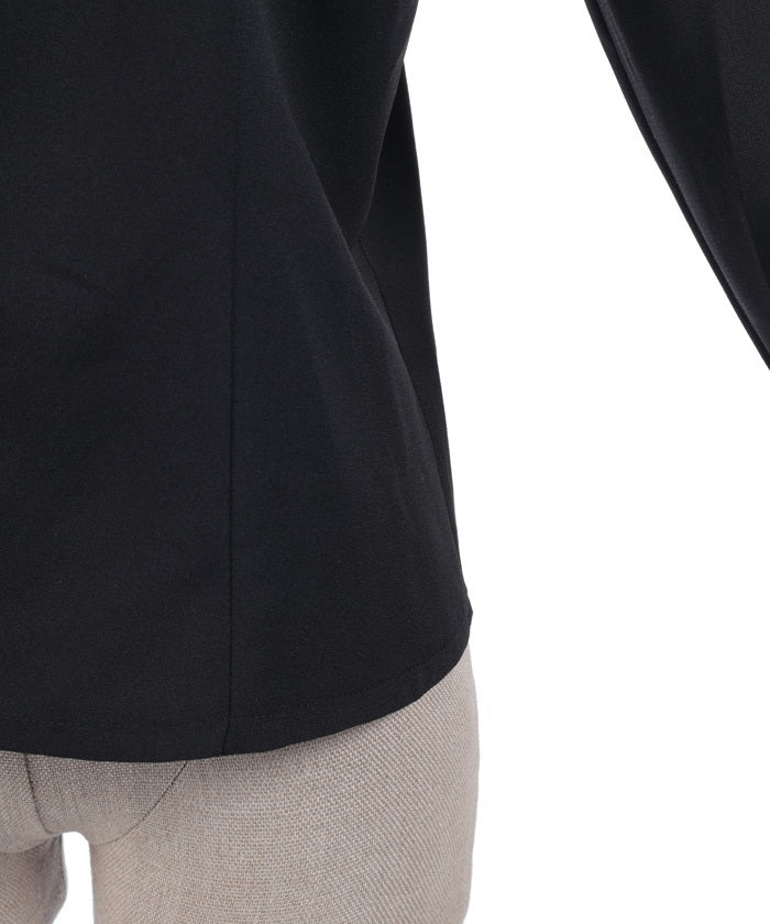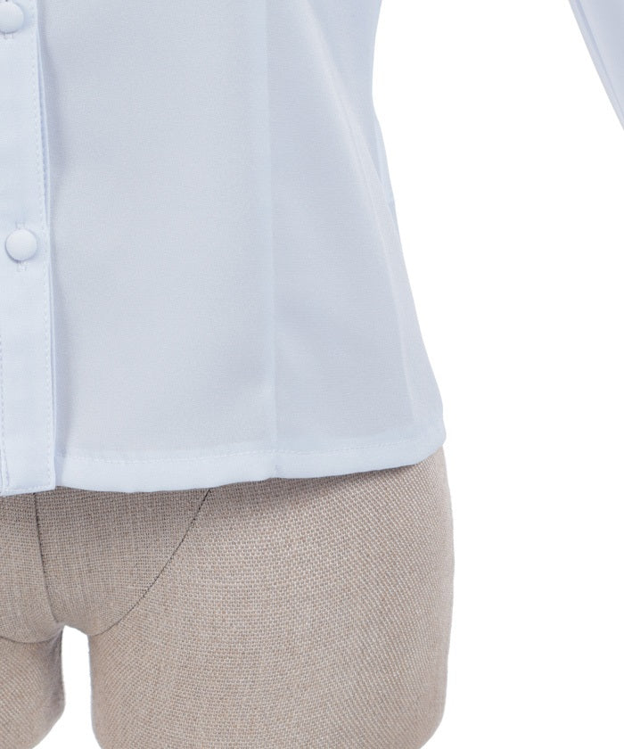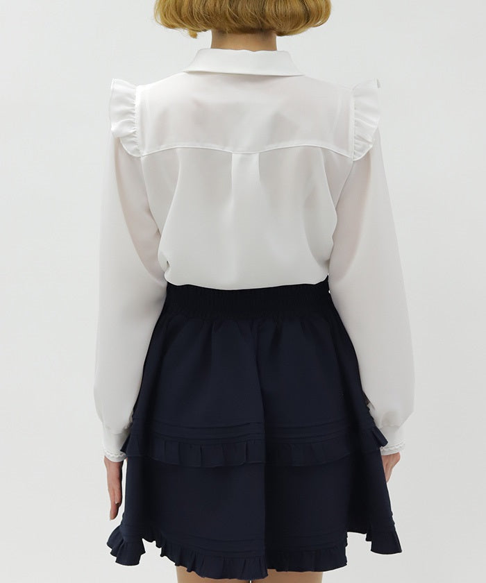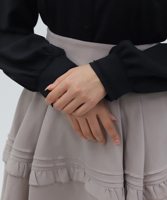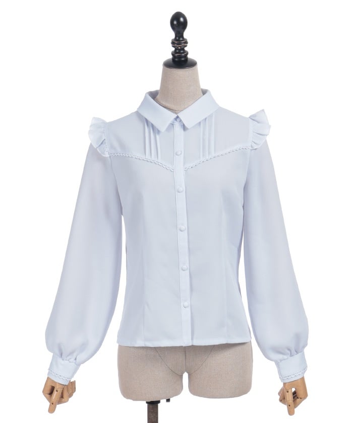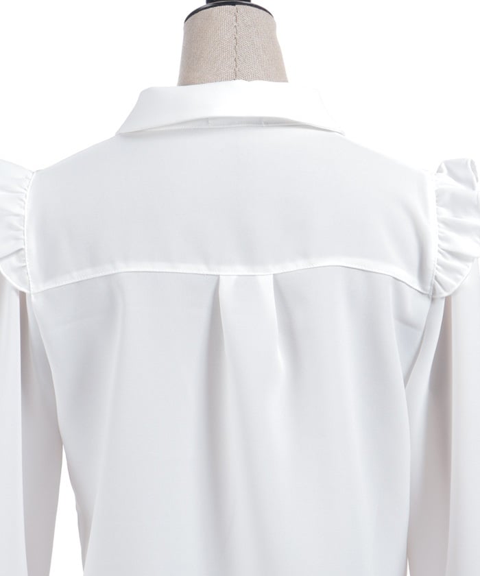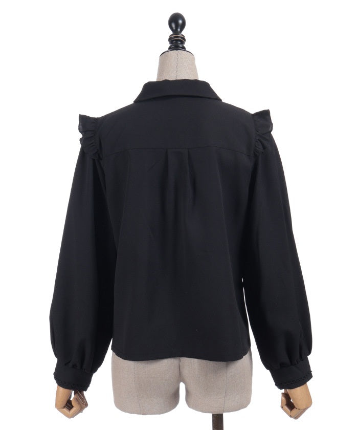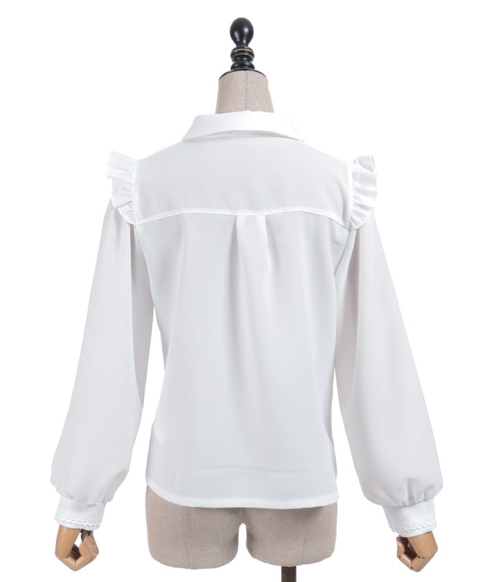 This blouse features lace ruffles for a three-dimensional look and a ribbon jabot brooch.