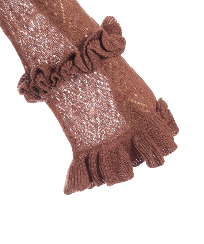 This knit cardigan features a charming crochet-inspired knit that exudes a warm, maid-like feel.