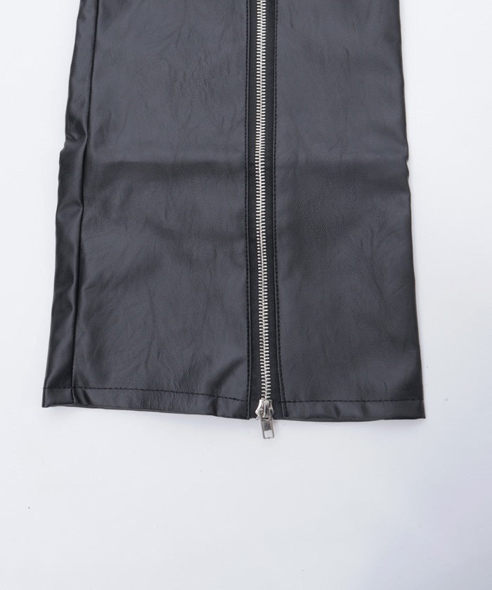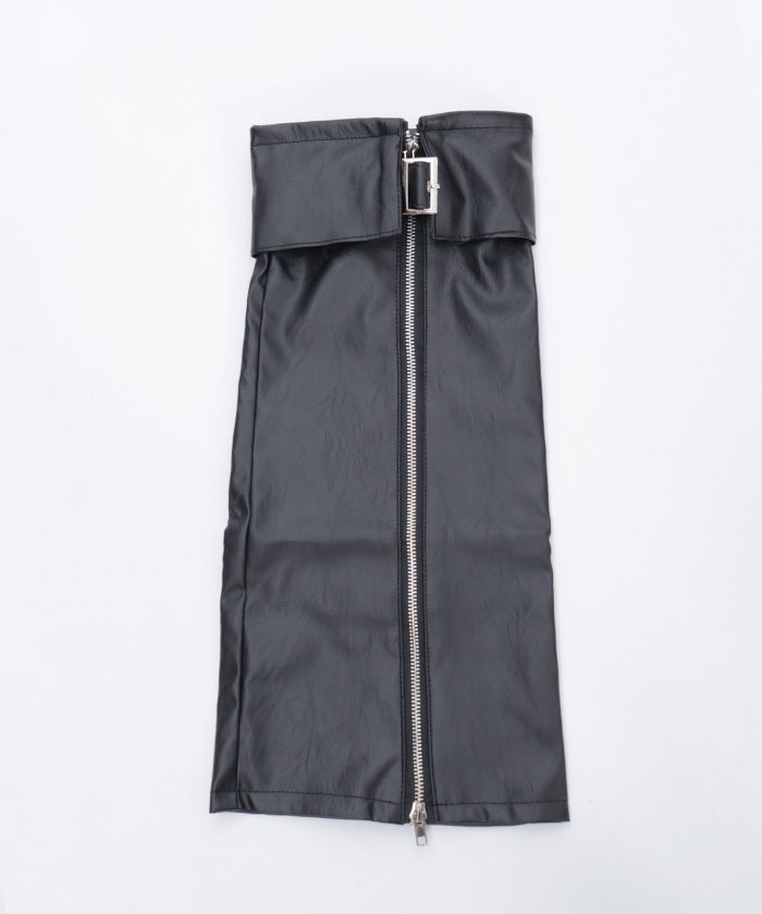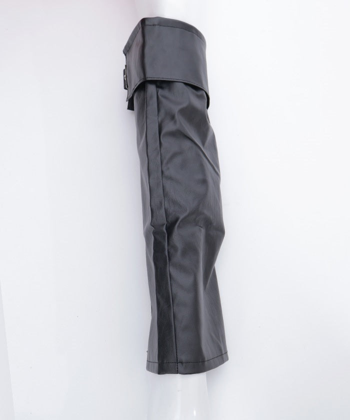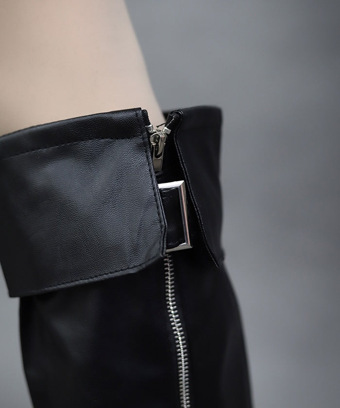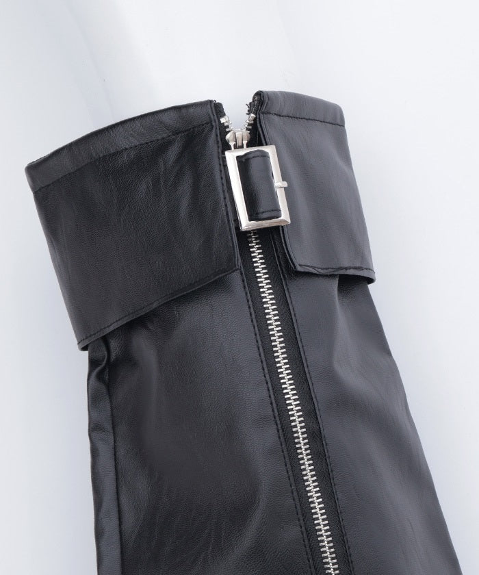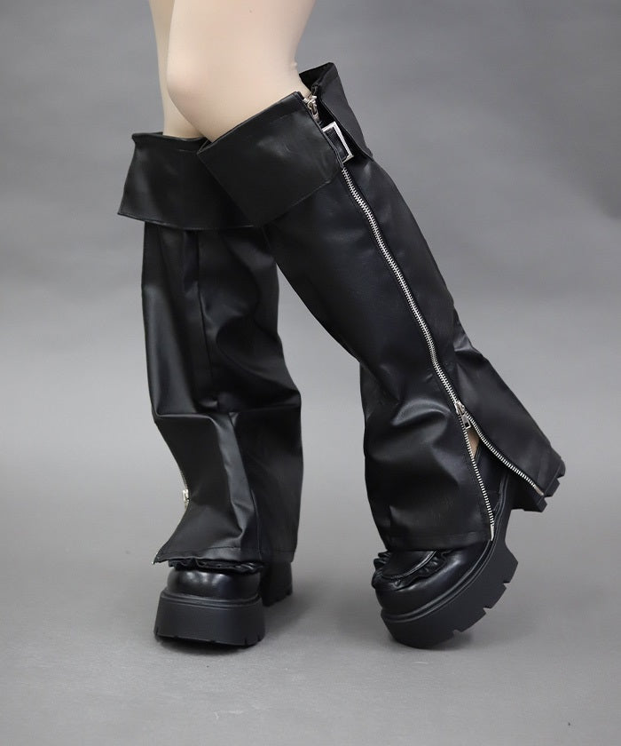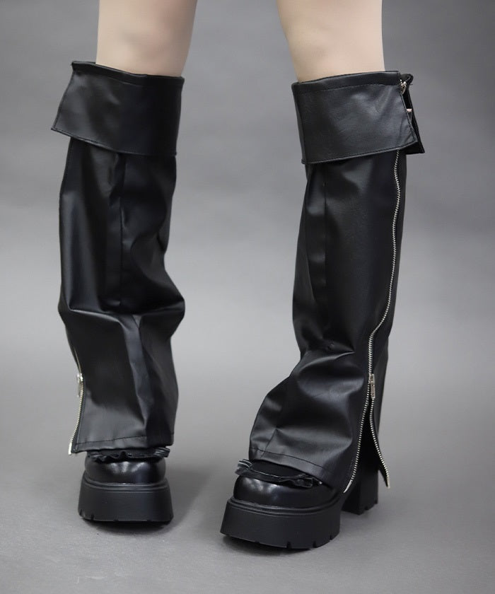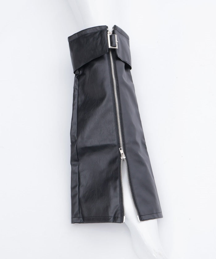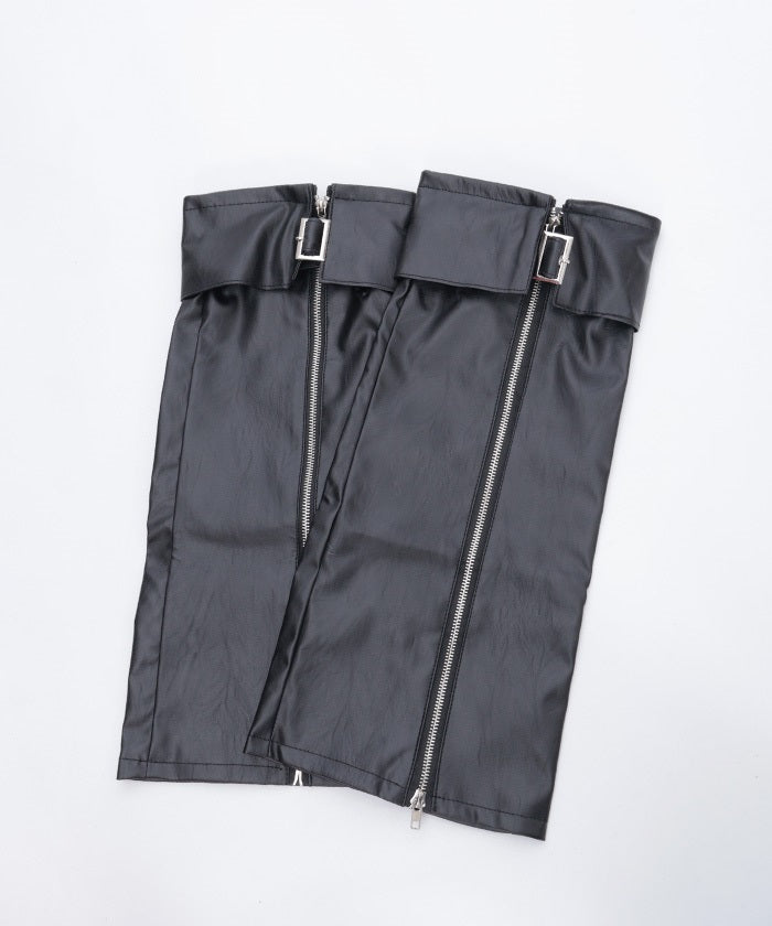 These leg covers feature a bold design with a belt and zipper.