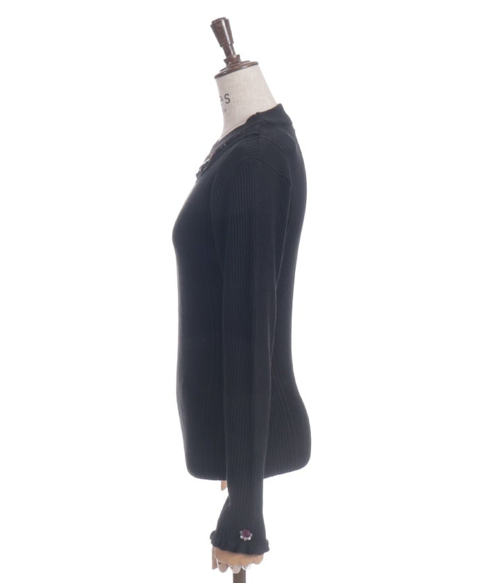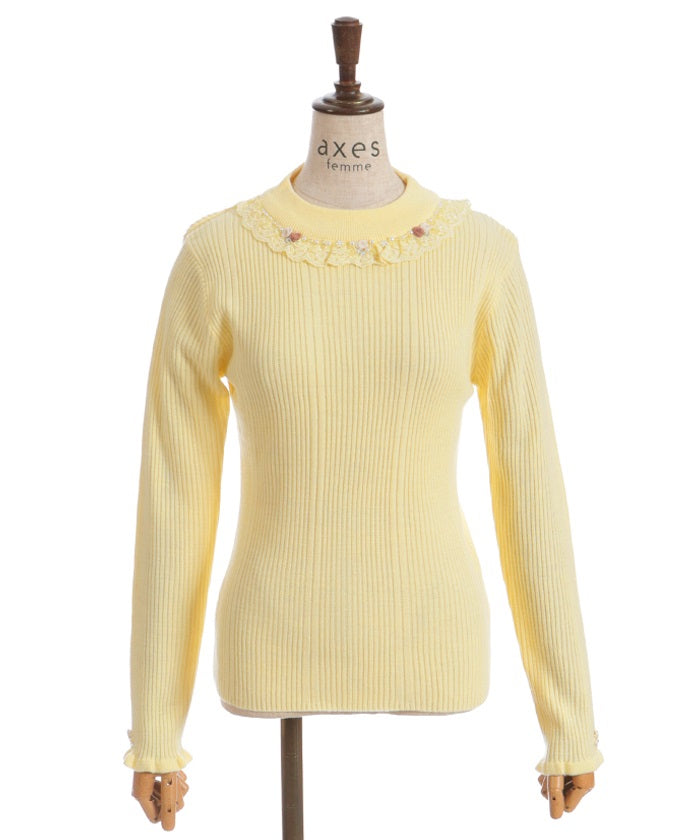 This knit top has a highly decorated design, with pearl beads over rose-patterned tulle lace around the neckline like a necklace.