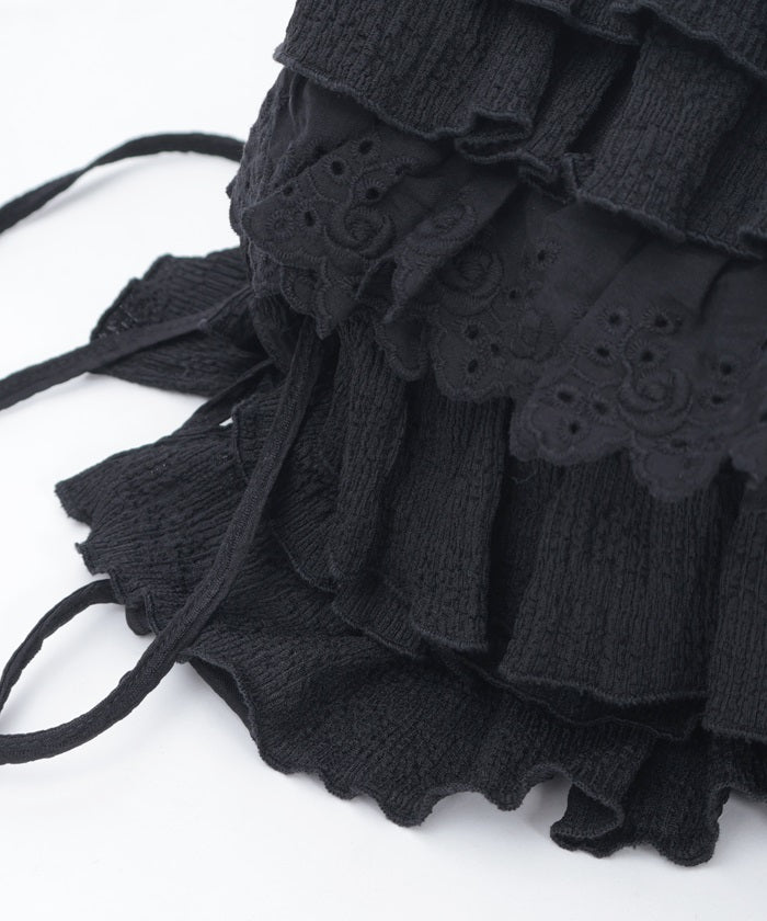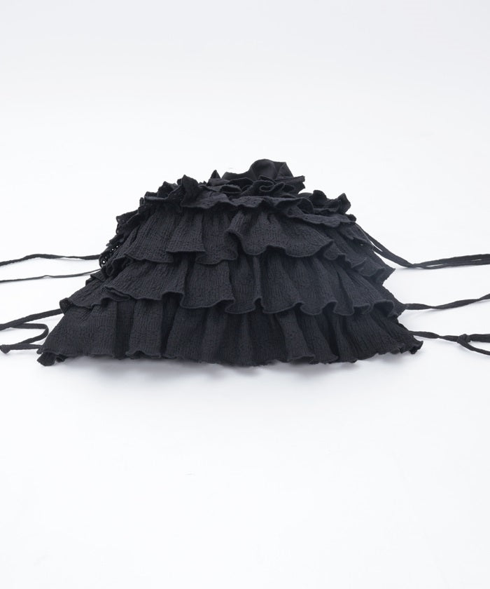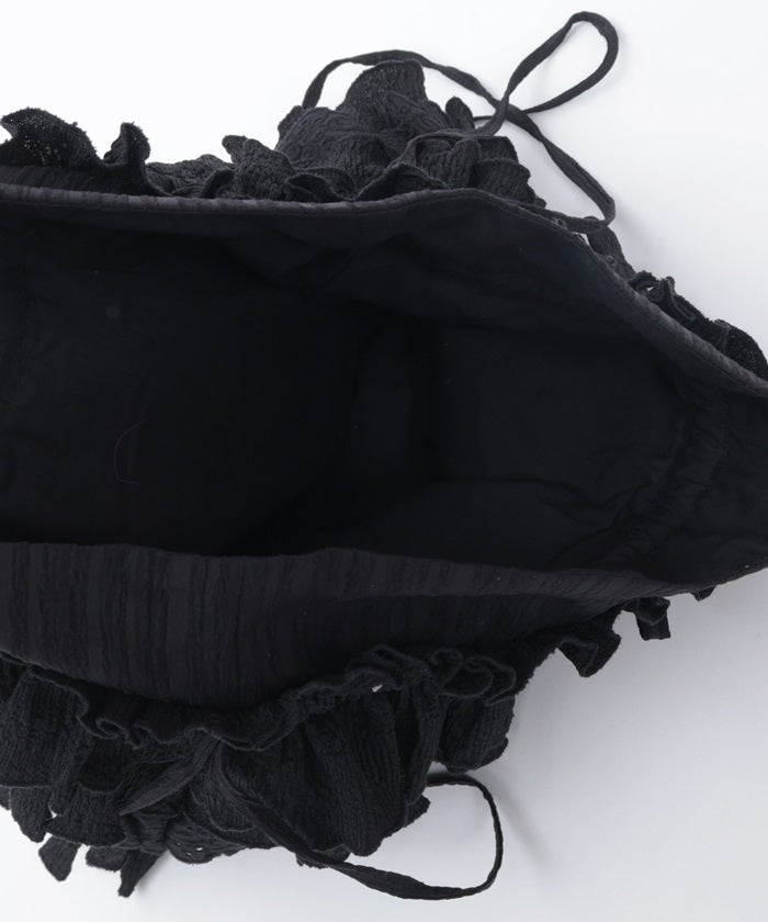 This luxurious backpack features delicate ruffles and lace layered on soft fabric. The three-dimensional gathers give it a soft volume, creating a sweet design. The rose motif adds a subtle touch. The drawstring design also offers more capacity than meets the eye.