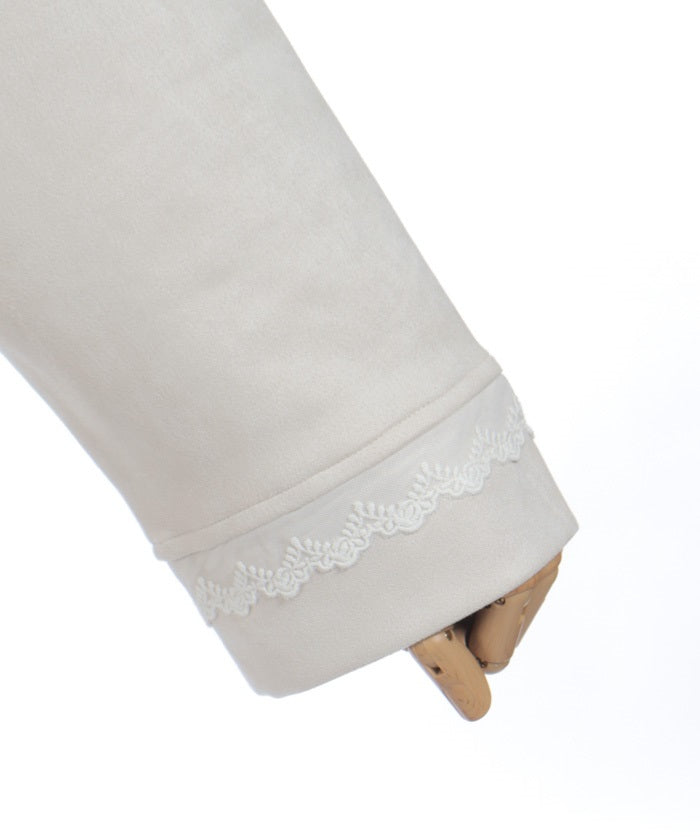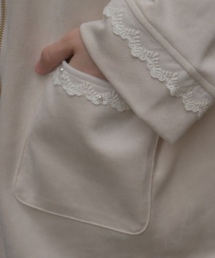The soft, flowing design creates a flowing silhouette. The large, convenient pockets and cuffs feature tulle lace accents, and the pocket openings are further accented with pearls.