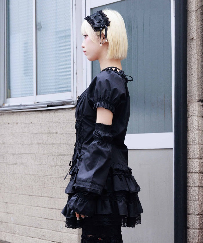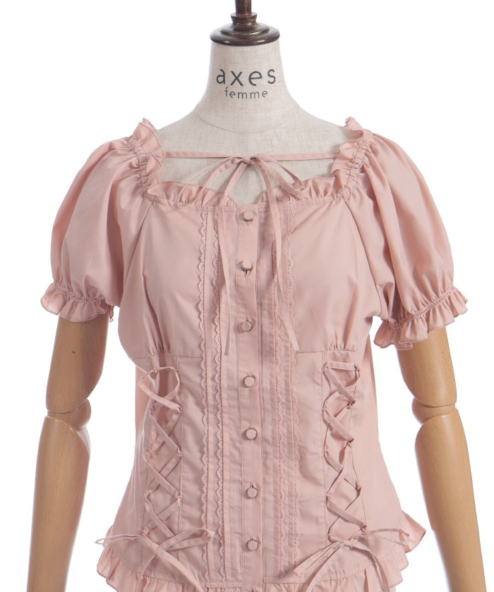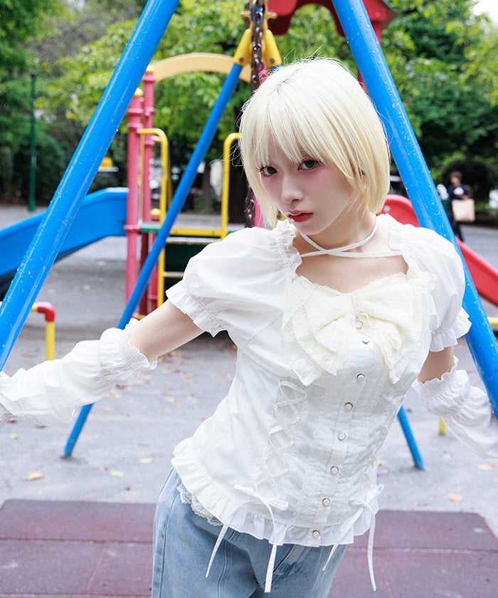Detachable sleeves allow for two-way styling, allowing it to be worn as both a short-sleeved blouse and a full-sleeved blouse. Accents like pintucks and lace-up details at the chest add a delicate and elegant touch. The ruffles and ribbon at the hem enhance the girly appeal.