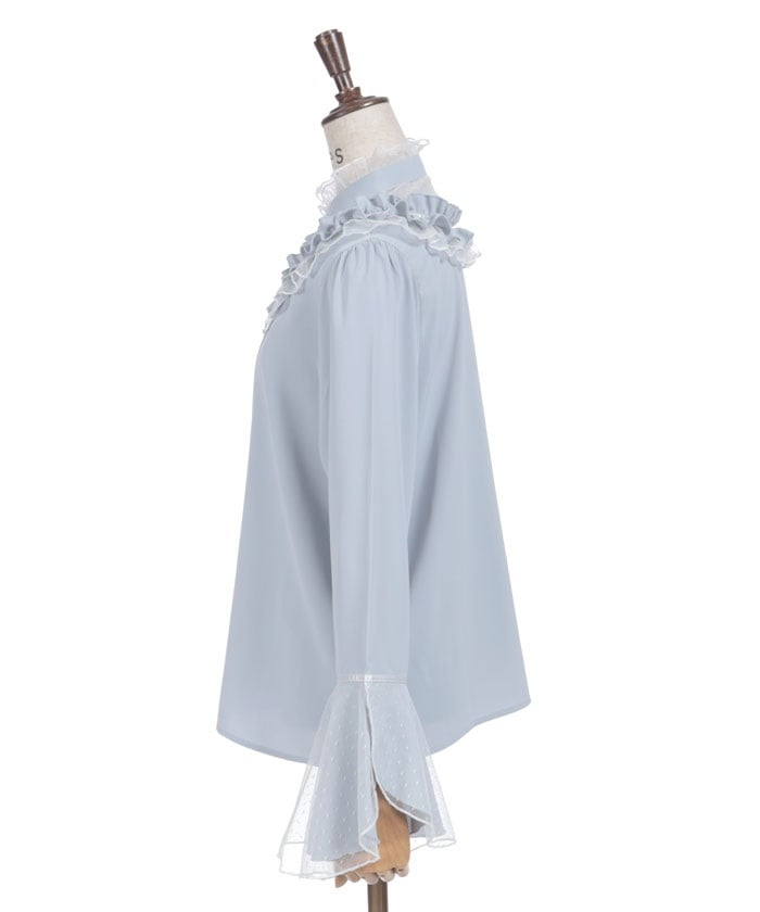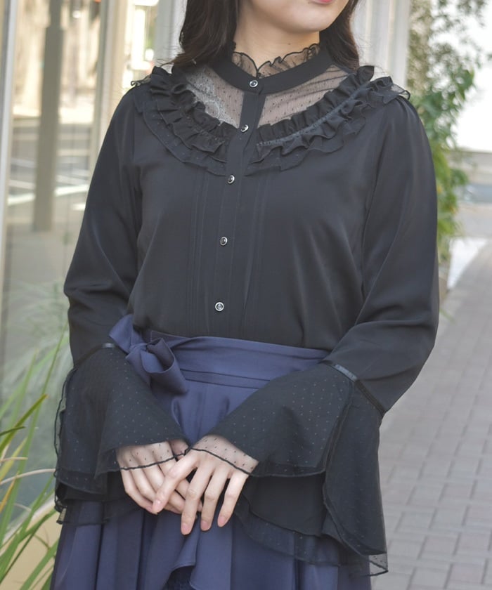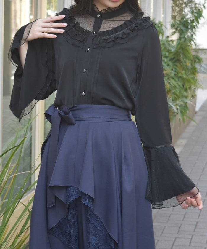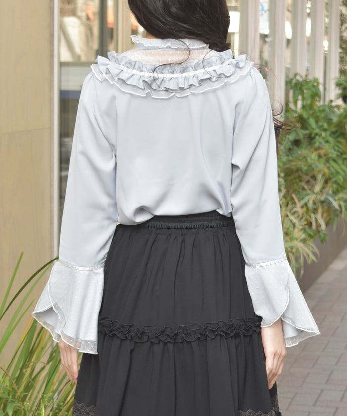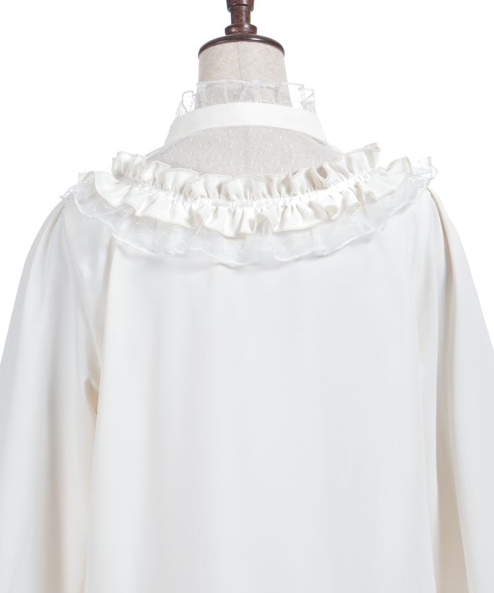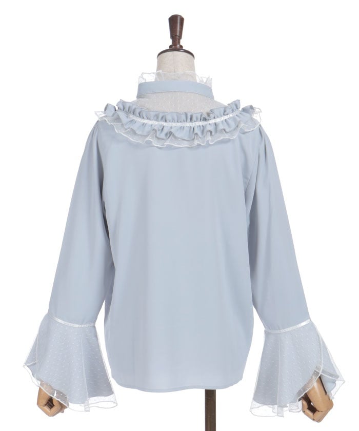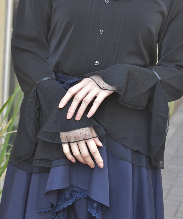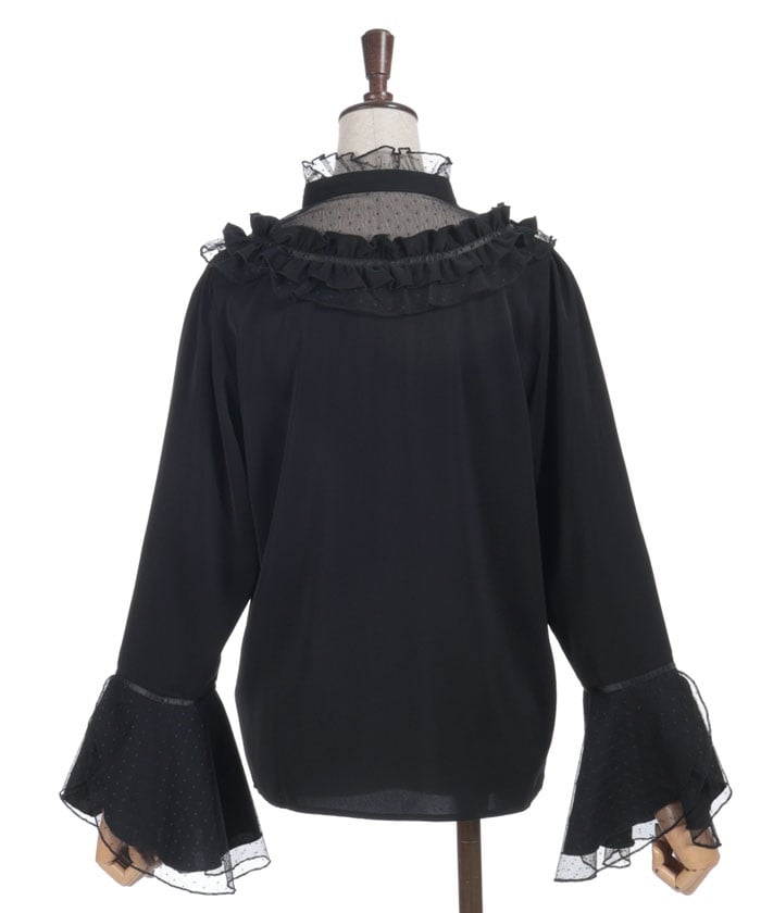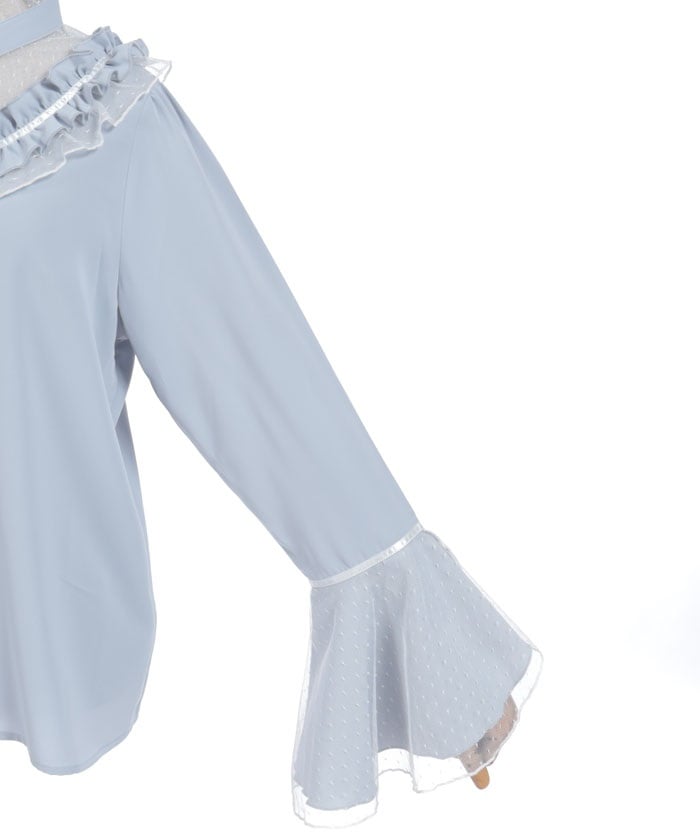 This feminine princess-sleeve blouse features overlapping dotted tulle.