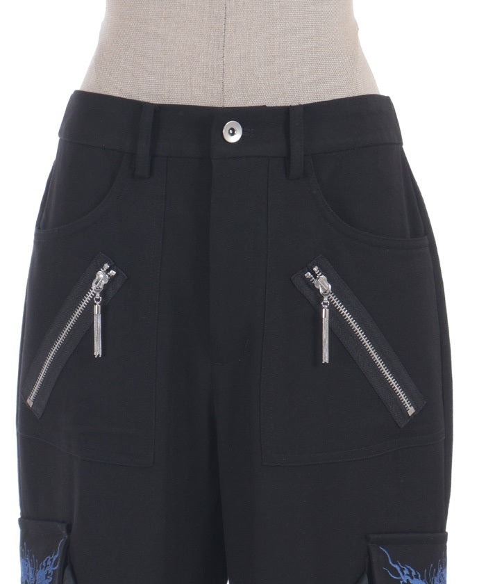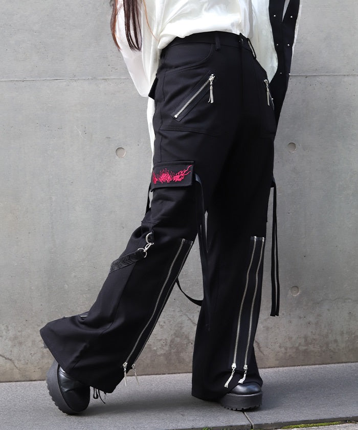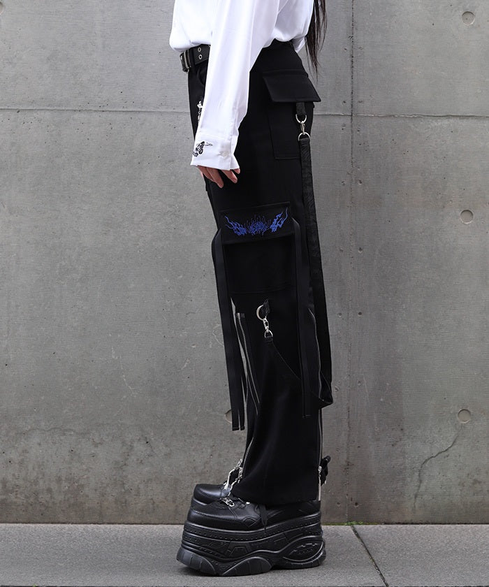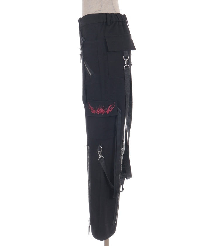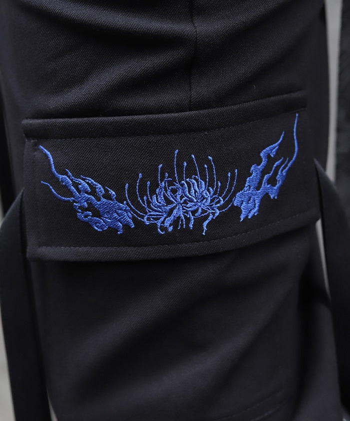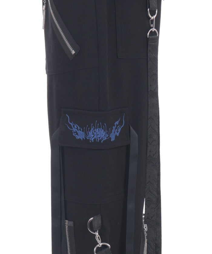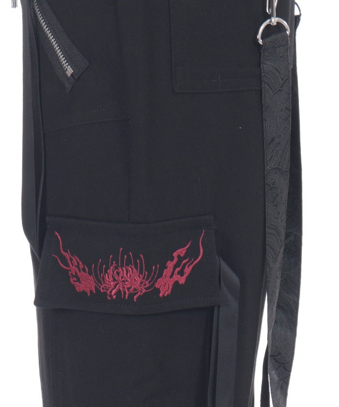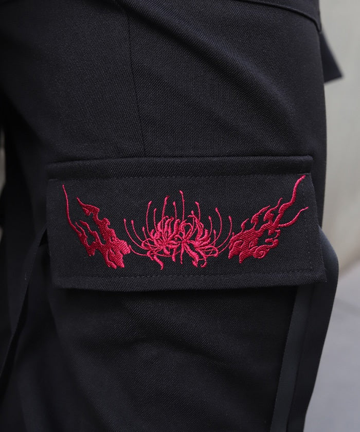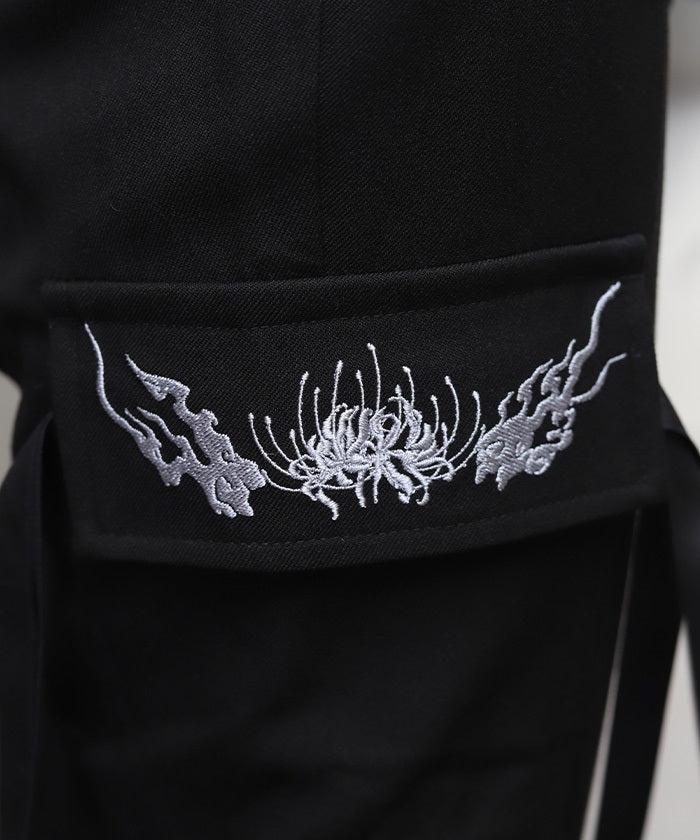The cargo pockets feature embroidered red spider lilies and will-o'-the-wisp designs on the flaps, with double straps on both ends.