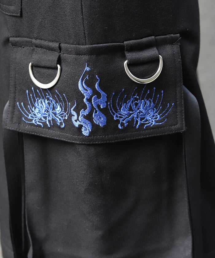 The upper cargo pockets feature embroidered red spider lilies and will-o'-the-wisp designs on the flaps, with double straps on both ends.
