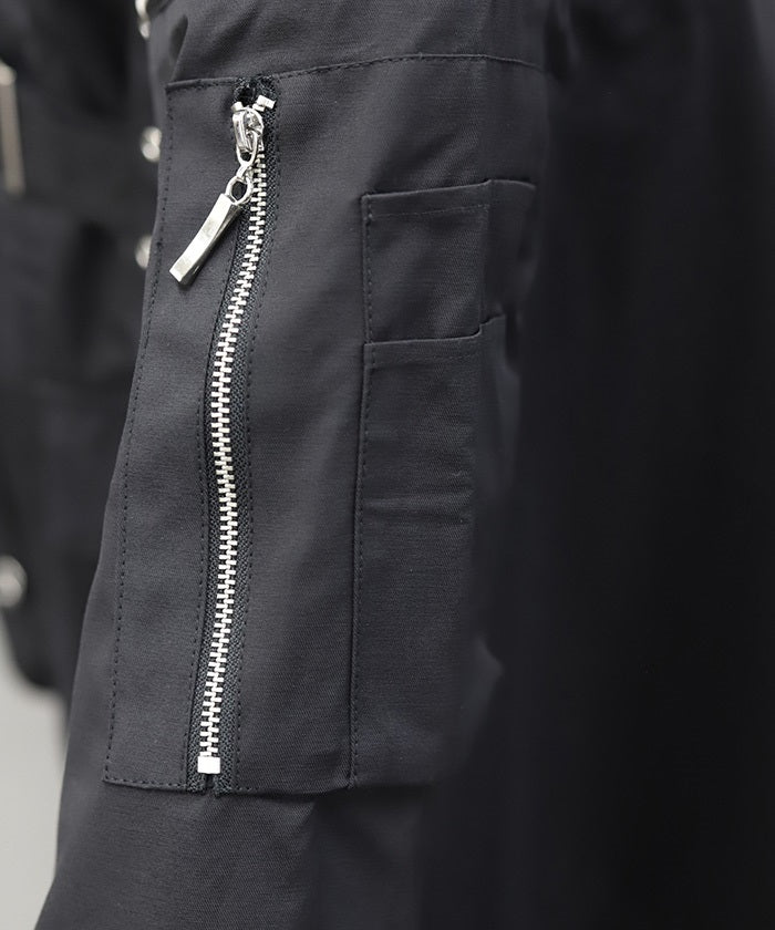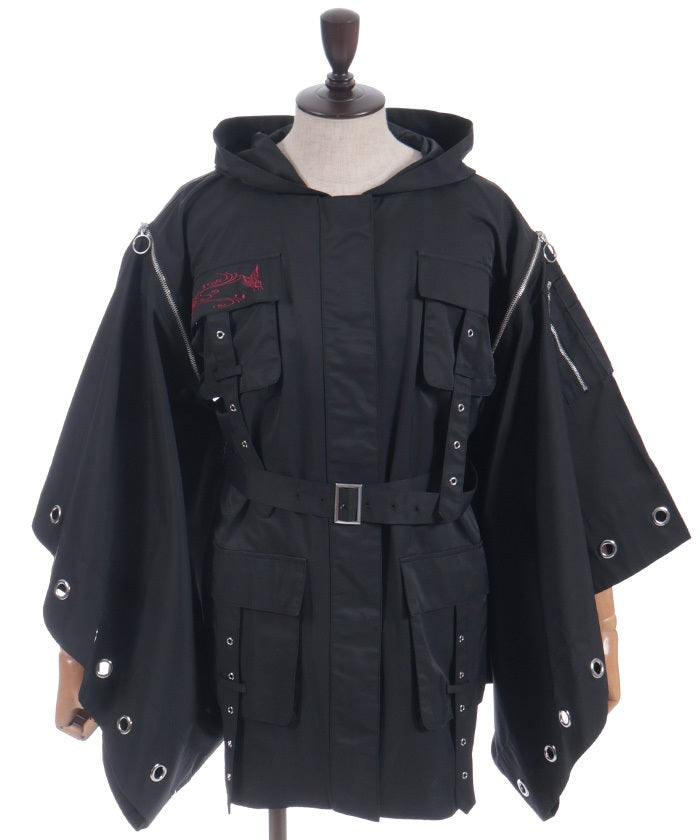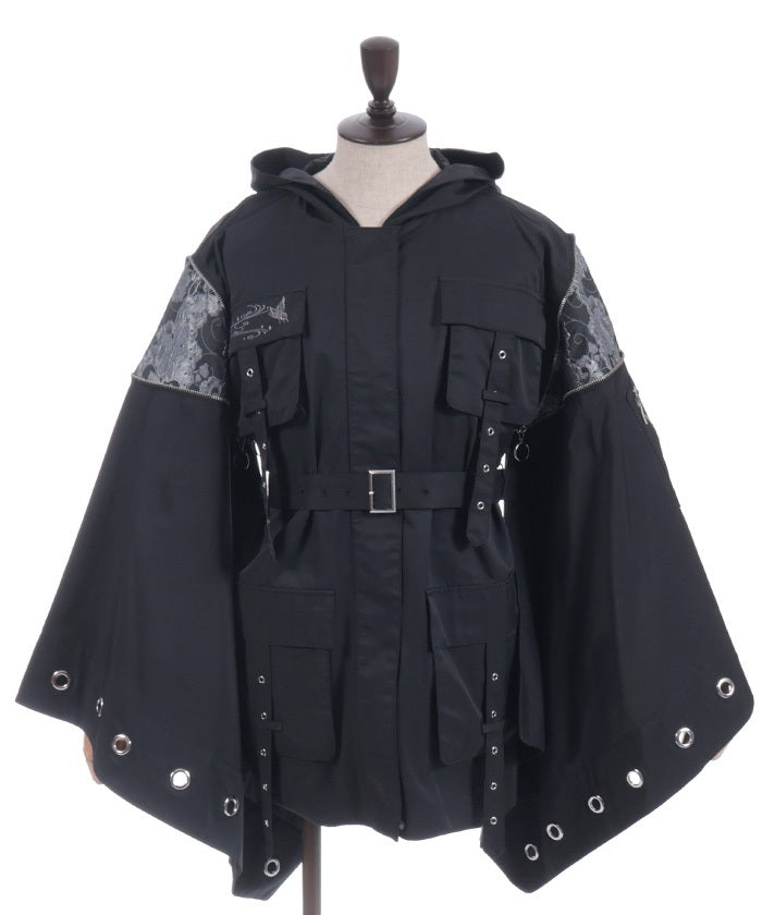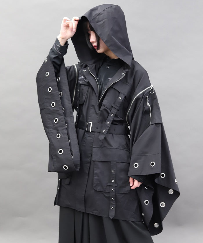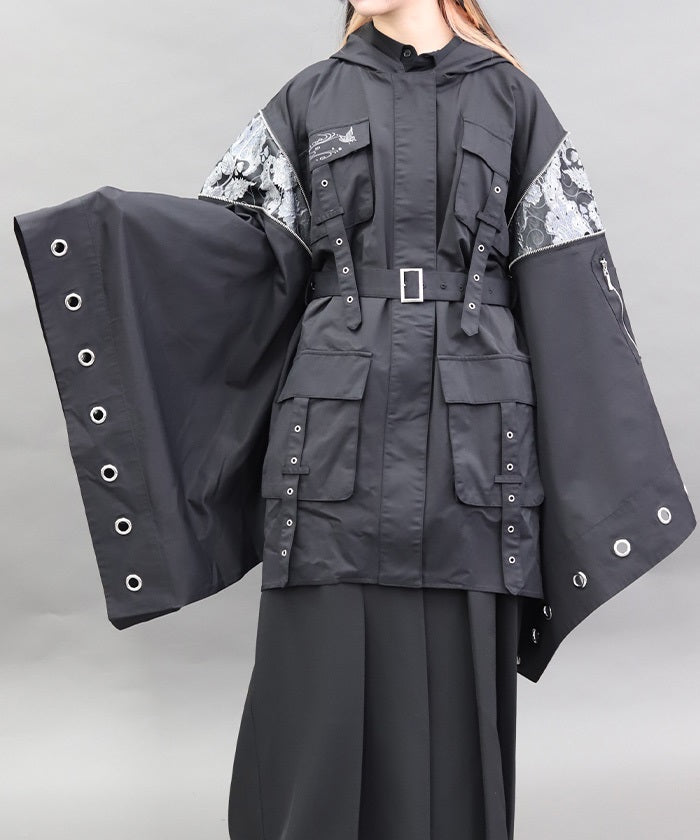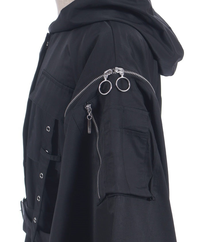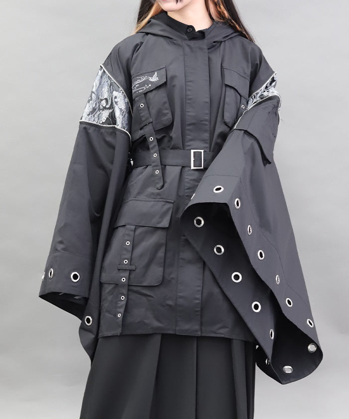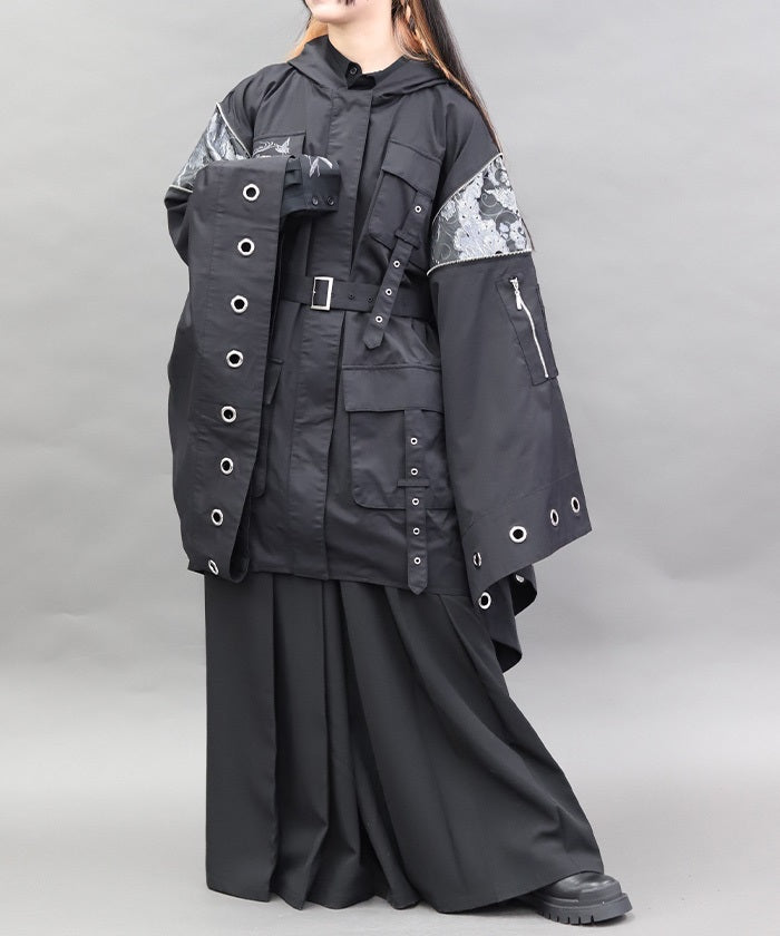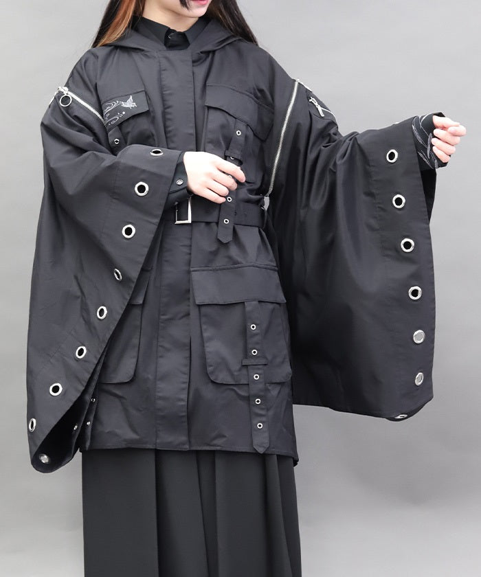 Details like cargo pockets, a belt, eyelets at the cuffs, and a cigar pocket on the sleeve, along with the crisp fabric, create a tech-inspired look.