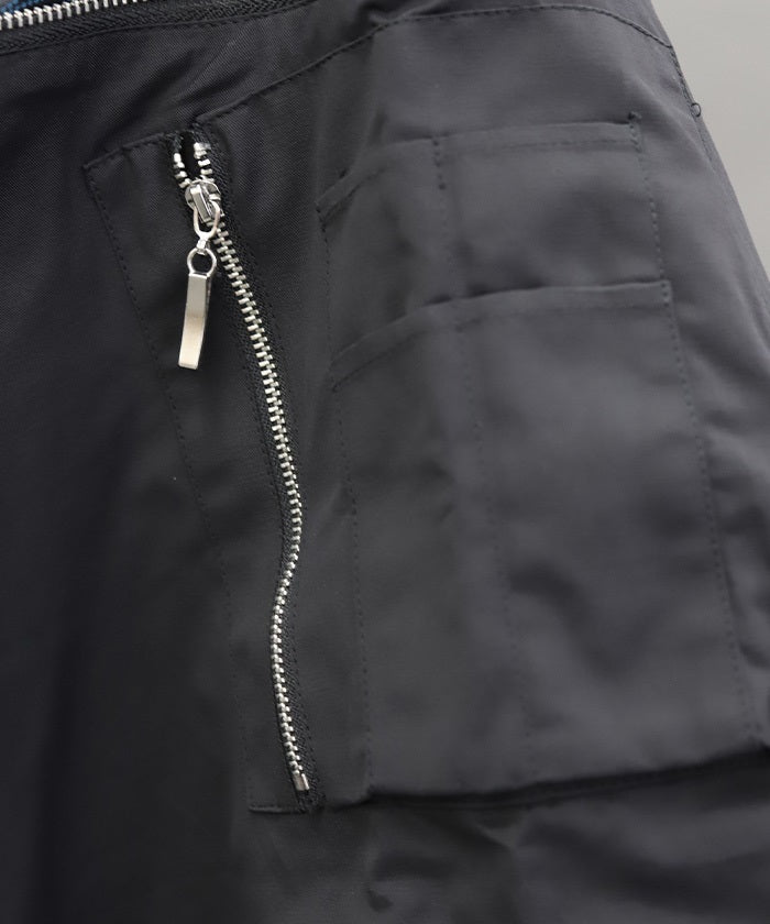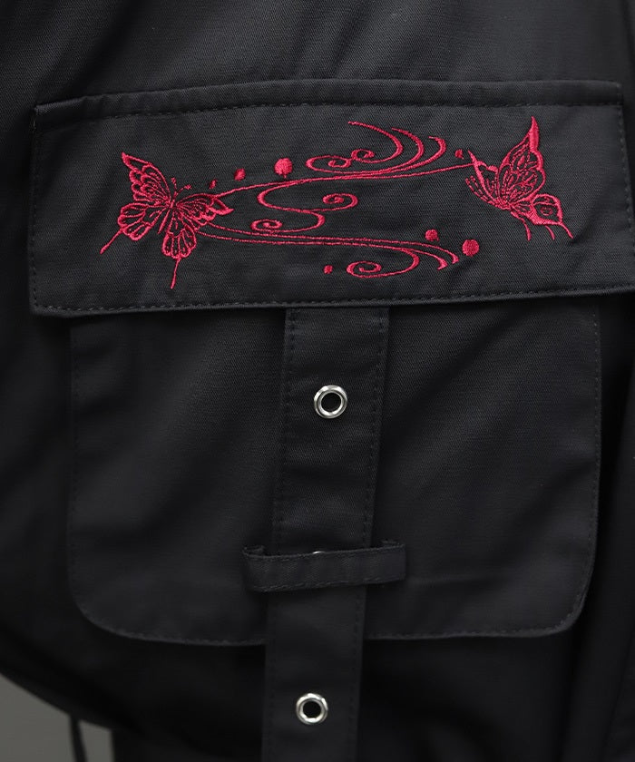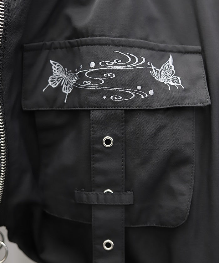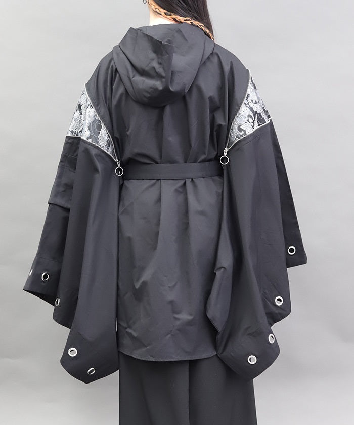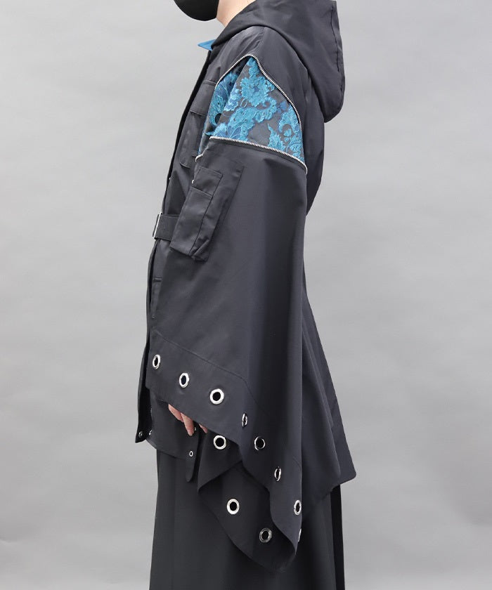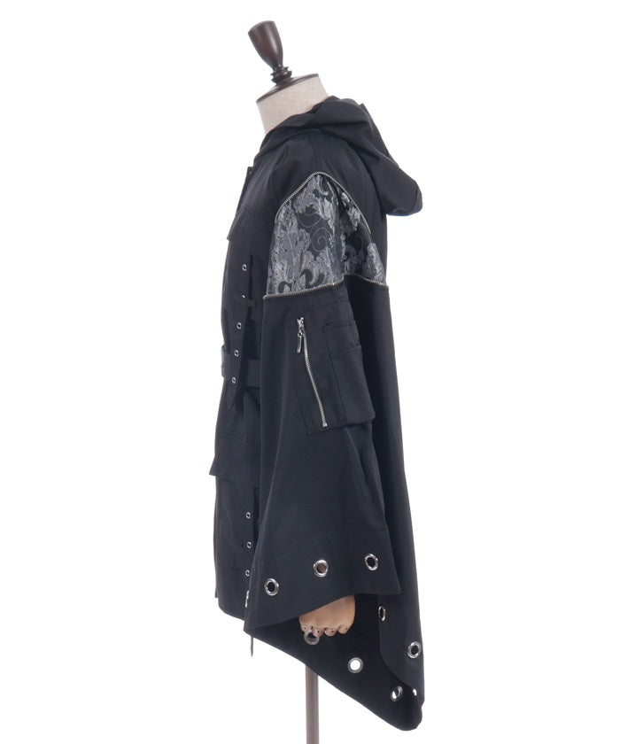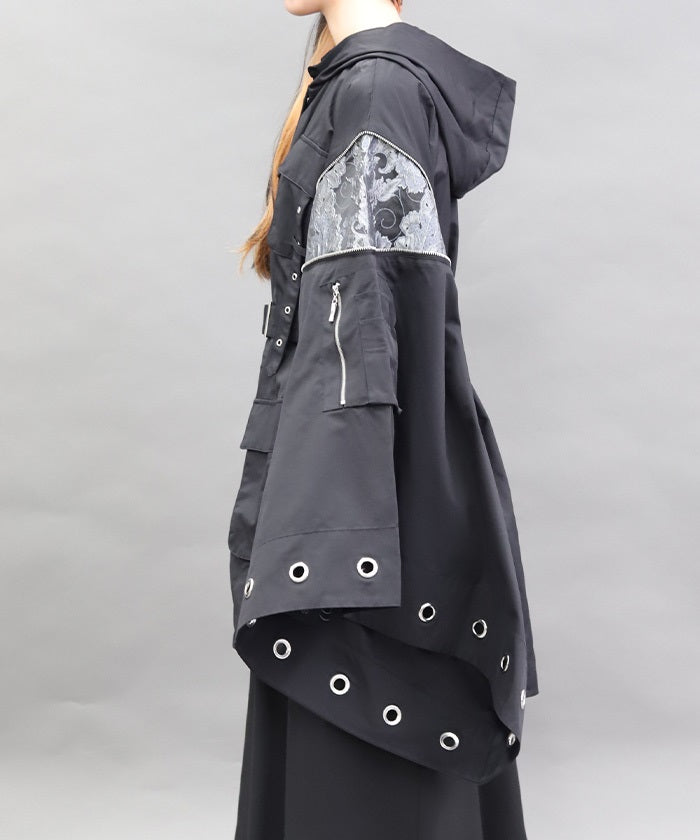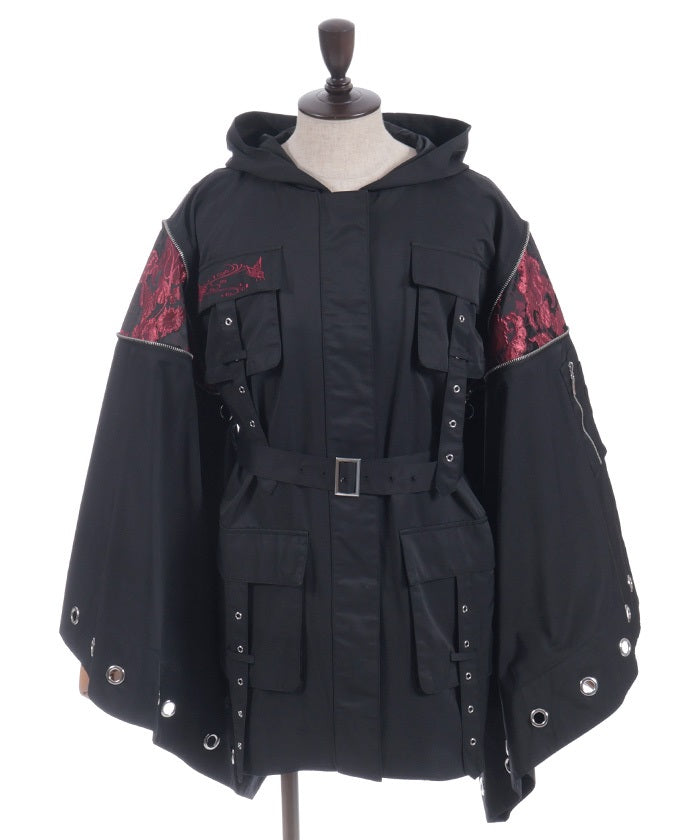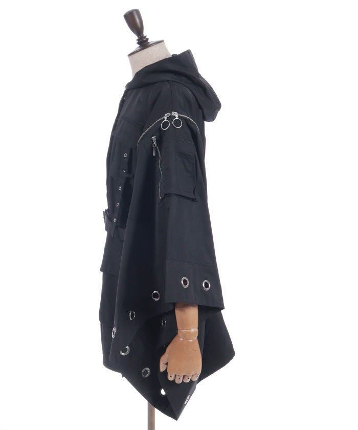 Details like cargo pockets, a belt, eyelets at the cuffs, and a cigar pocket on the sleeve, along with the crisp fabric, create a tech-inspired look.