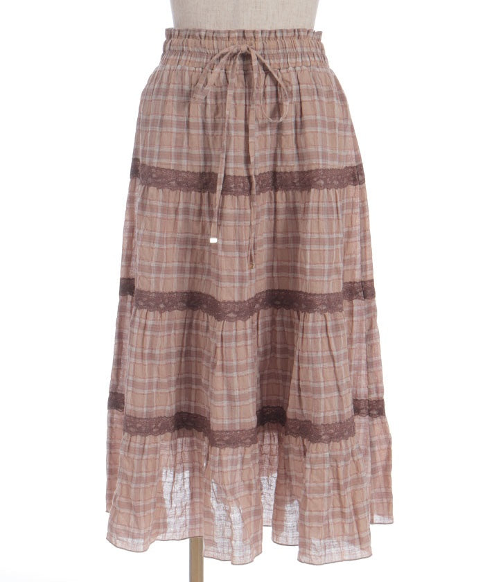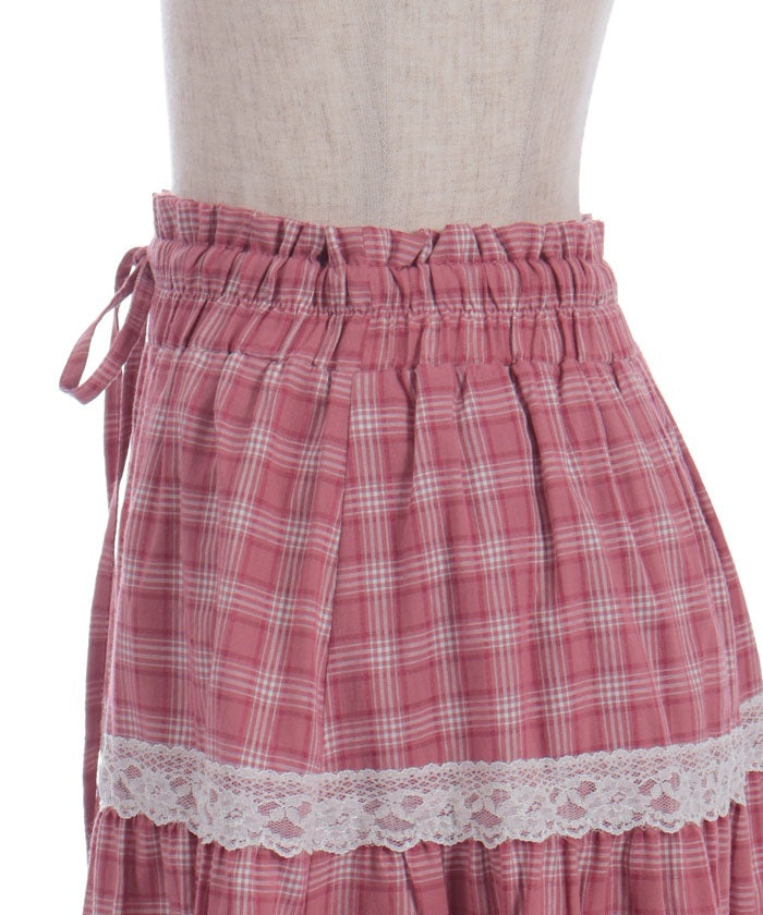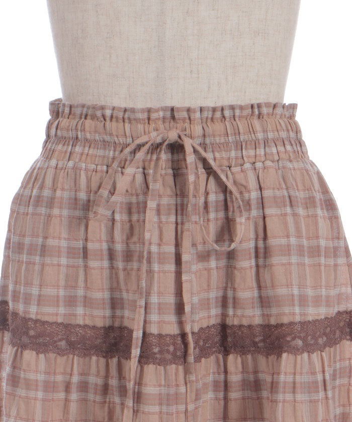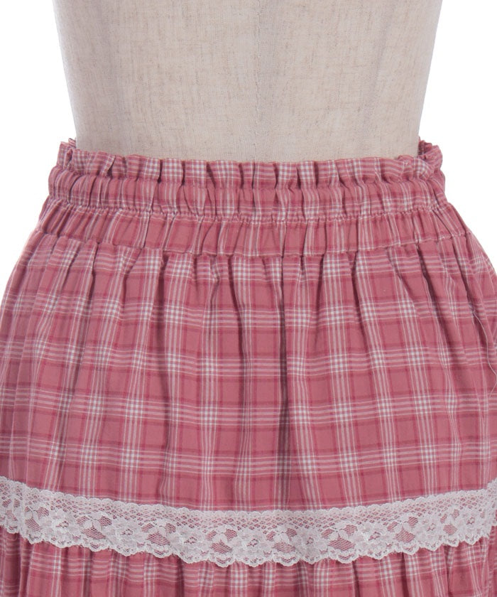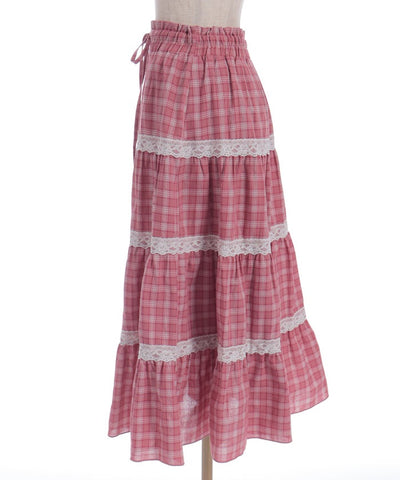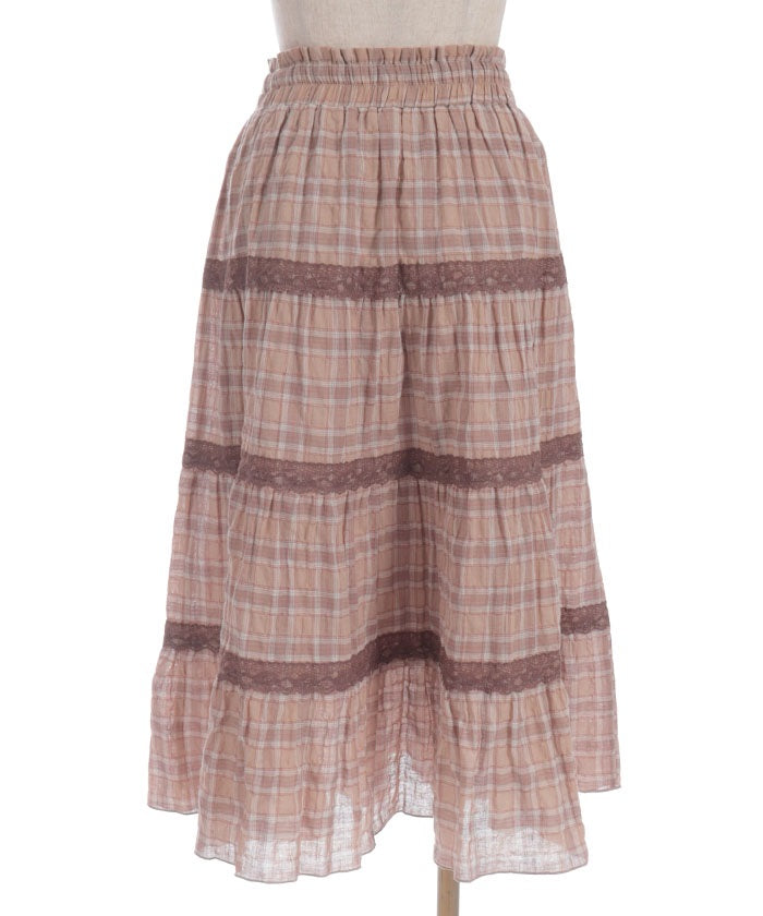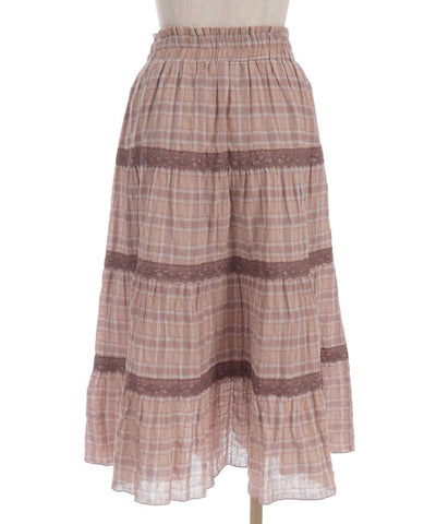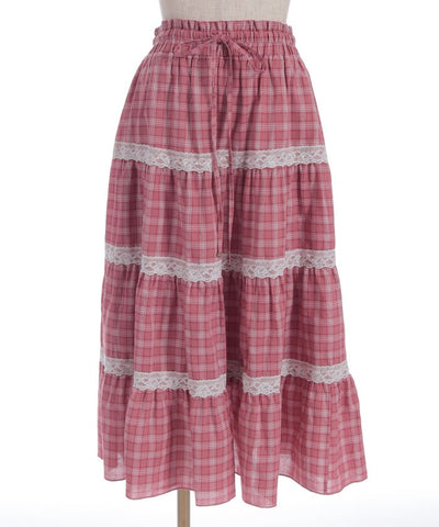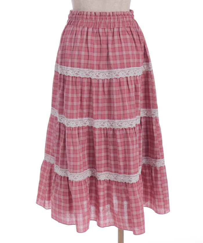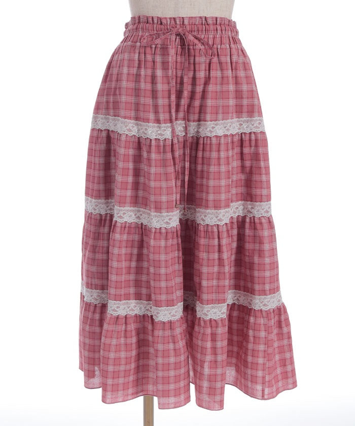 The tiered seams are decorated with lace, and the silhouette sways softly with every movement. The elastic waist makes it comfortable to wear. With its hem length not too long, you can play around with various tastes in socks and shoes. Available in a geek-chic plaid and a soft floral pattern.