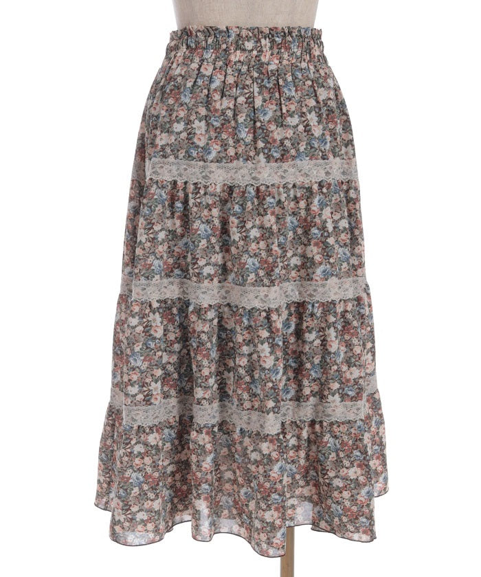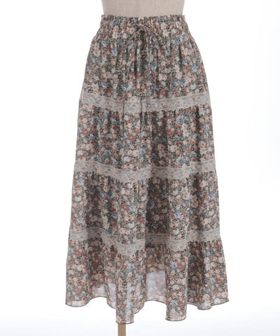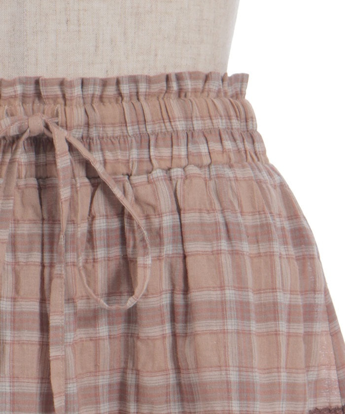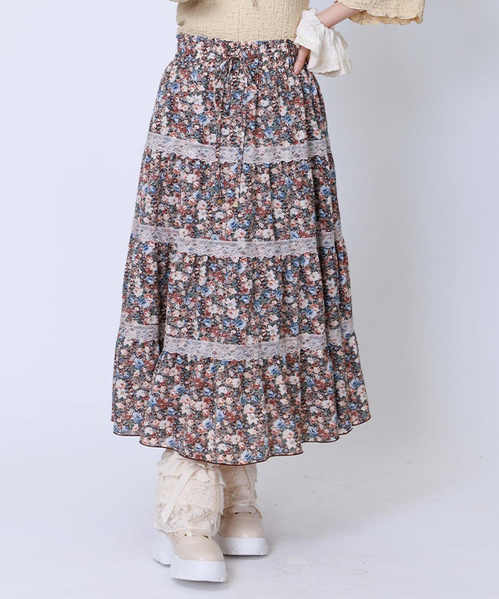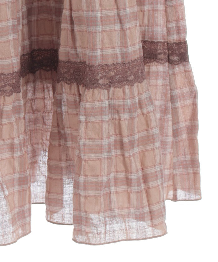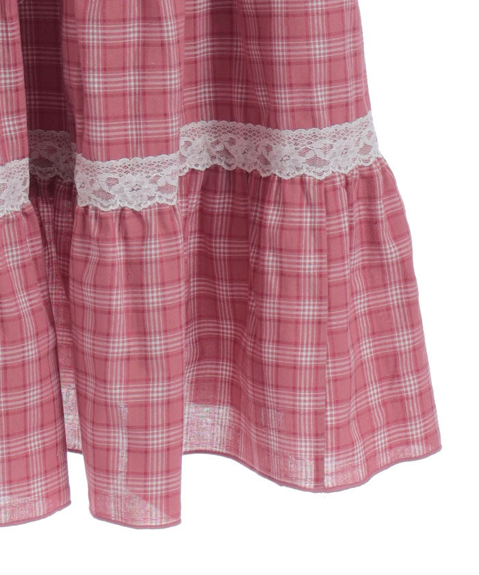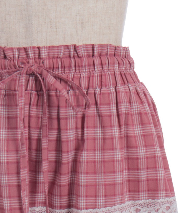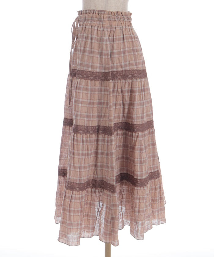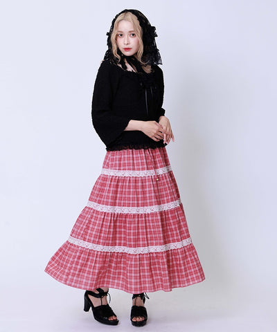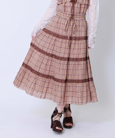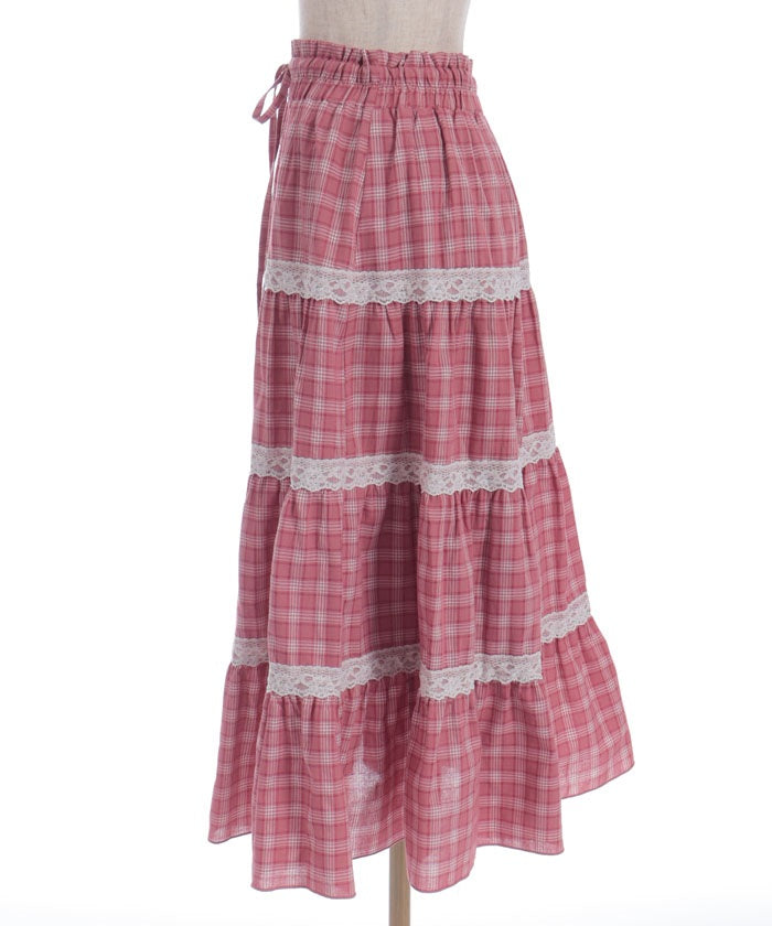 The tiered seams are decorated with lace, and the silhouette sways softly with every movement. The elastic waist makes it comfortable to wear. With its hem length not too long, you can play around with various tastes in socks and shoes. Available in a geek-chic plaid and a soft floral pattern.