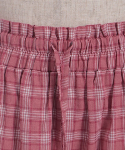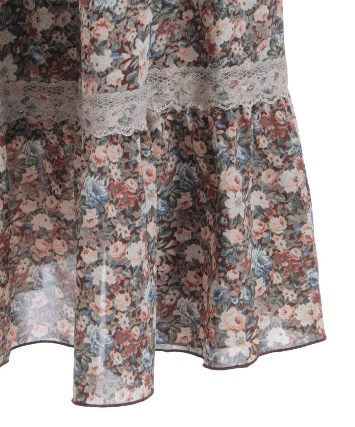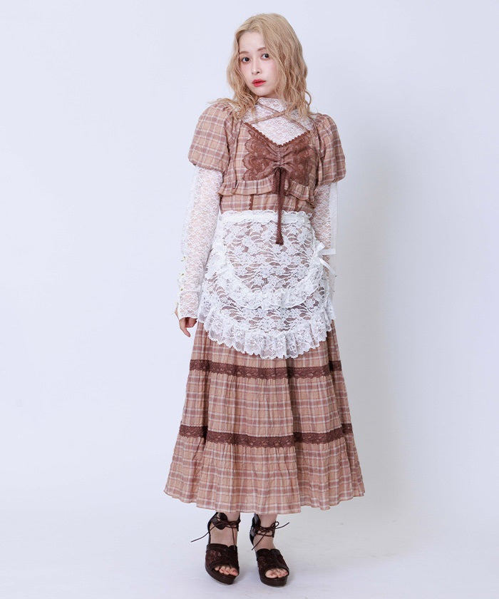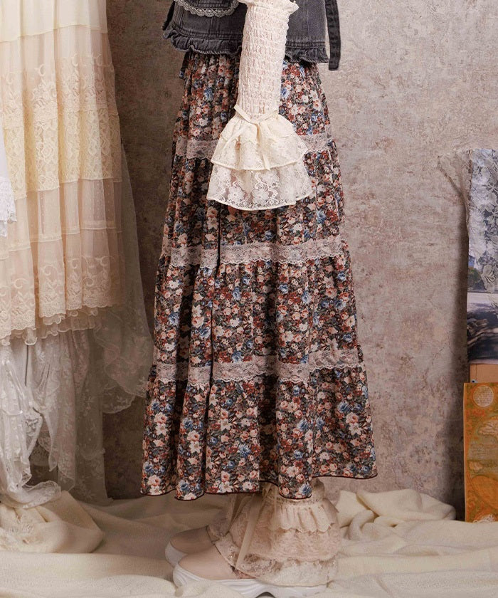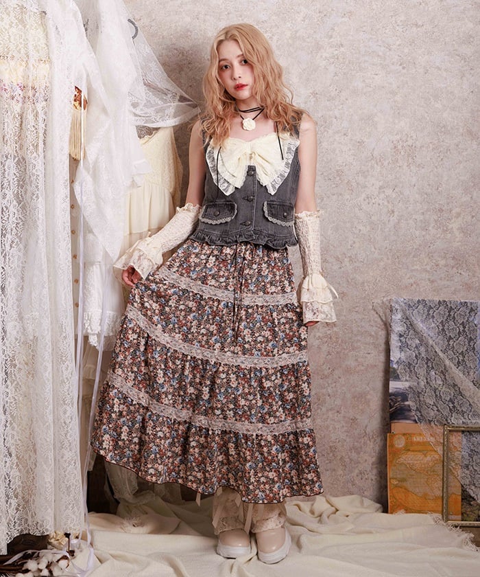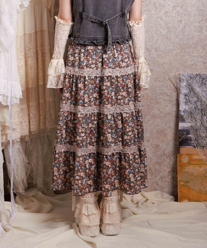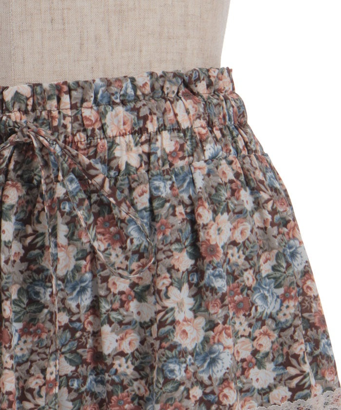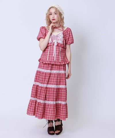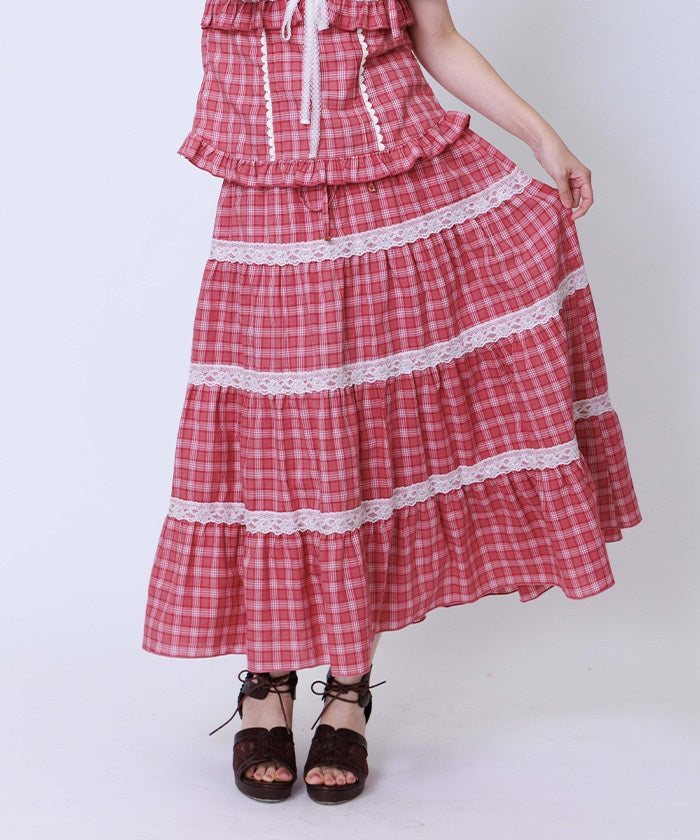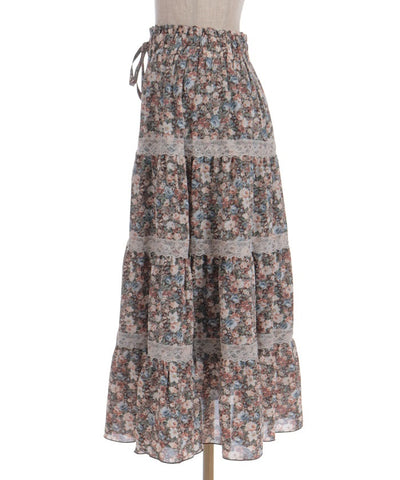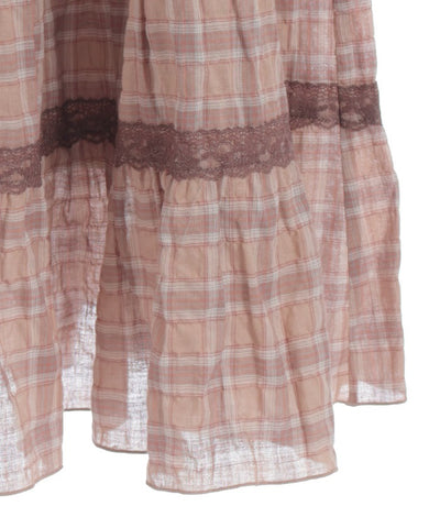 The tiered seams are decorated with lace, and the silhouette sways softly with every movement. The elastic waist makes it comfortable to wear. With its hem length not too long, you can play around with various tastes in socks and shoes. Available in a geek-chic plaid and a soft floral pattern.