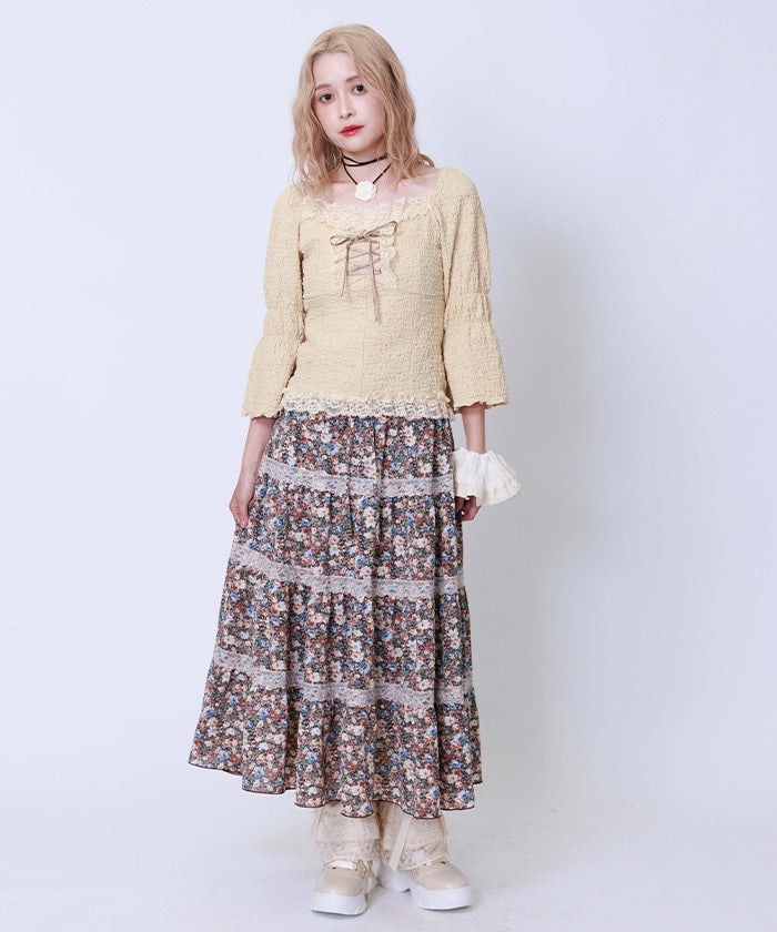 A skirt with a captivating nostalgic atmosphere. With a design hardly too sweet, this piece lends well to natural feminine stylings.