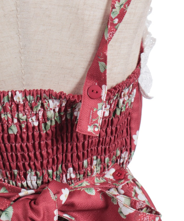 The cotton lace at the neckline has plenty of gathers, and is decorated in the middle with floral lace. The back is shirred for easy on and off.
