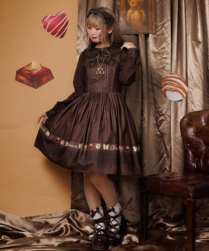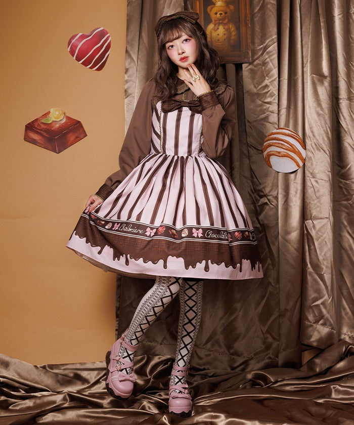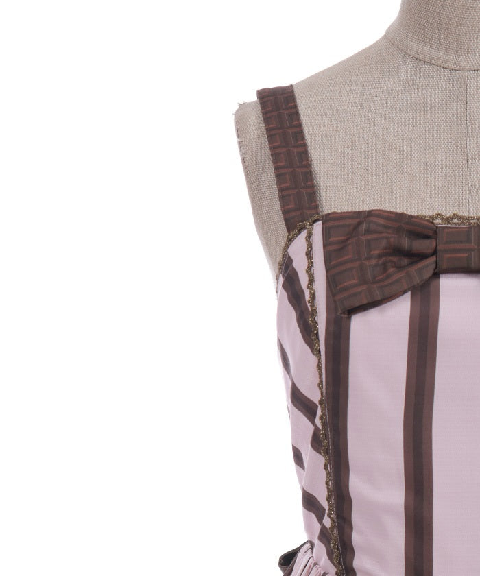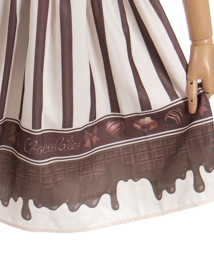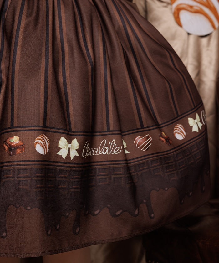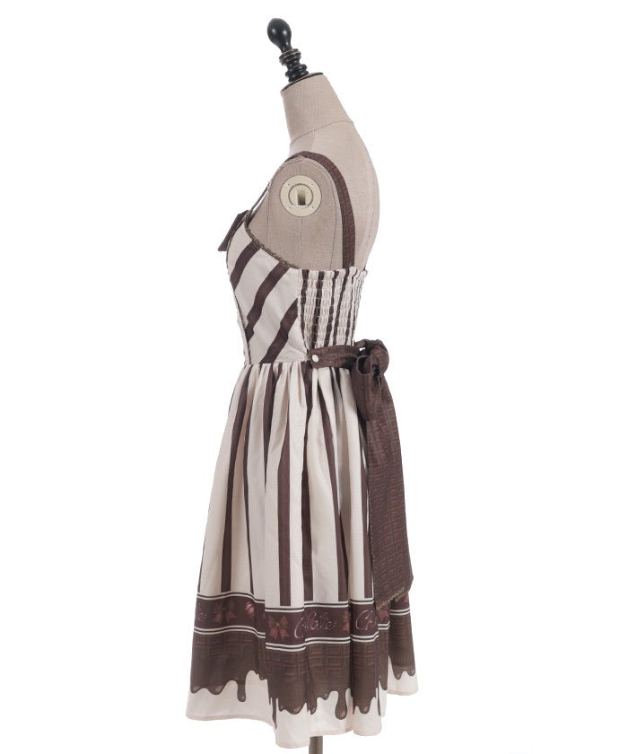The hemline is surrounded by prints of bonbons, chocolate bars, and melted chocolate. The striped pattern keeps the sweetness in check, resulting in a subtly more mature design. The ribbons at the chest and back waist feature a chocolate bar pattern.