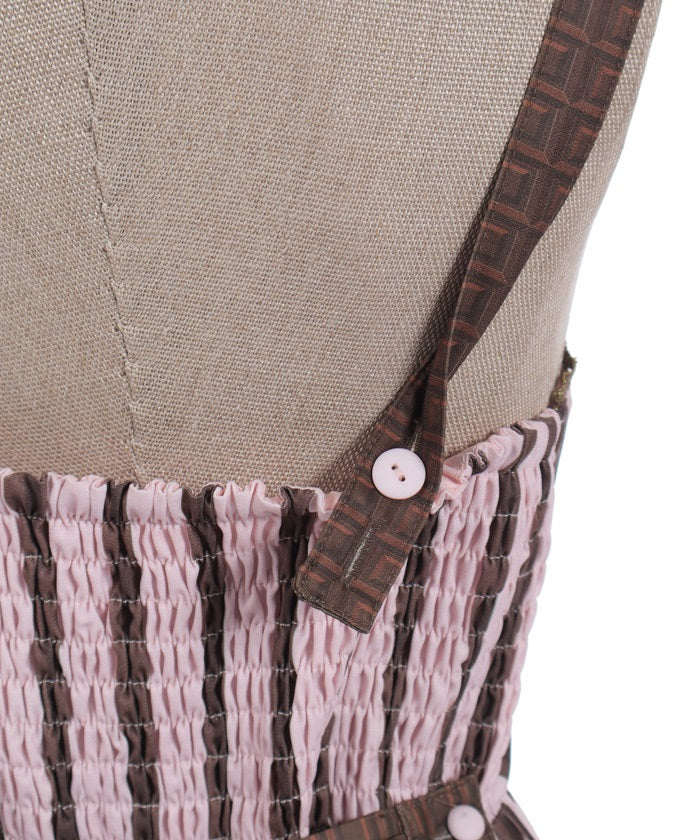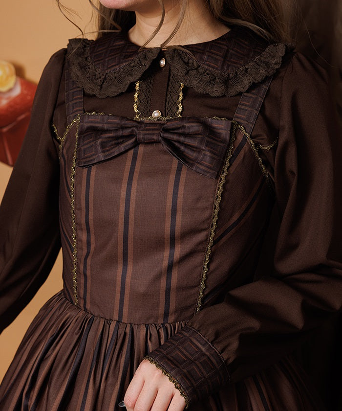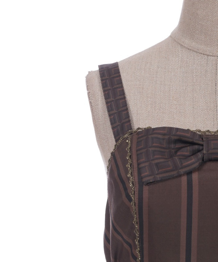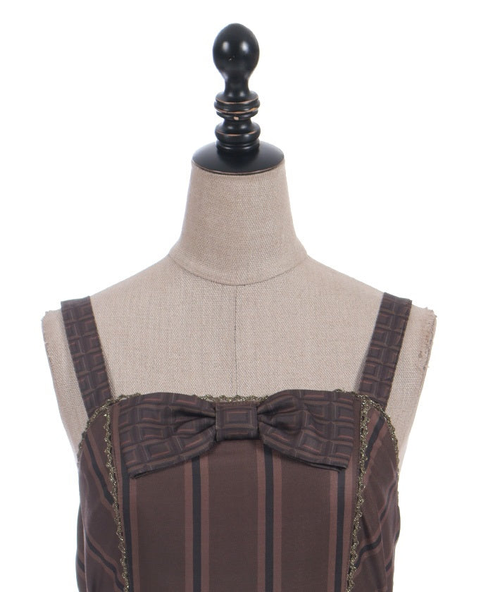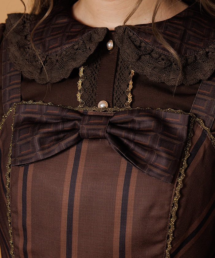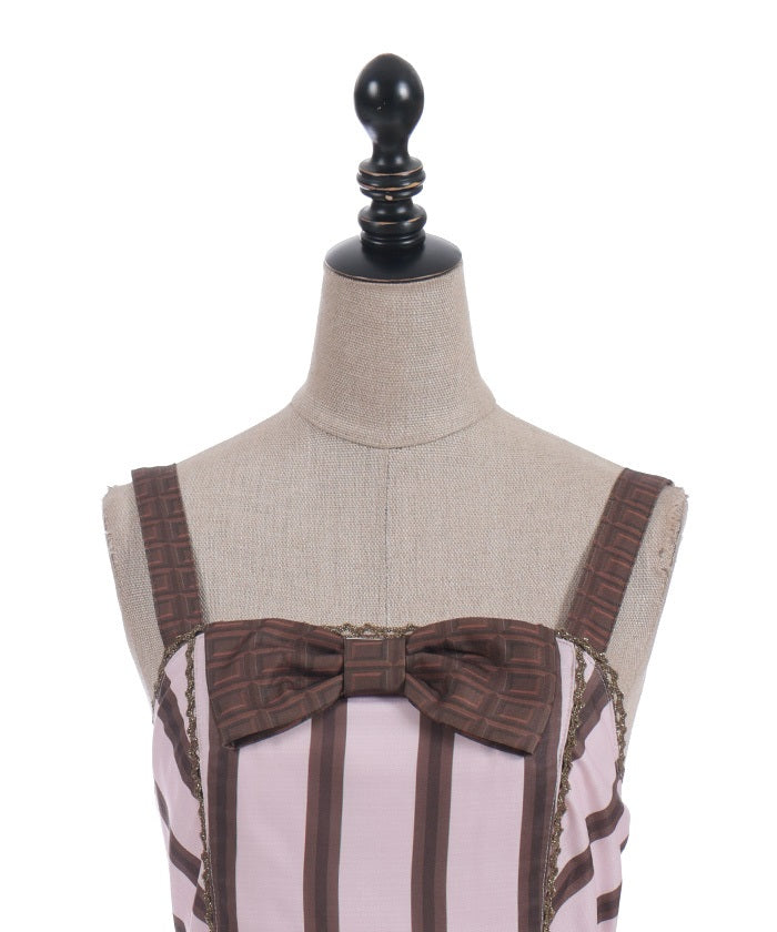 The hemline is surrounded by prints of bonbons, chocolate bars, and melted chocolate. The striped pattern keeps the sweetness in check, resulting in a subtly more mature design. The ribbons at the chest and back waist feature a chocolate bar pattern.