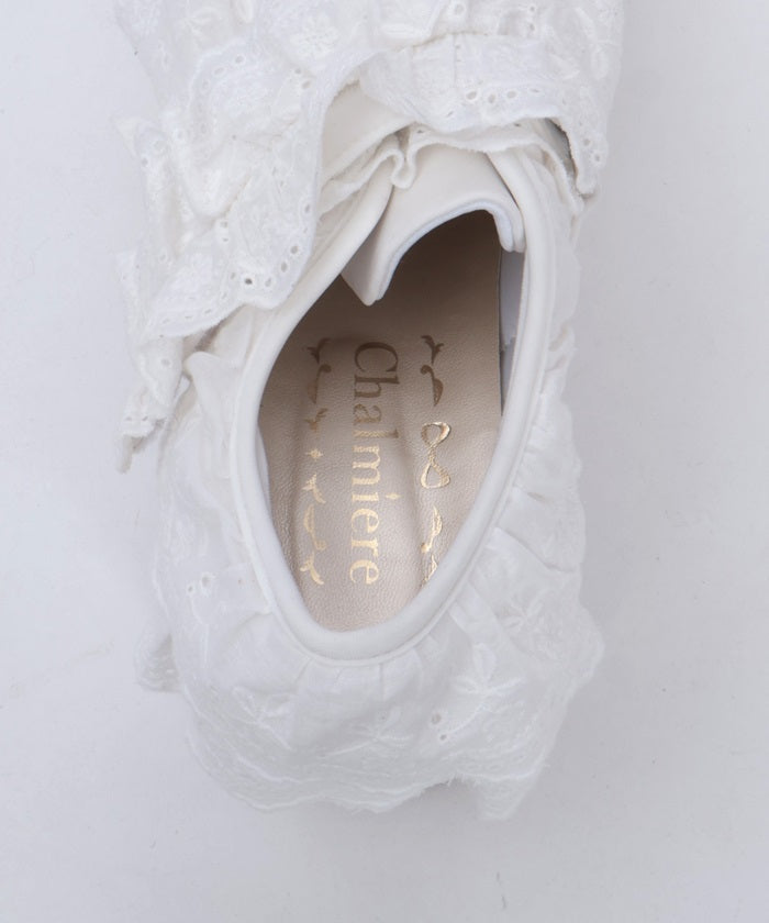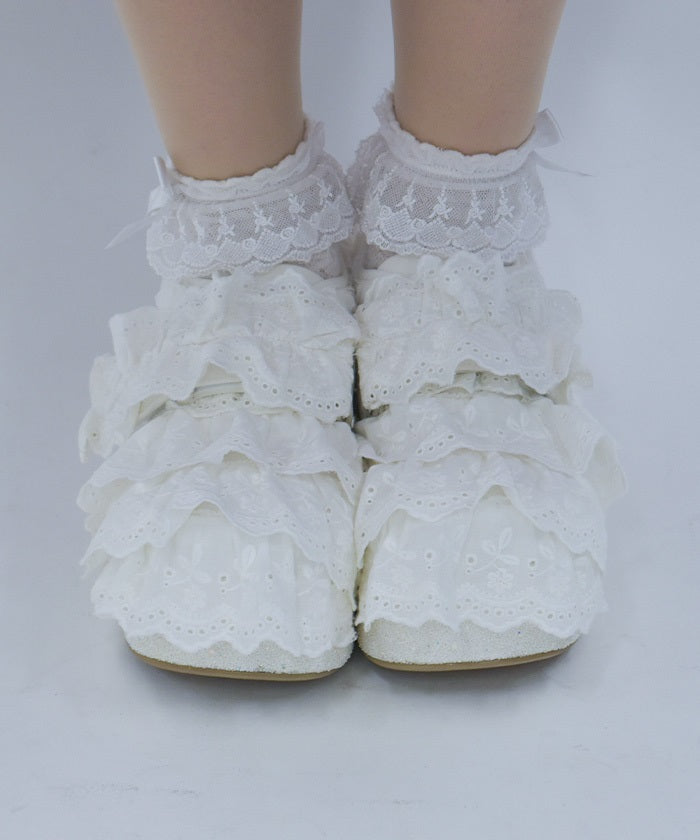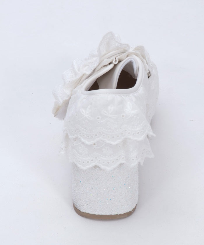 These shoes feature lots and lots of gathered cotton lace frills. The soles are adorned with sparkling white glitter. The Velcro closure makes them easy to put on and take off!