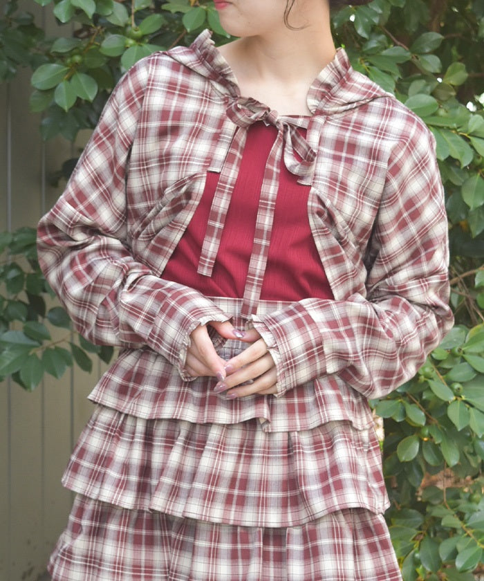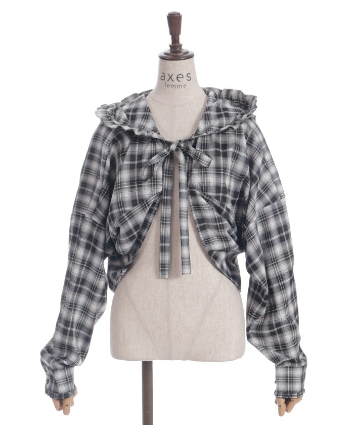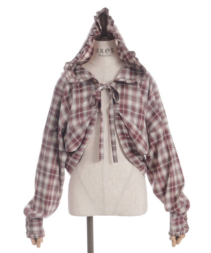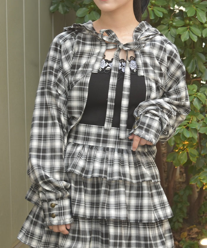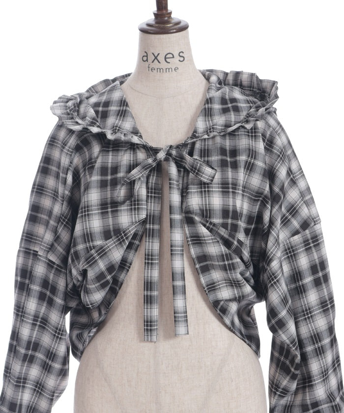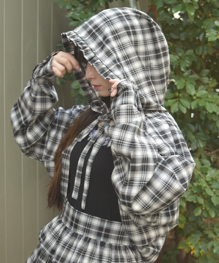 The compact length creates a clean, streamlined look around the waist, while the ribbon tie and hood add a cute accent. The geeky check pattern is both classic and trendy, elevating your look.