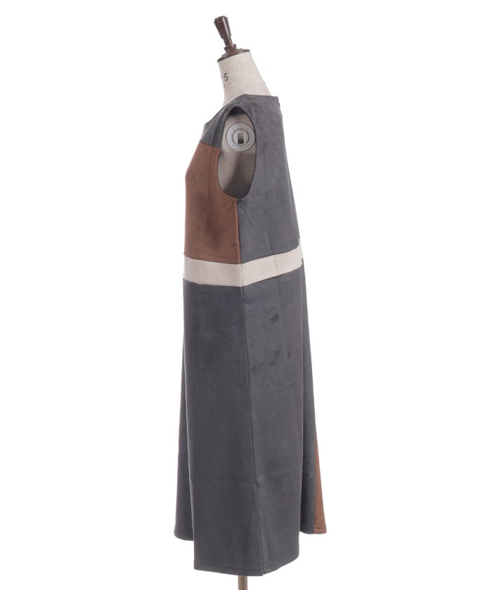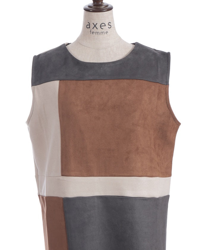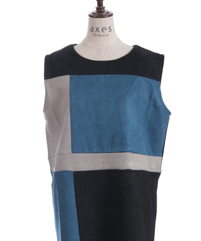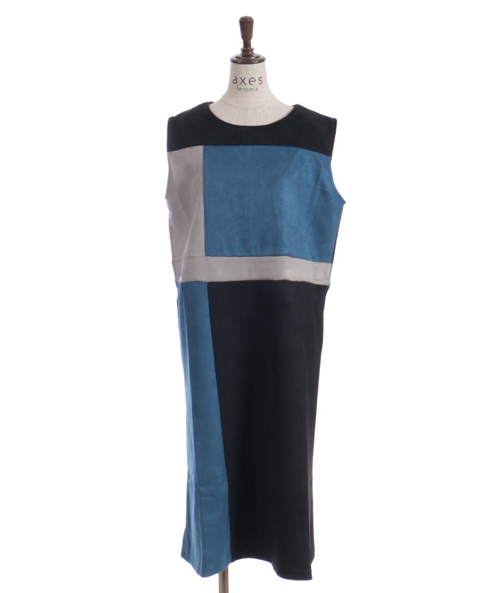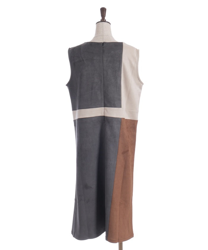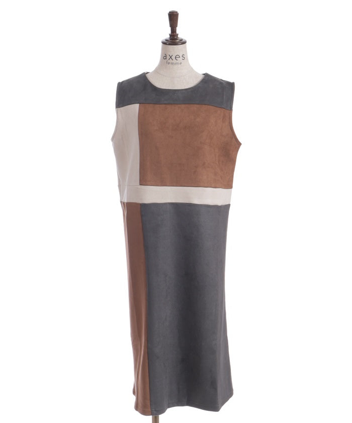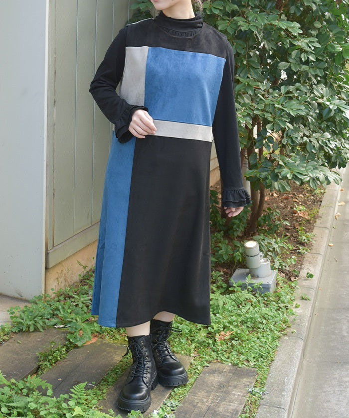 A dress with a color-block design made from suede-like fabric. The contrasting color combinations create a simple yet striking style.