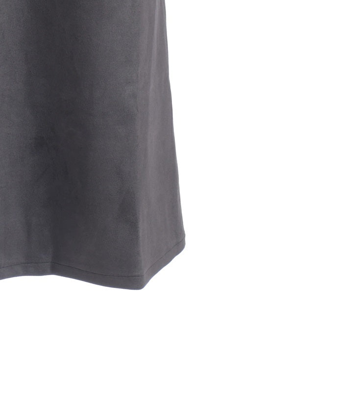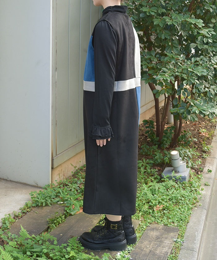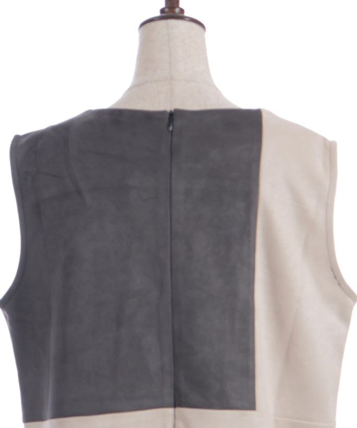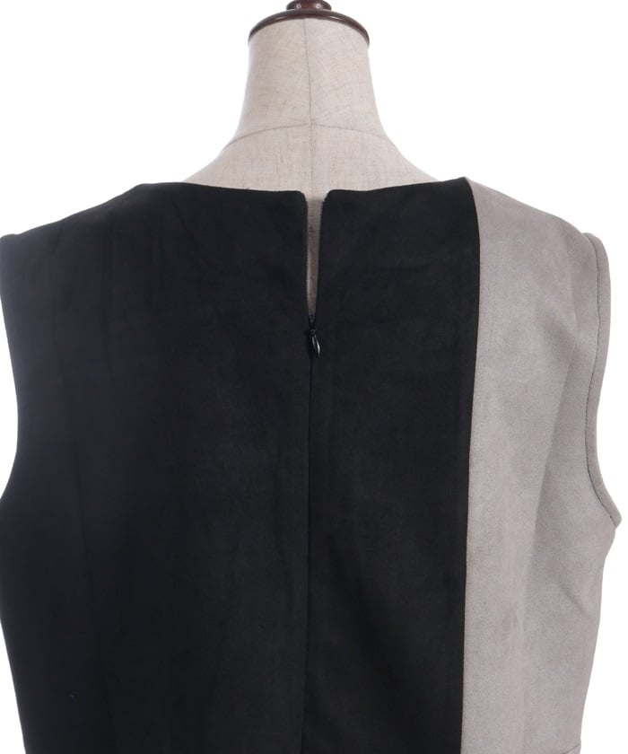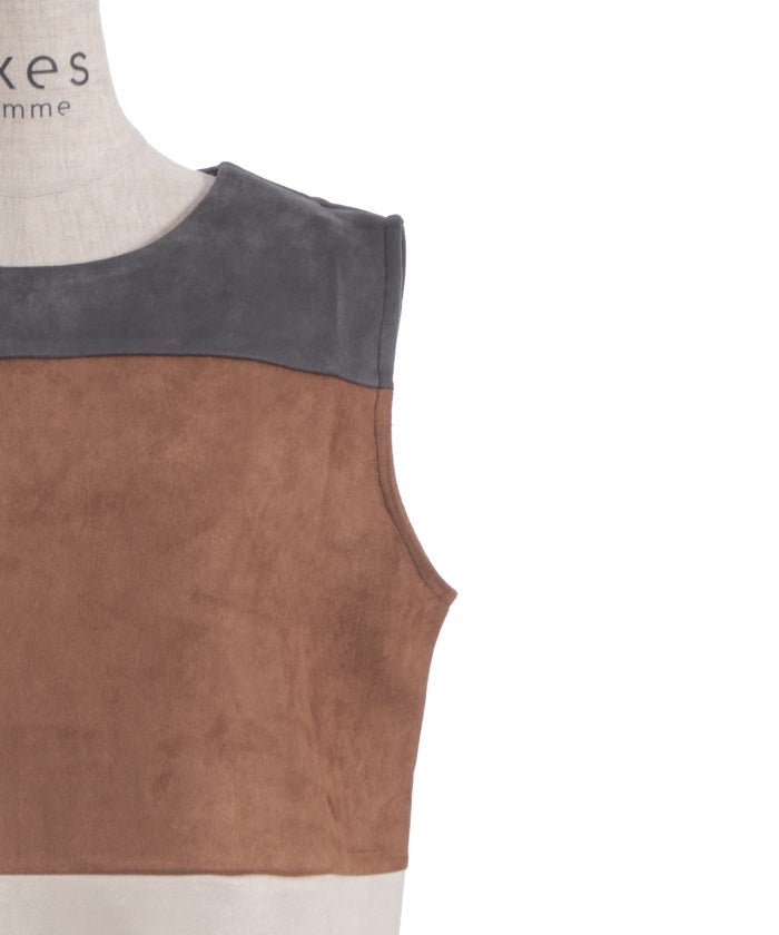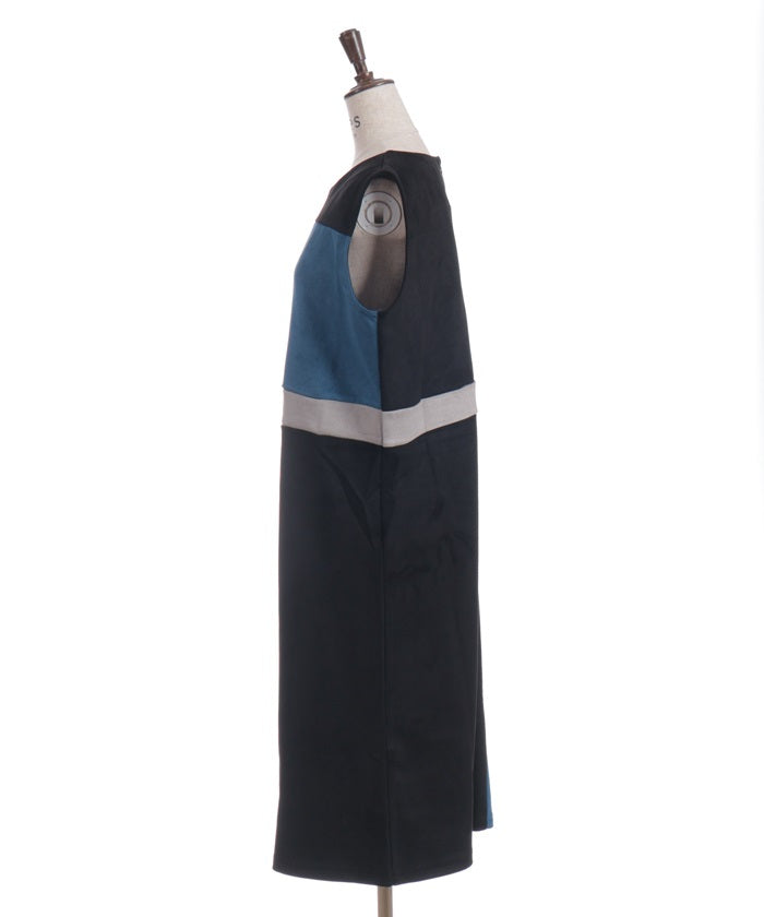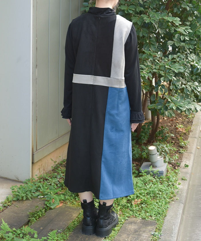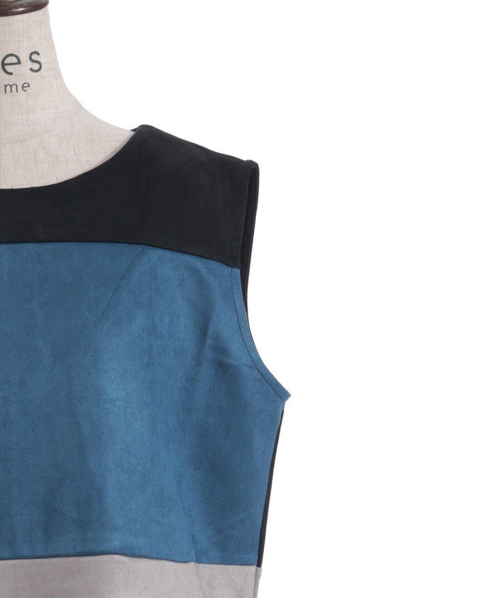 A dress with a color-block design made from suede-like fabric. The contrasting color combinations create a simple yet striking style.