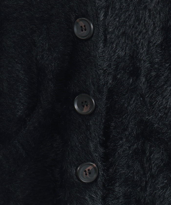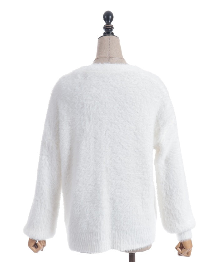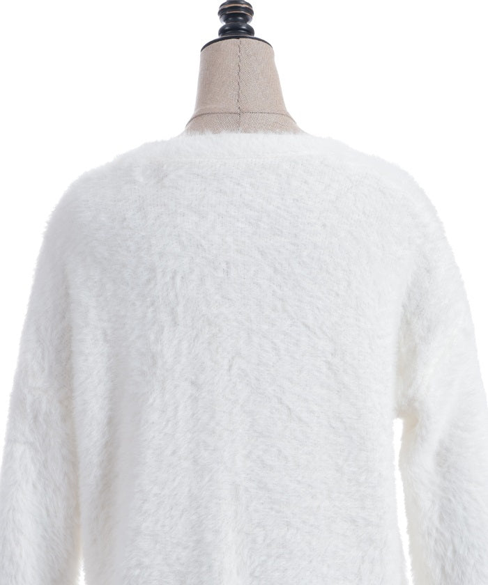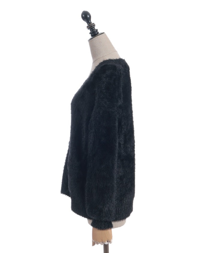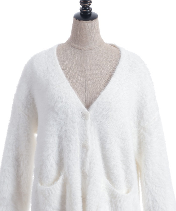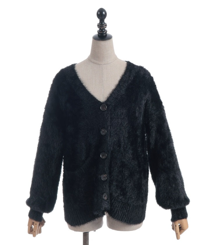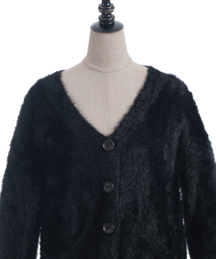 This shaggy knit cardigan boasts a soft, fluffy texture.