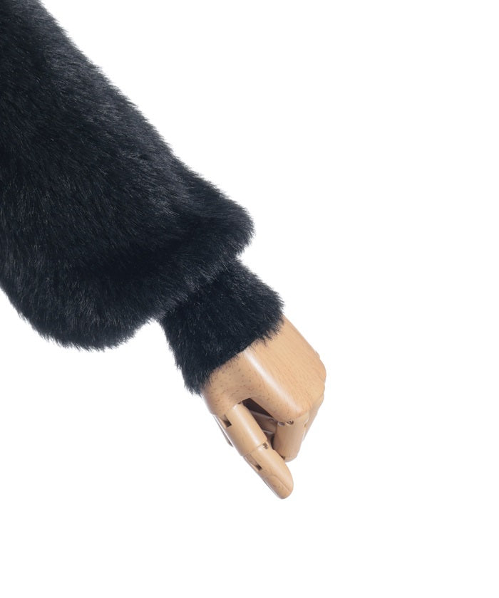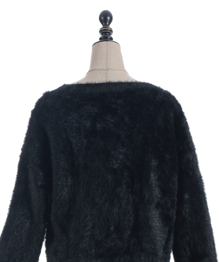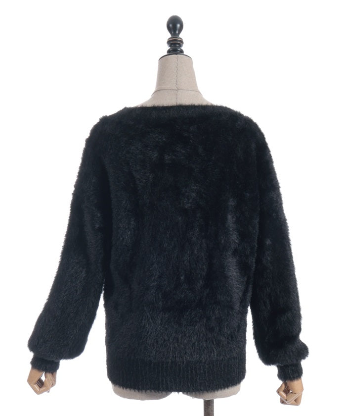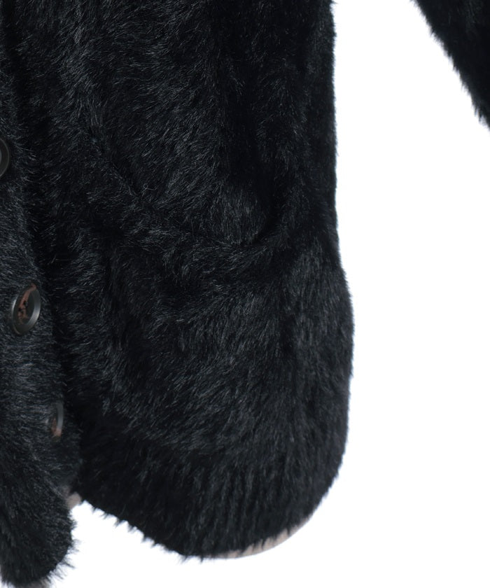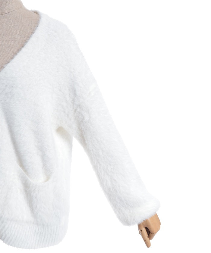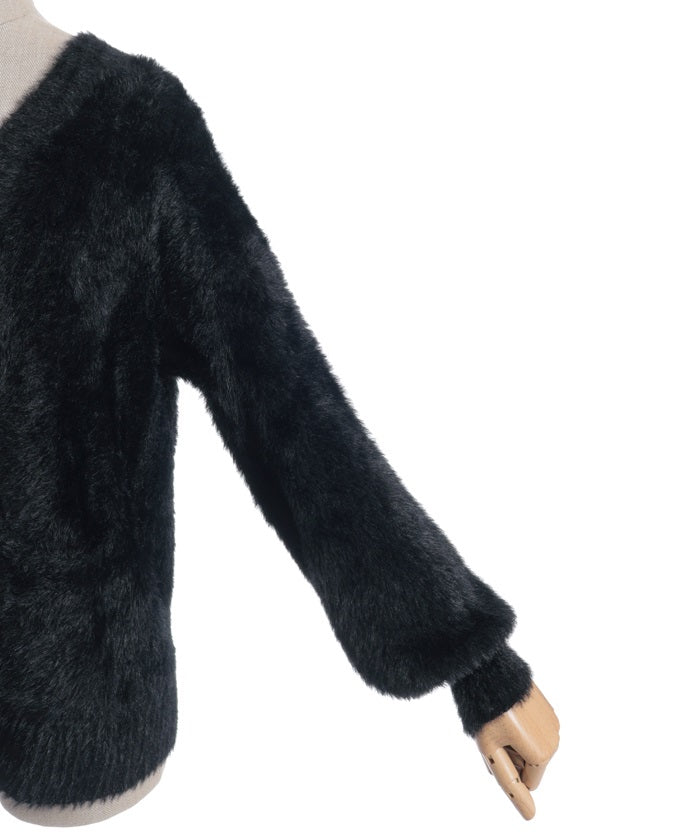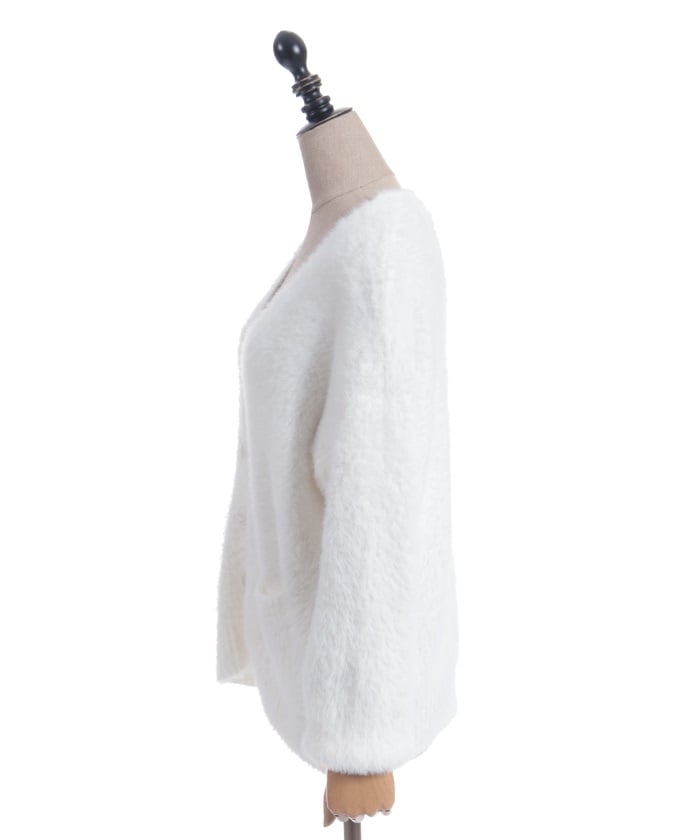 This shaggy knit cardigan boasts a soft, fluffy texture.