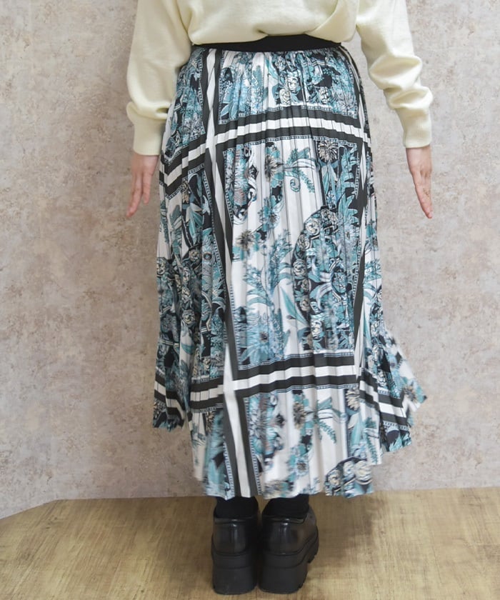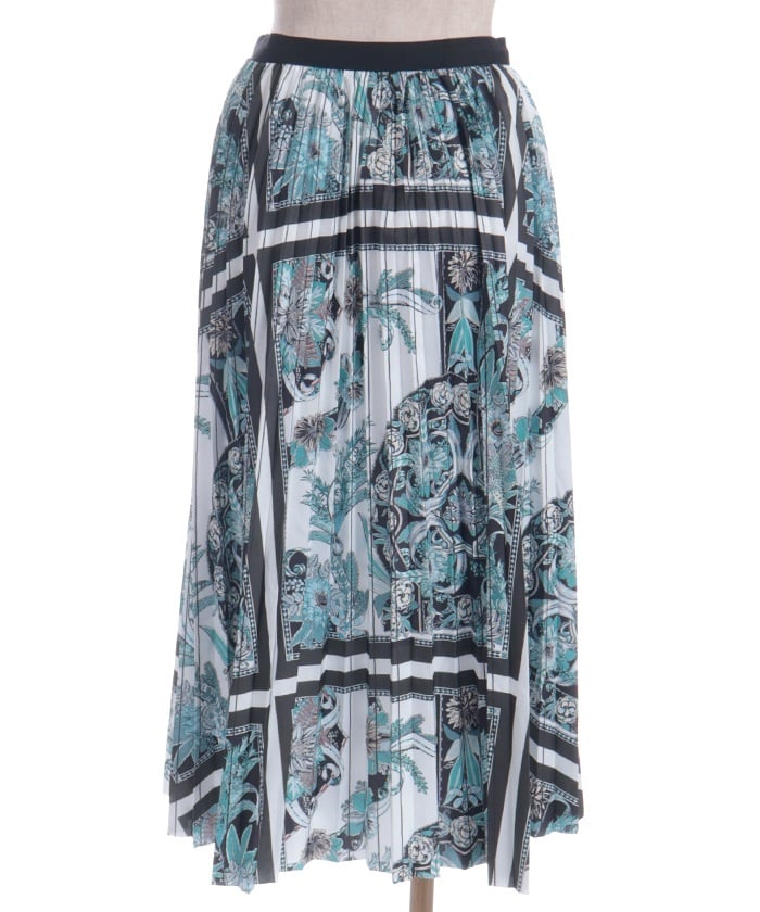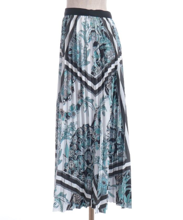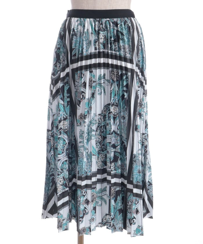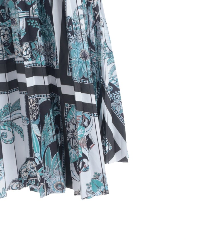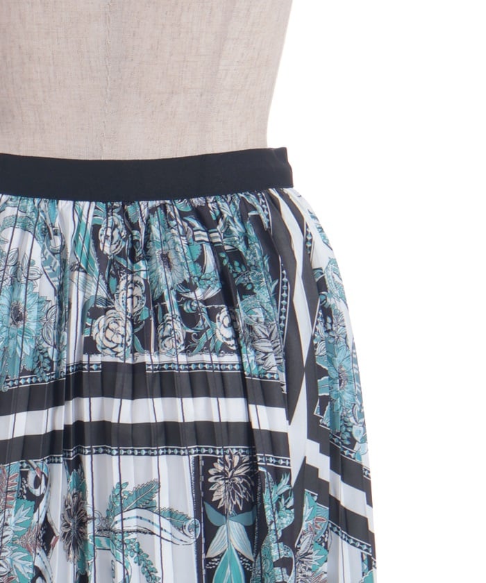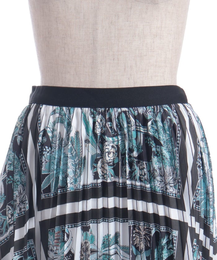 This pleated skirt features striking floral and striped motifs. The swaying silhouette creates an elegant and glamorous look with every step.