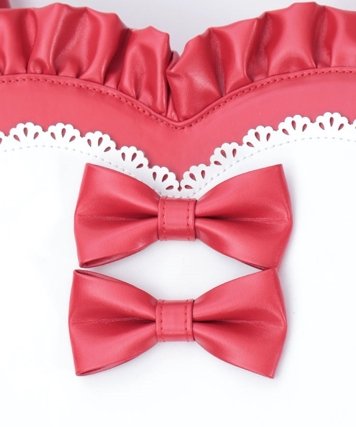 A heart-shaped bag with lots of frills. The loops inside the clear pocket side allow you to hang ball chains or straps. The bag's overall gusset is 12cm wide, but the front storage space has a 7cm gusset, while the clear back side has a 3cm gusset.