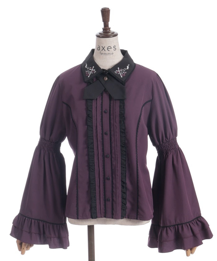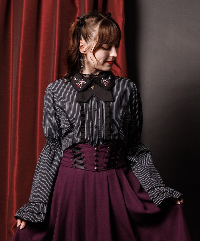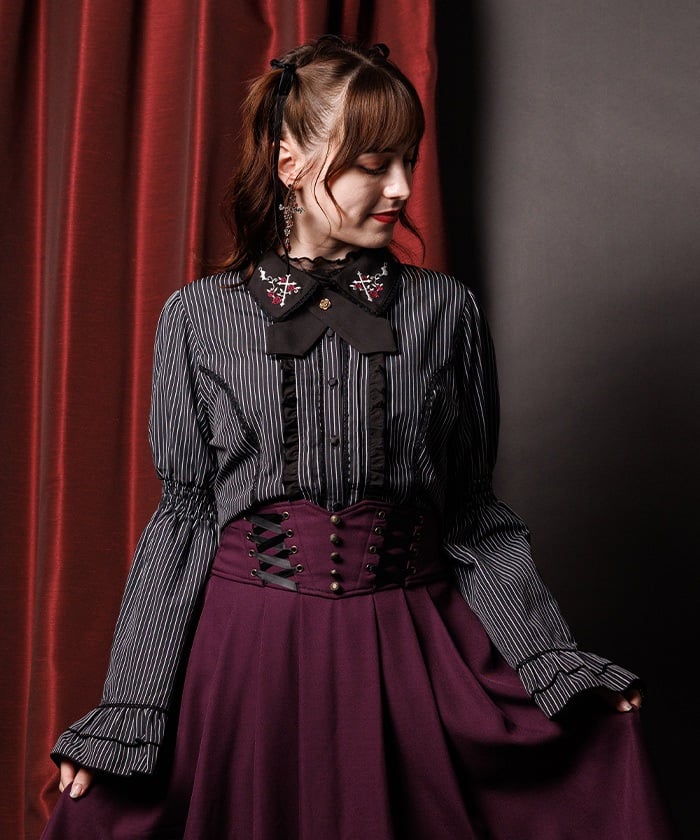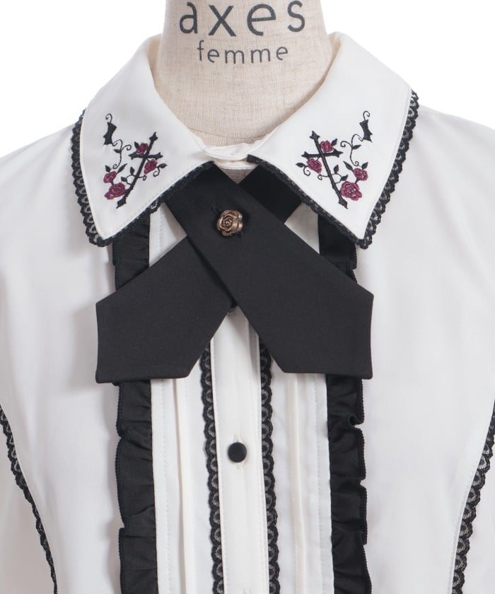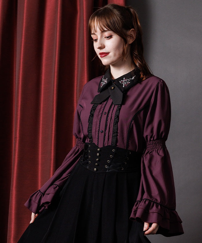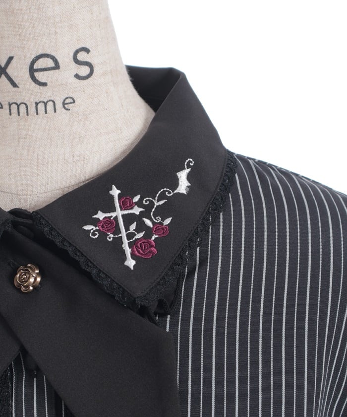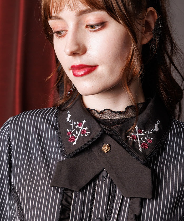 This gothic-inspired blouse exudes a dark yet glamorous presence. Embroidery combining crosses, bat wings, and roses adorns the collar, beckoning you into the world of a fairytale. It's a perfect piece for Halloween, events, and everyday wear alike.