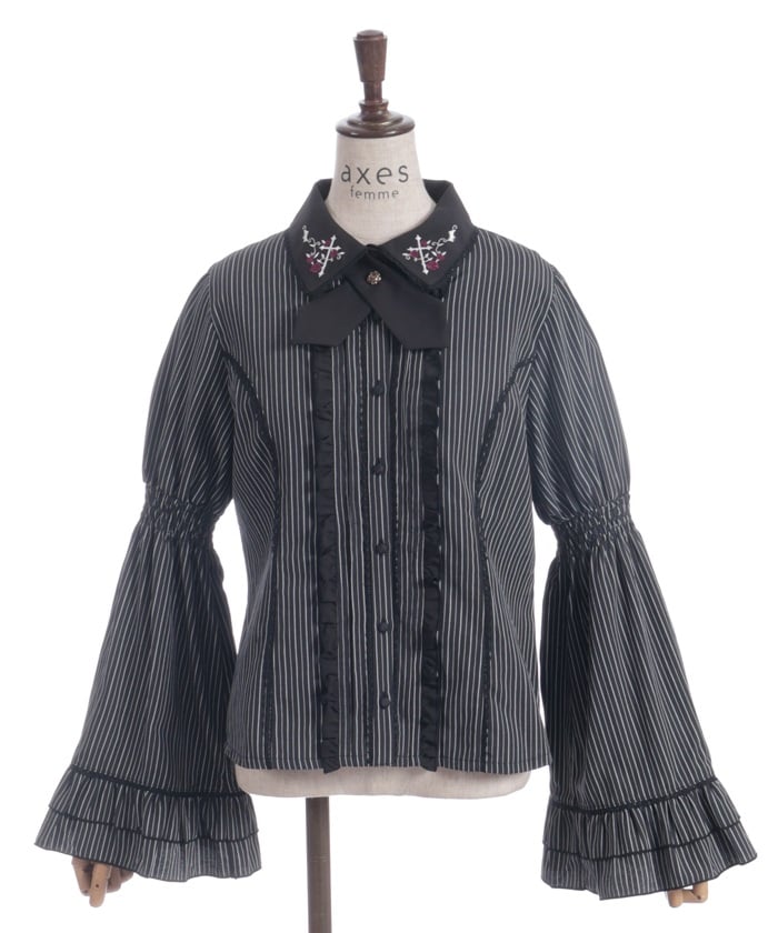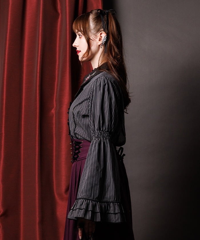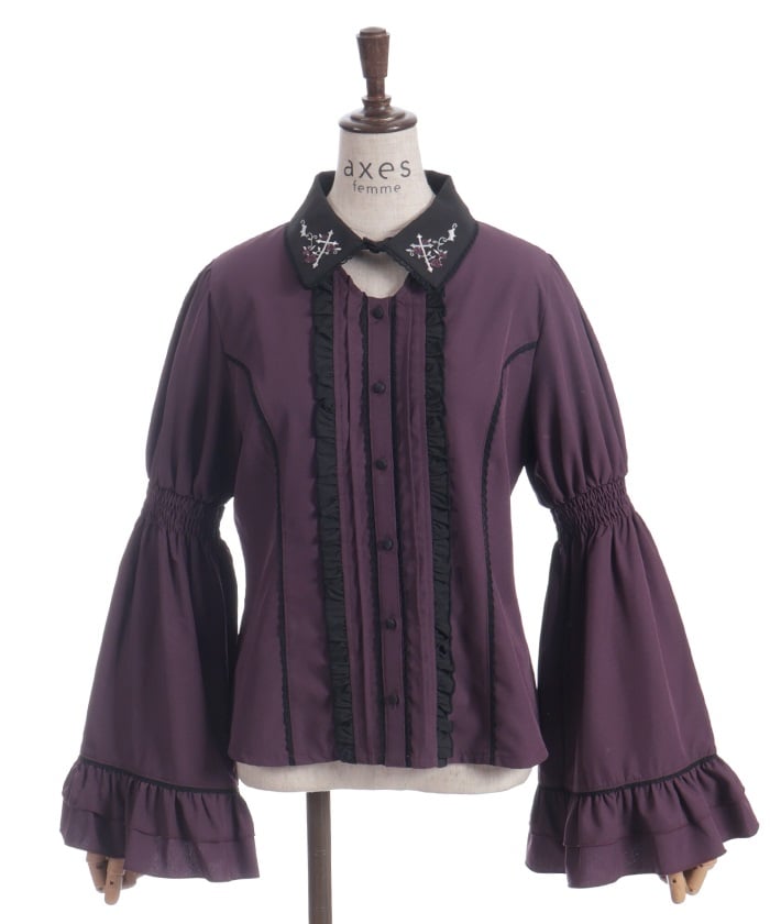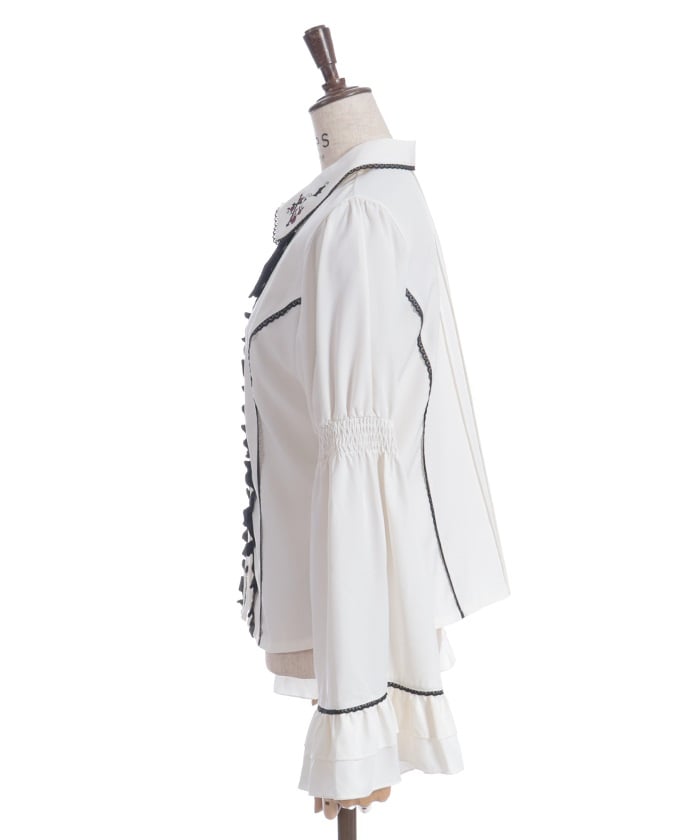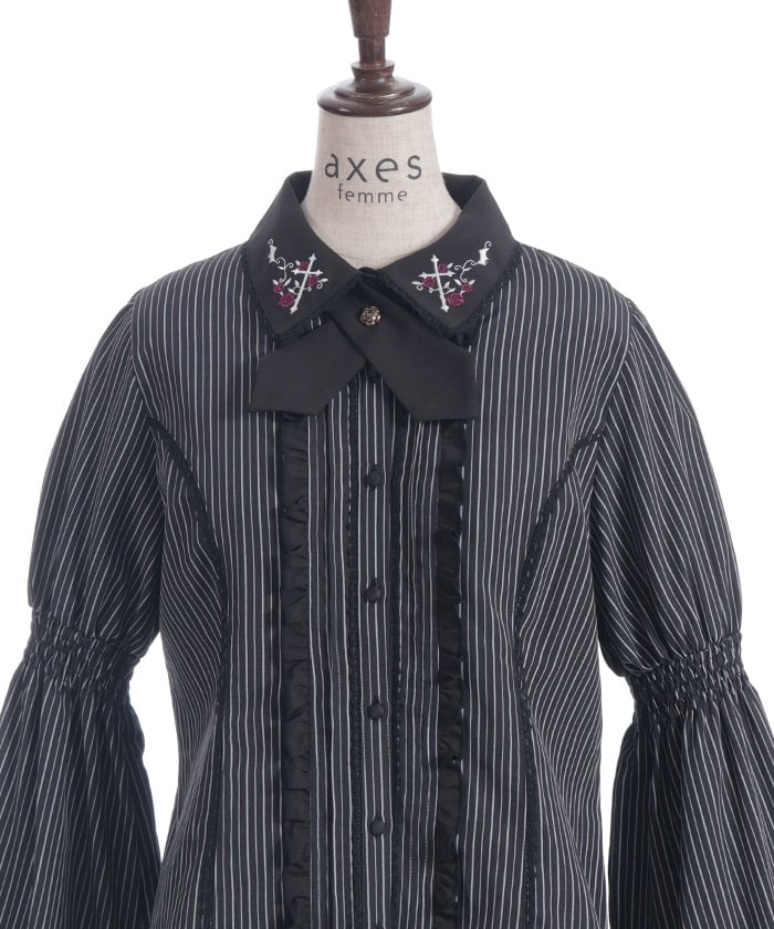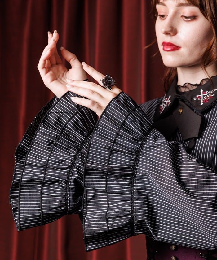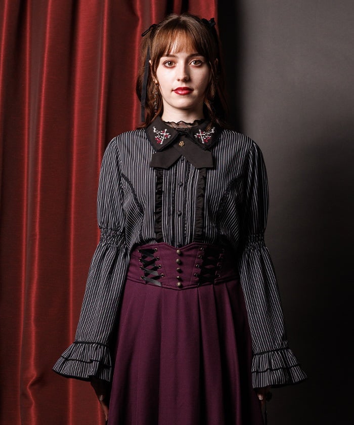 This gothic-inspired blouse exudes a dark yet glamorous presence. Embroidery combining crosses, bat wings, and roses adorns the collar, beckoning you into the world of a fairytale. It's a perfect piece for Halloween, events, and everyday wear alike.