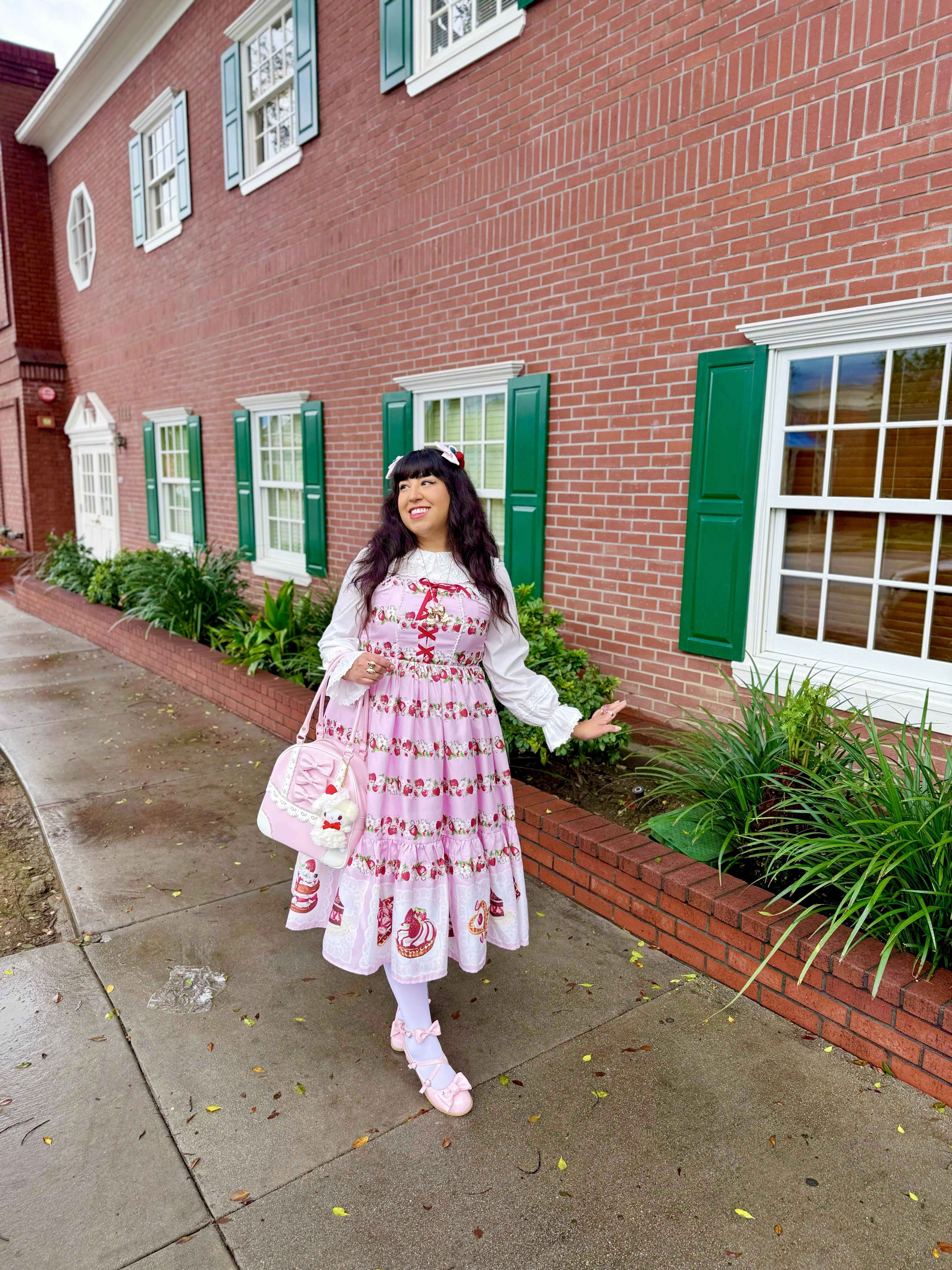 We recommend wearing it with a pannier to give the skirt some poof♡ With its long length, you can pair it with the matching apron and the cute hem print will still be visible. For a more casual look, try it with a knit pullover as an inner layer.