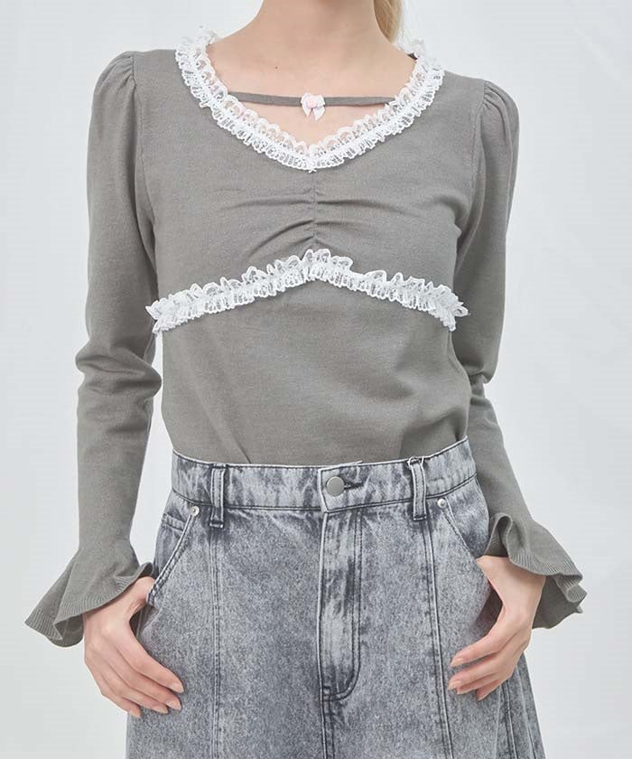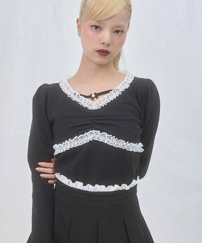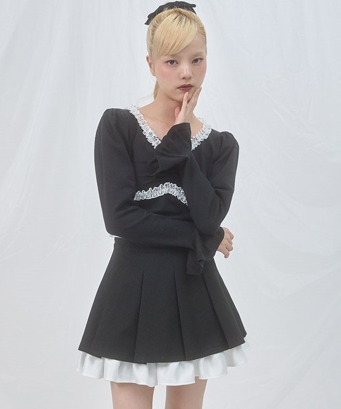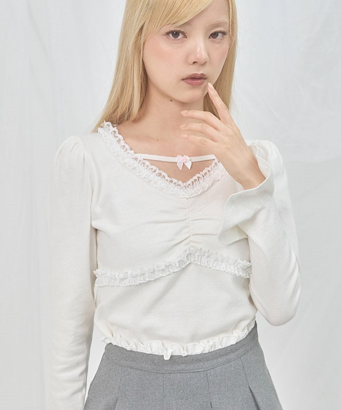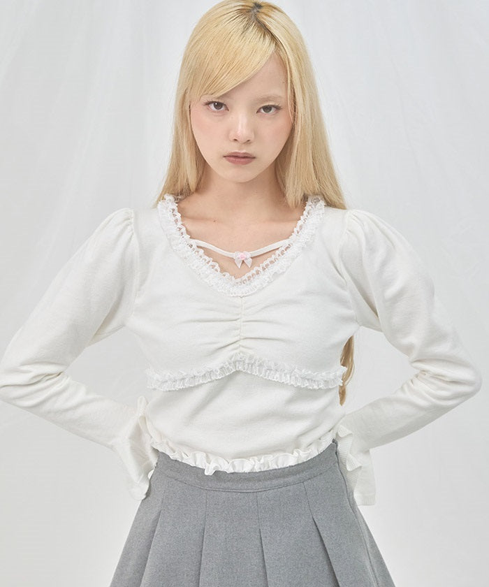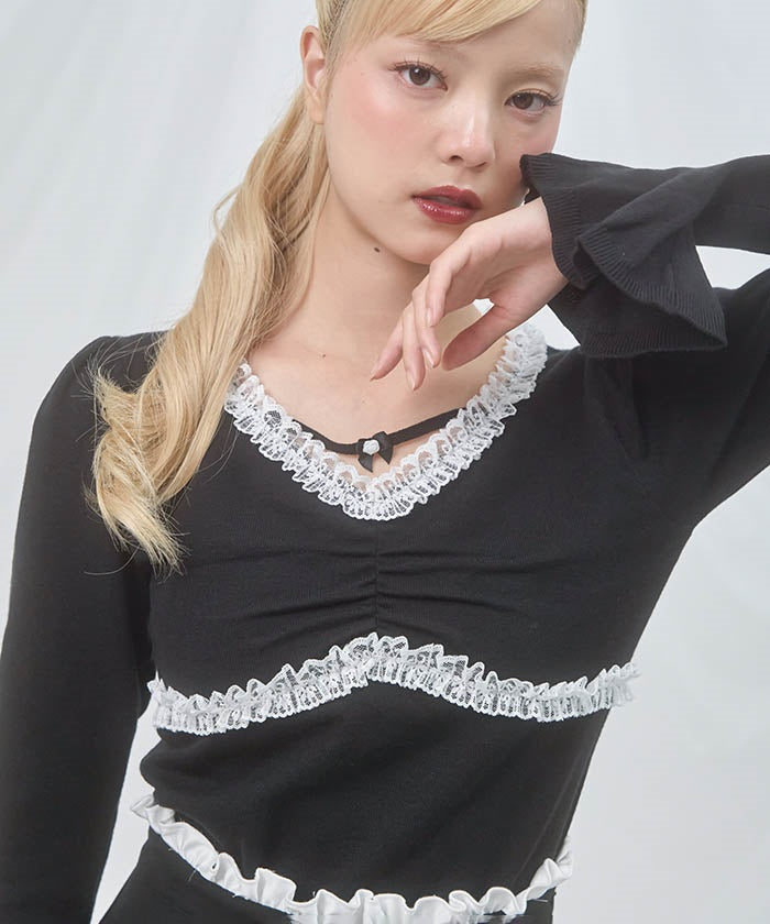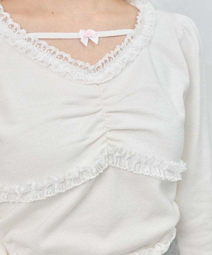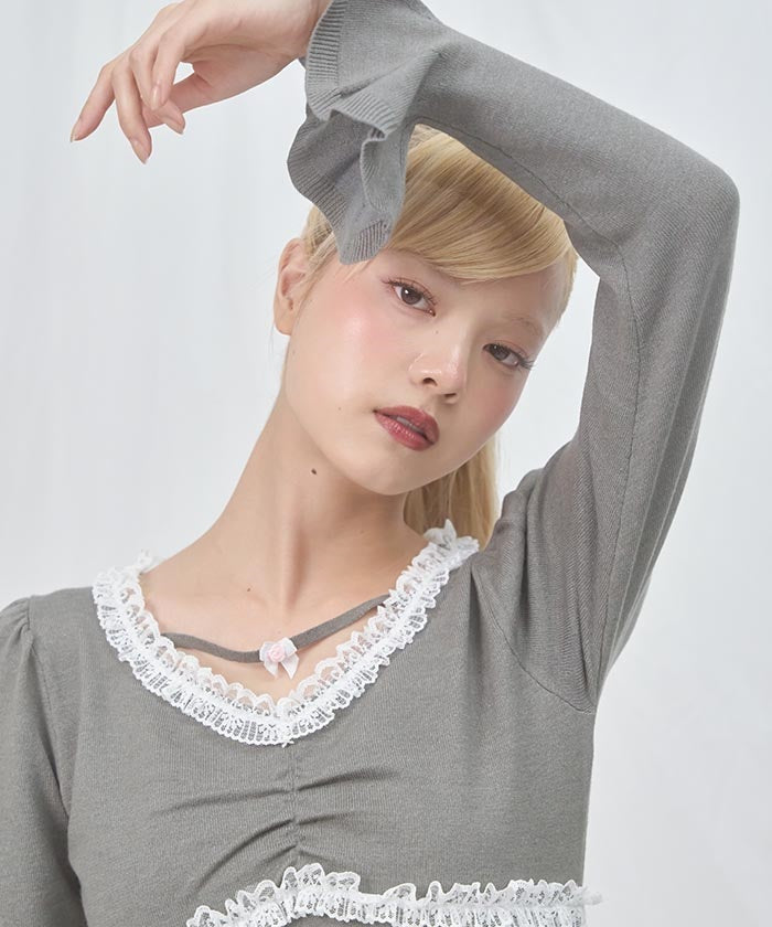 The V-neck creates a sleek look, accented with lace ruffles and mini ribbons,