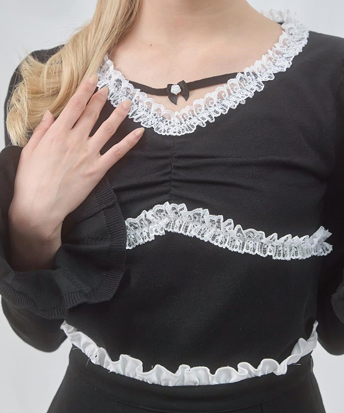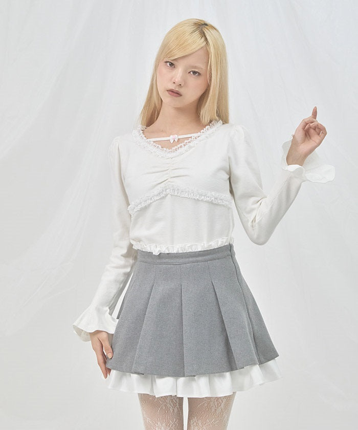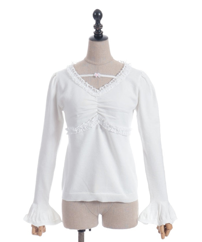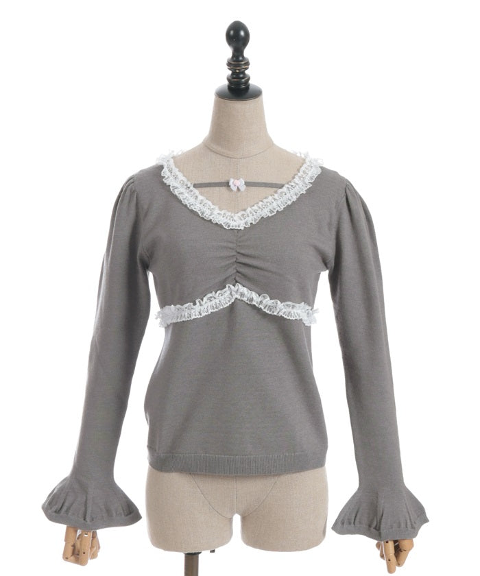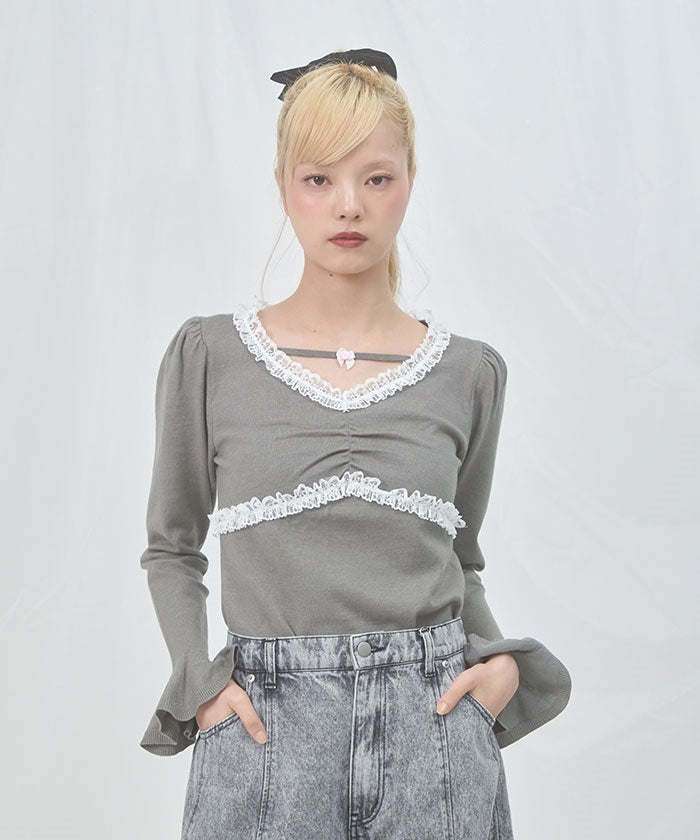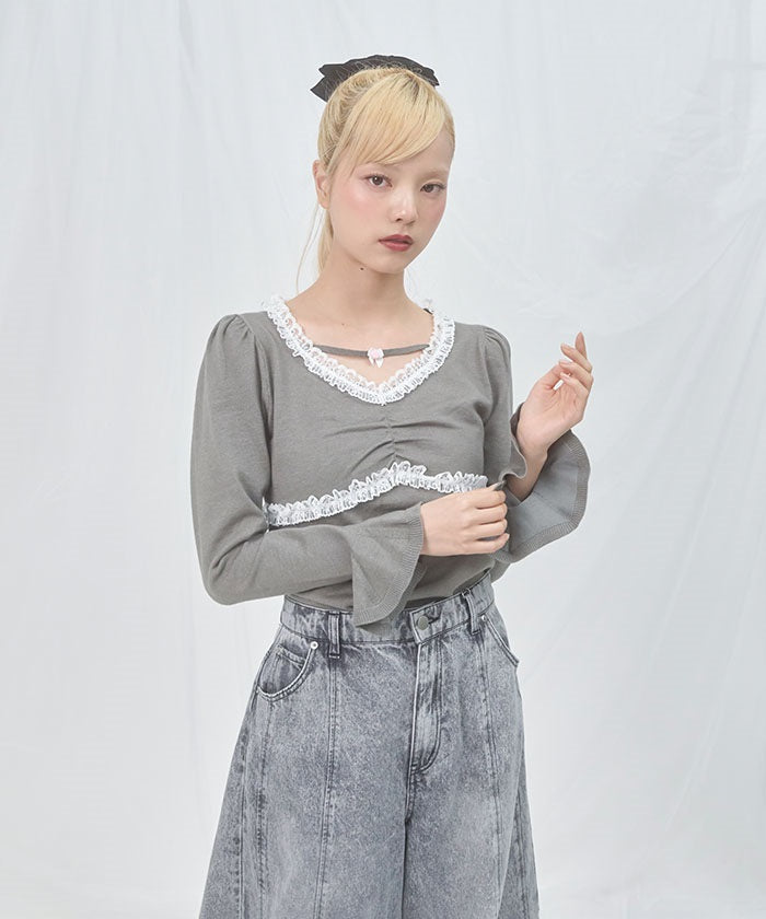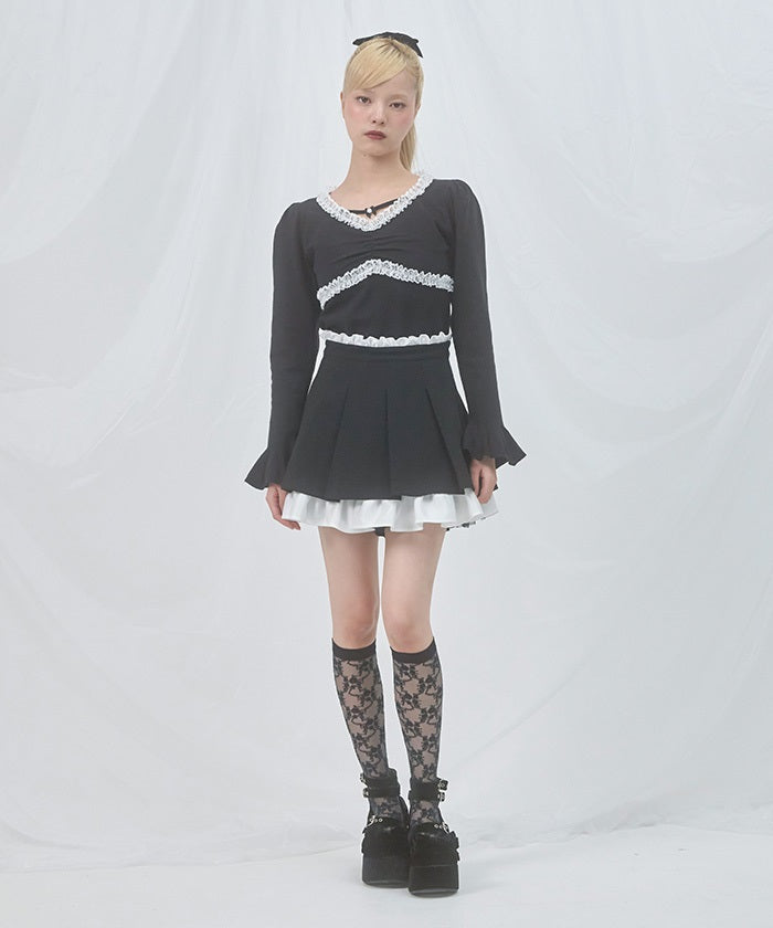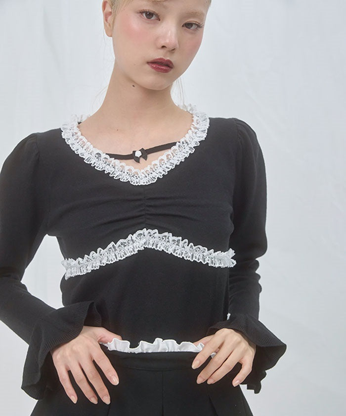 The V-neck creates a sleek look, accented with lace ruffles and mini ribbons,