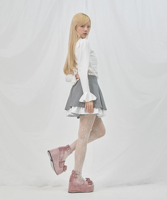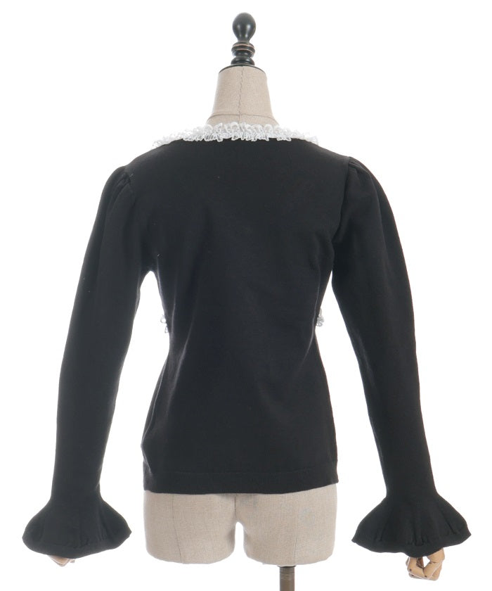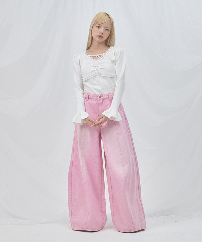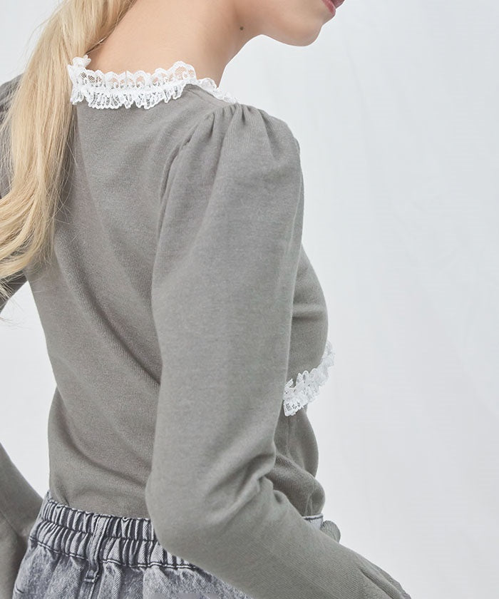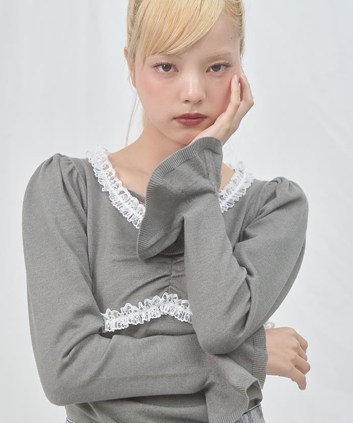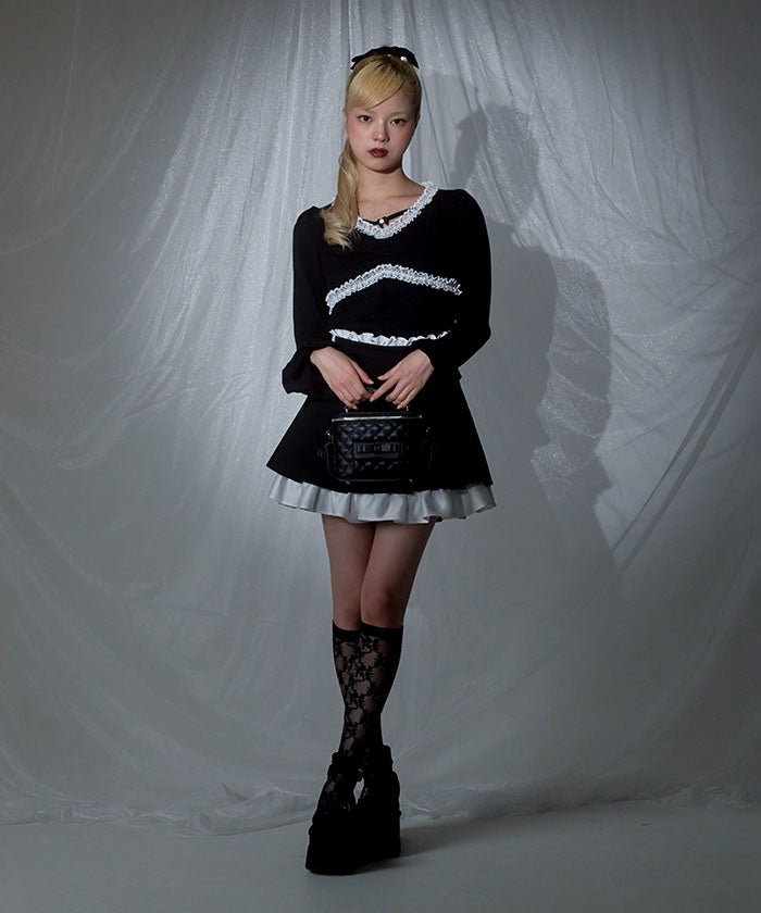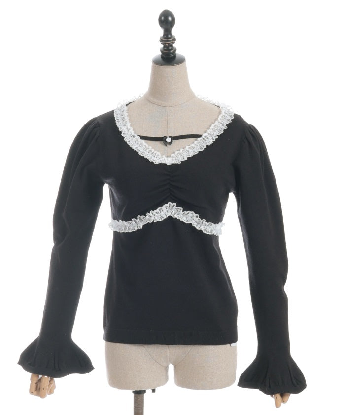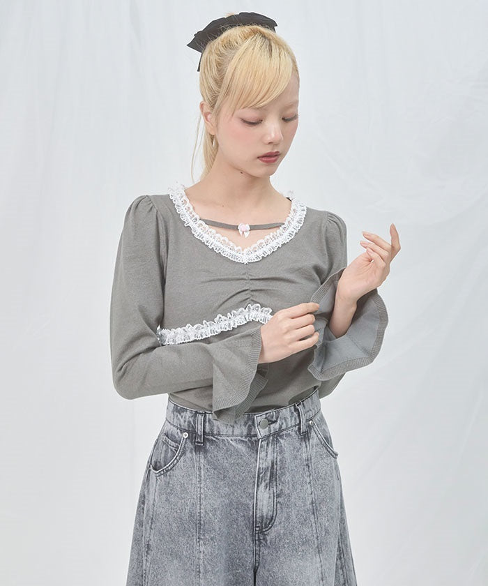 The V-neck creates a sleek look, accented with lace ruffles and mini ribbons,