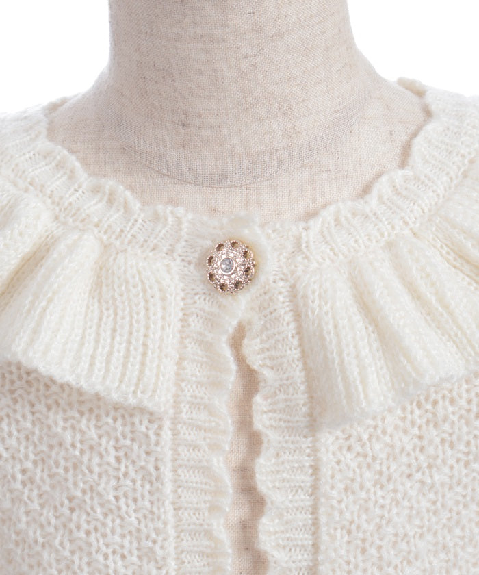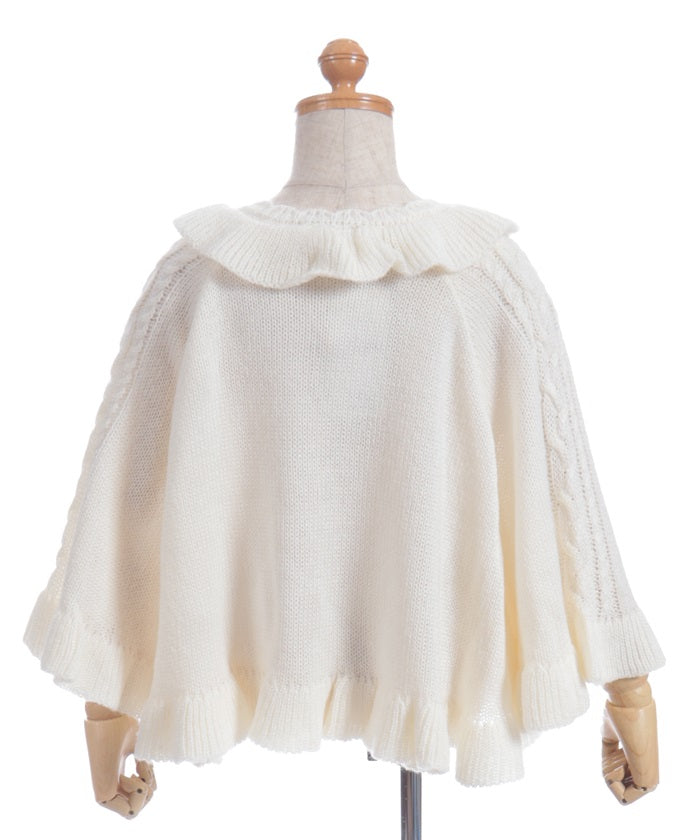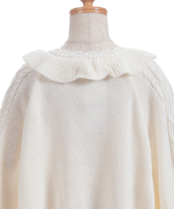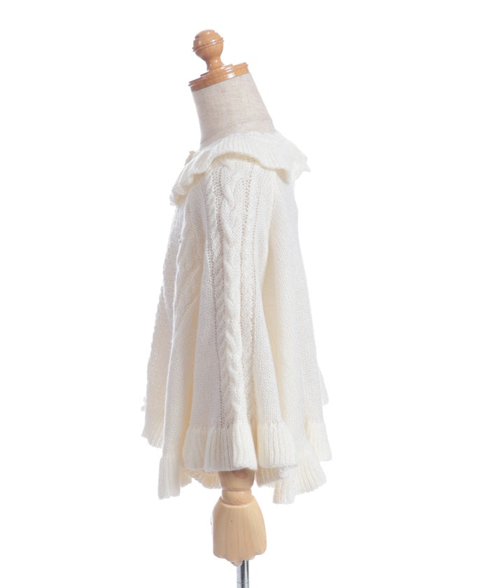 The large, ruffled collar and knit ribbed ruffles running from the hem to the sleeves create a soft, adorable silhouette.
