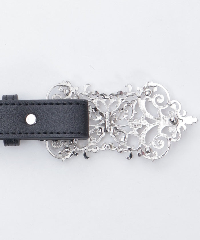 This faux leather belt features a delicate butterfly motif buckle.