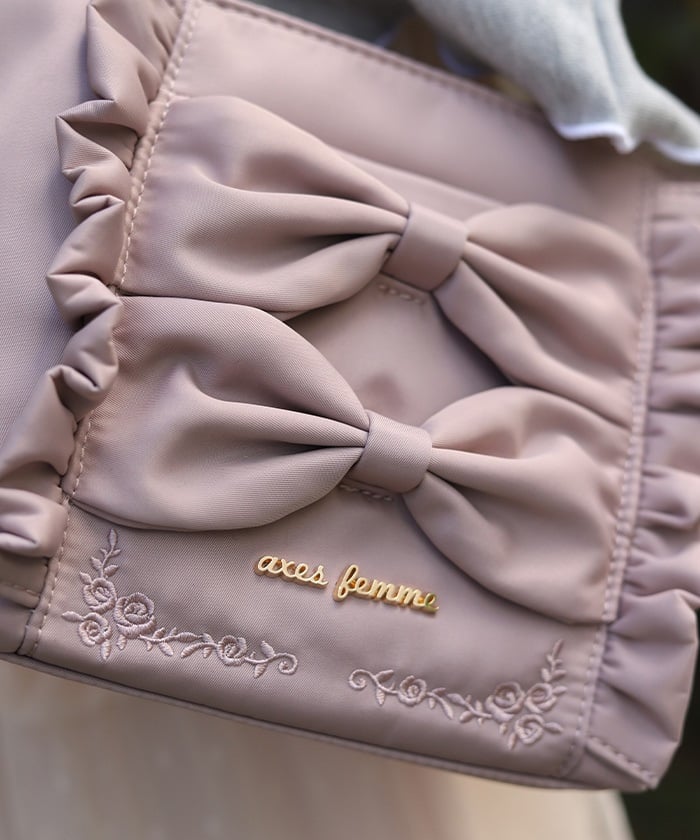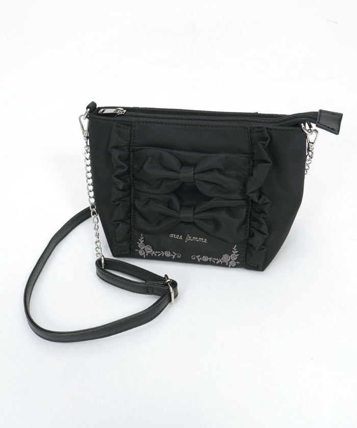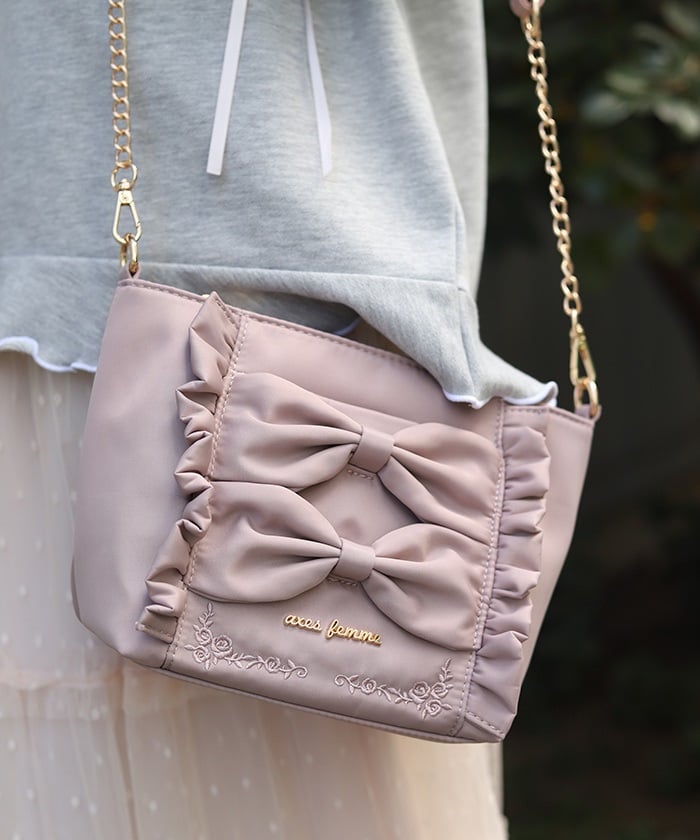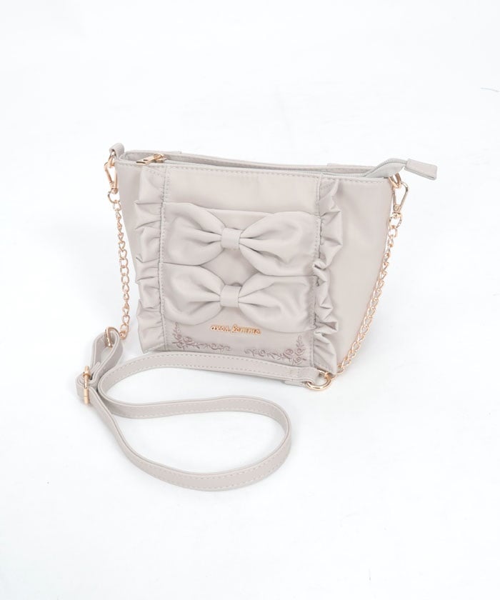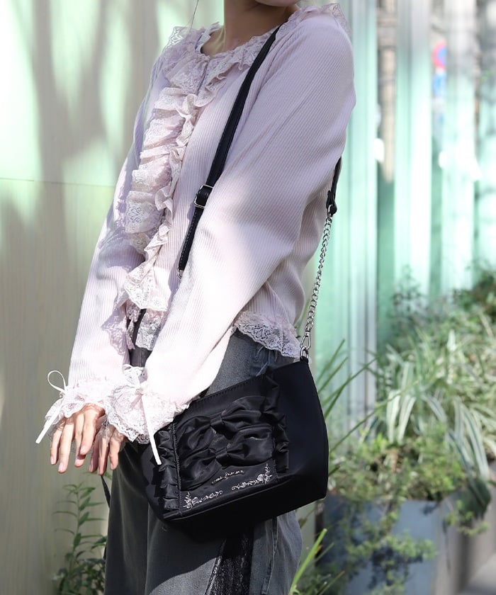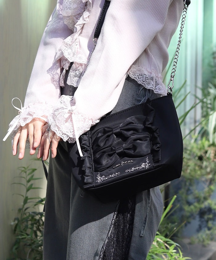 This shoulder bag features gorgeous embroidery and a ribbon design.