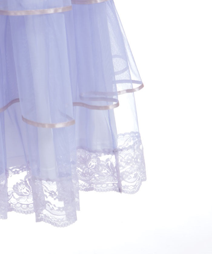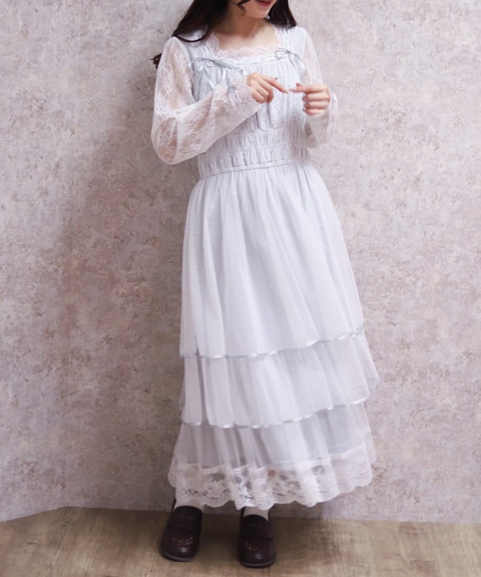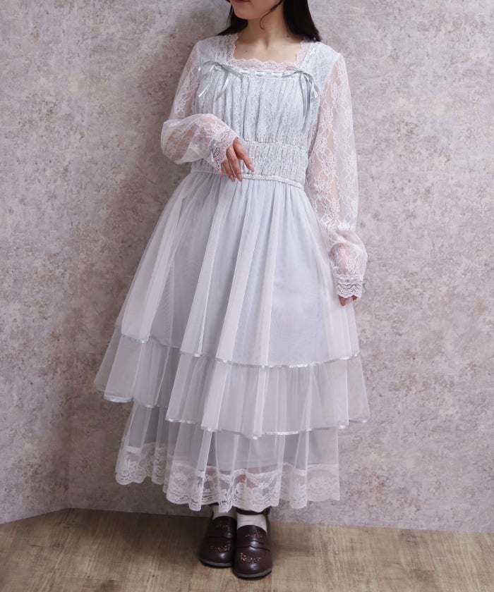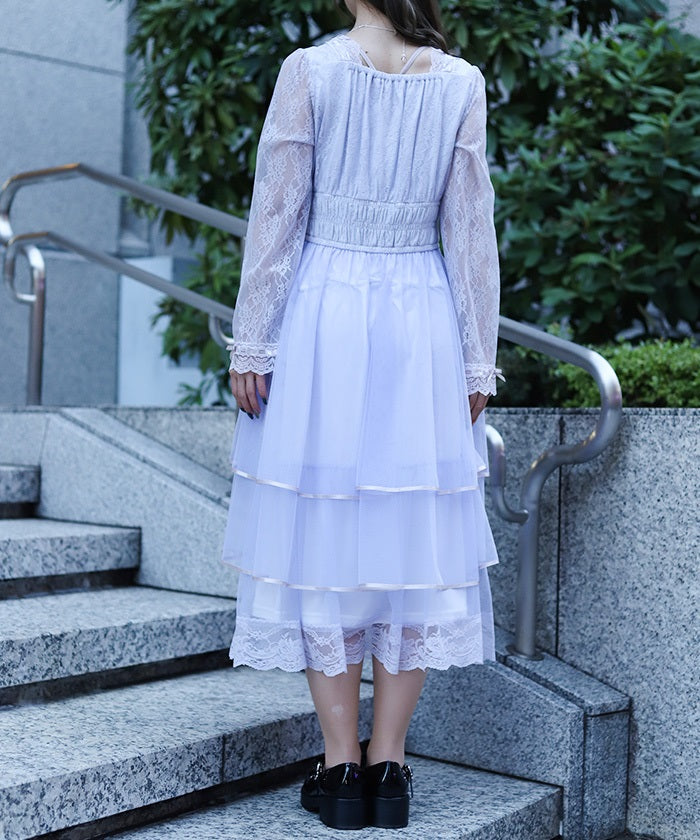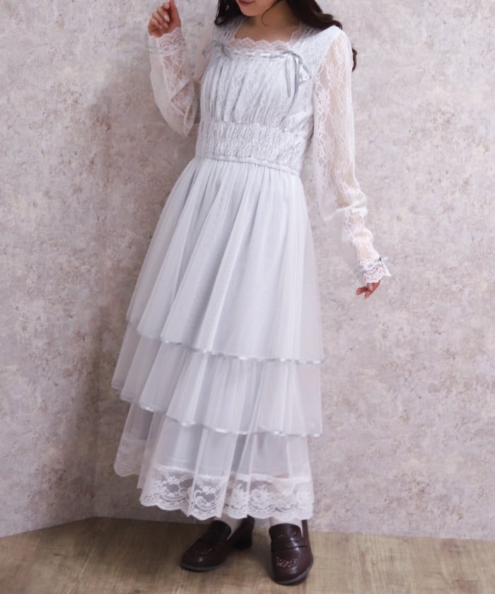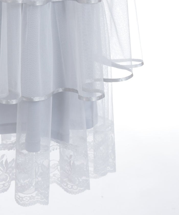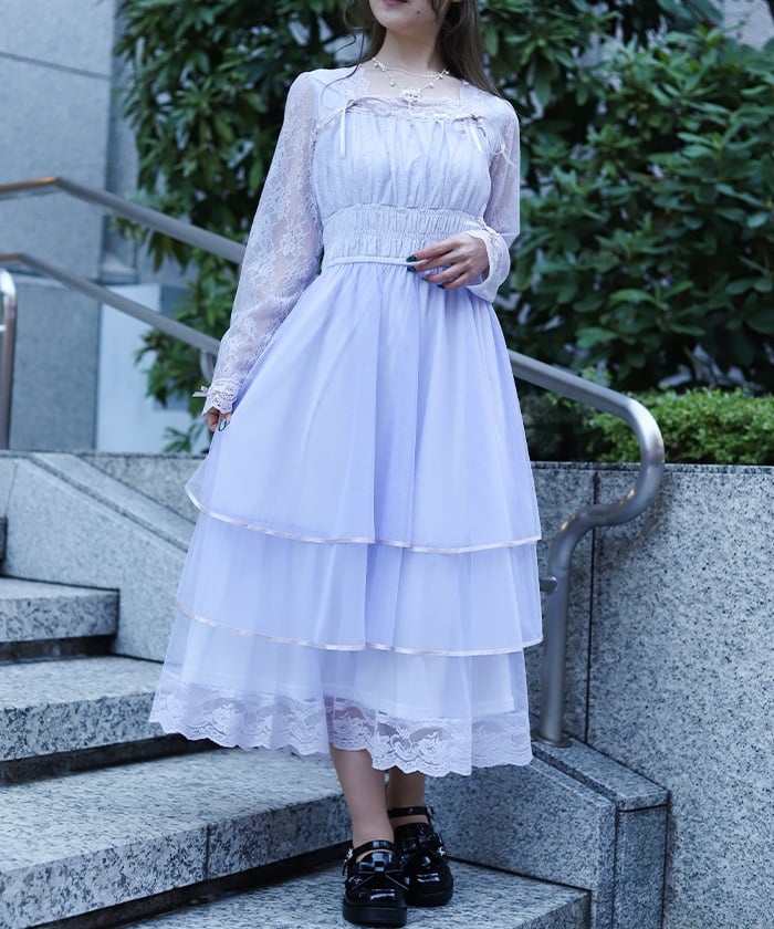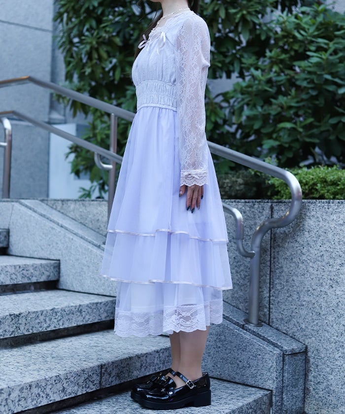 The delicate material lends an elegant impression, and the tiered silhouette that widens towards the hem creates a beautiful line. Its sweet yet demure design shows attention to detail.