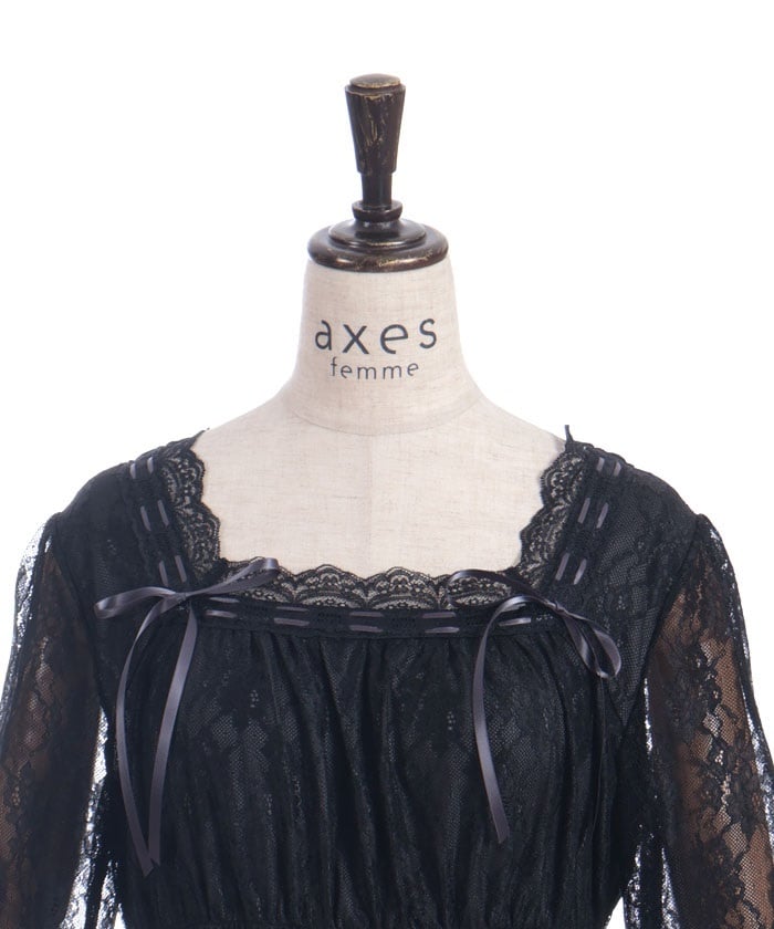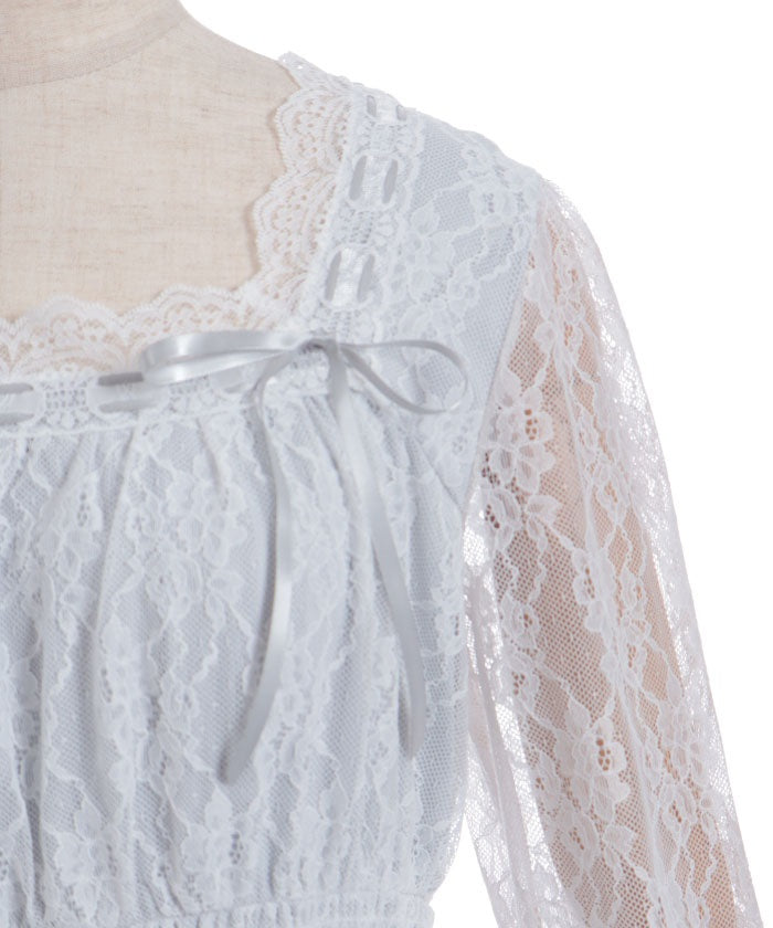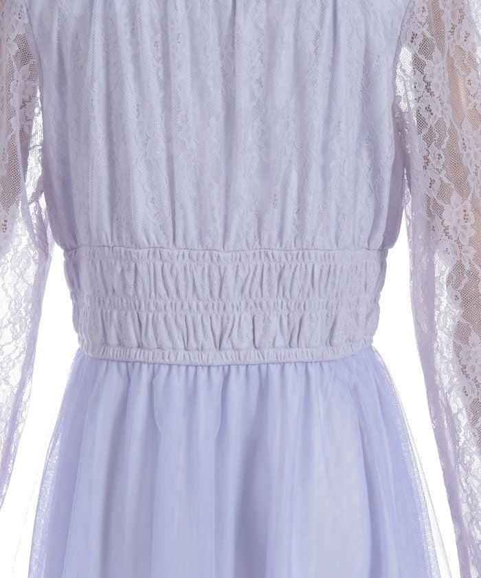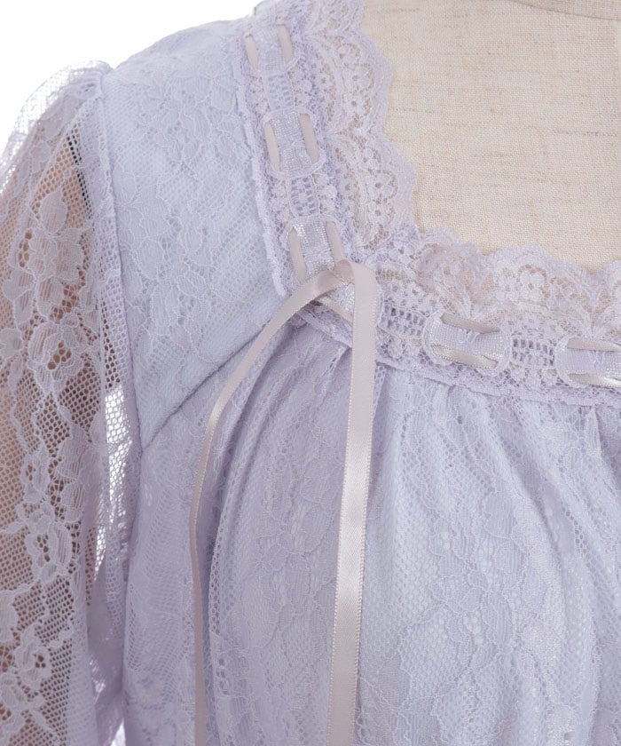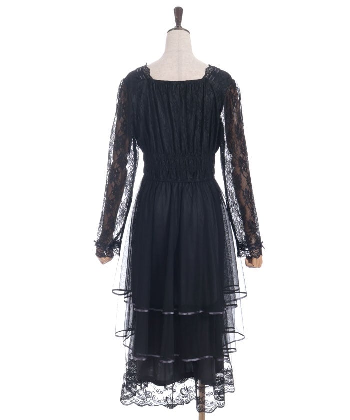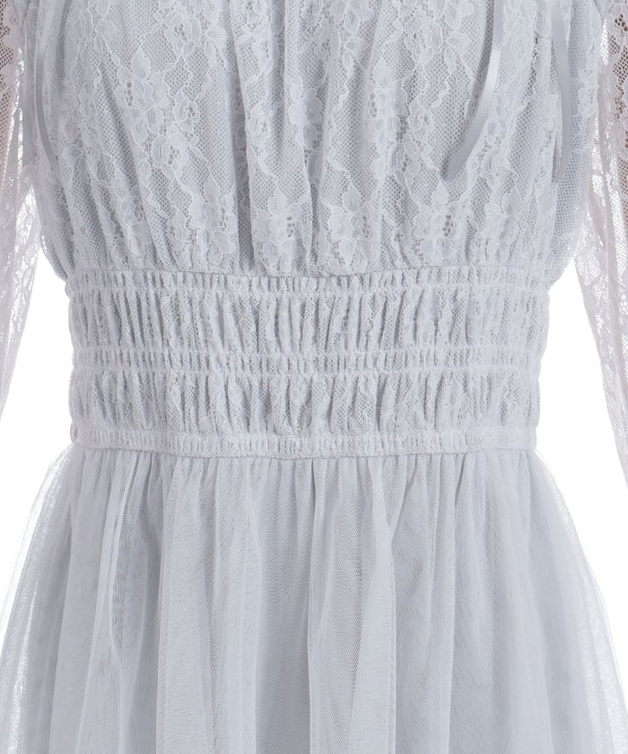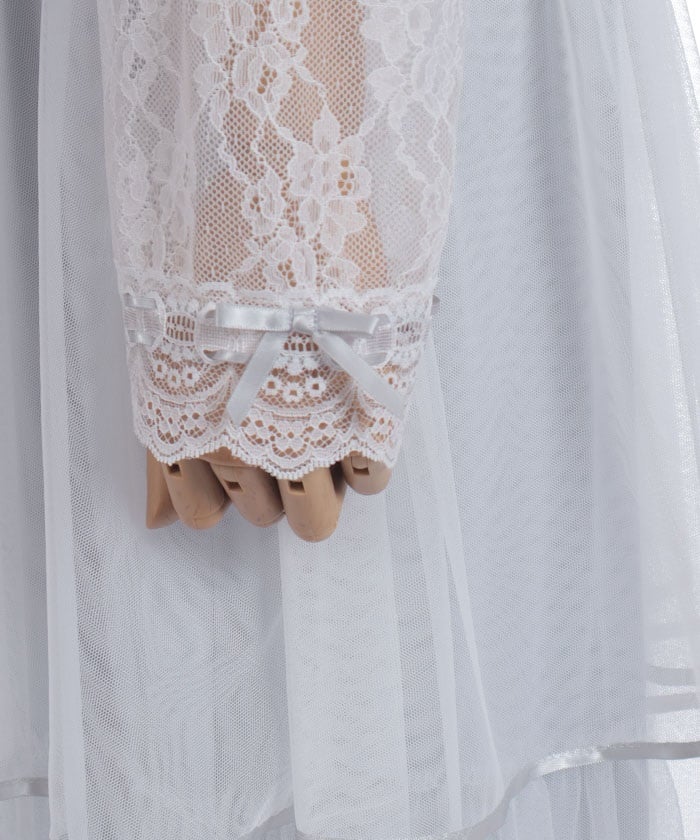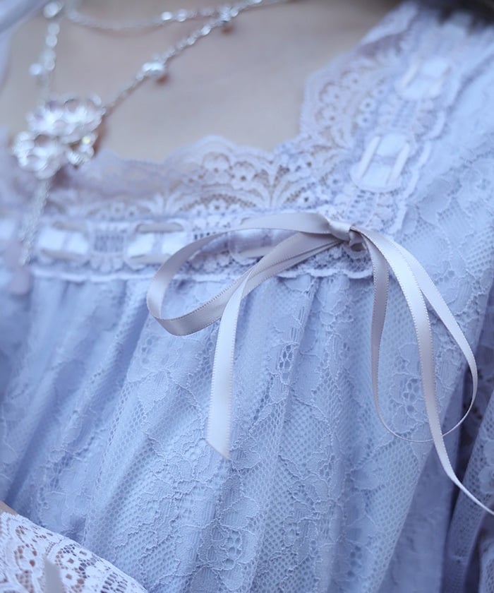 This dress is lavishly decorated with tulle, lace, and ribbons, allowing you to fully enjoy its feminine charm.