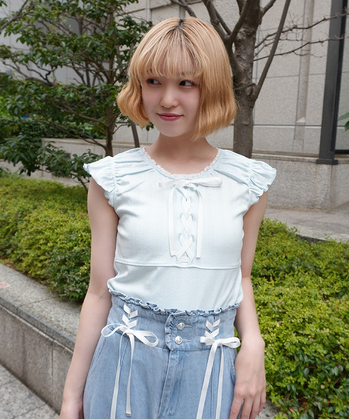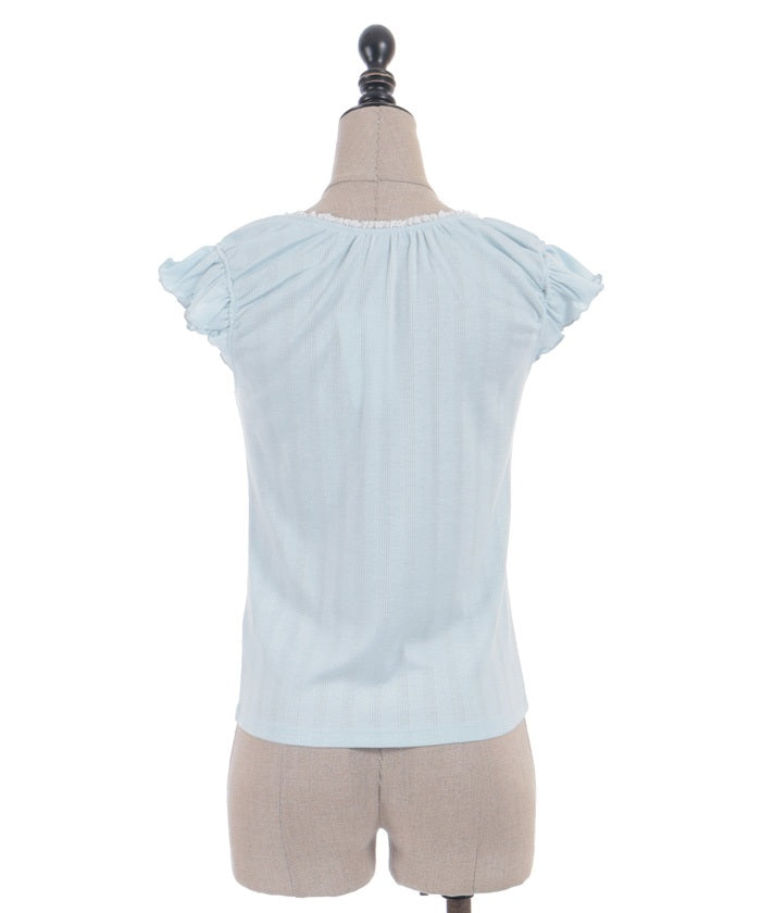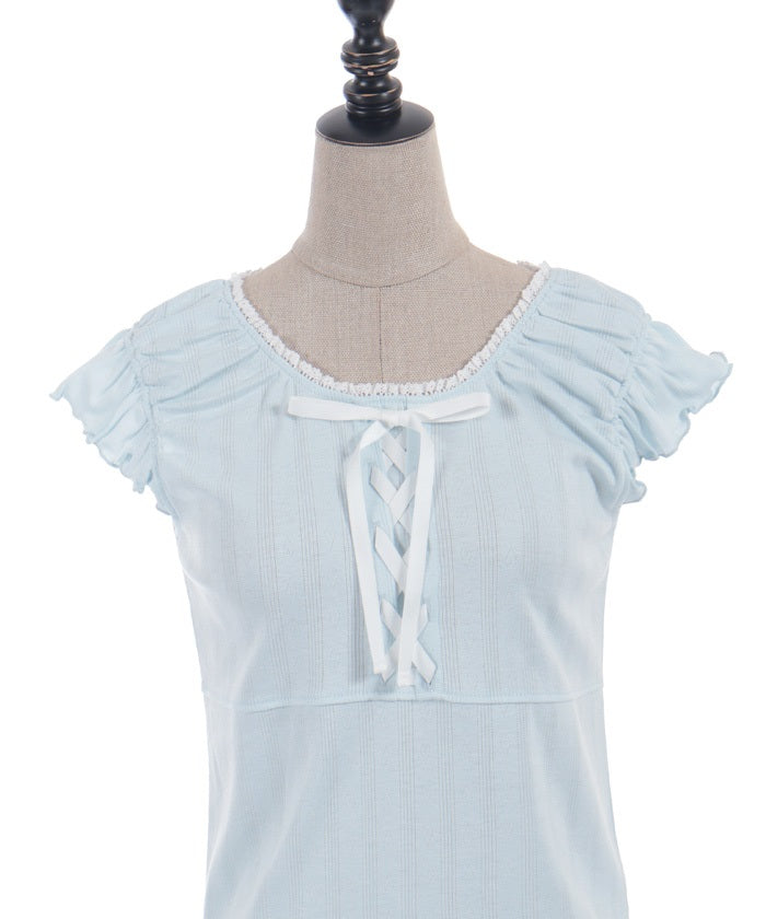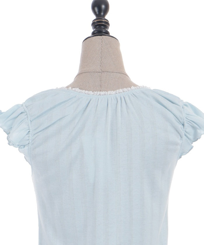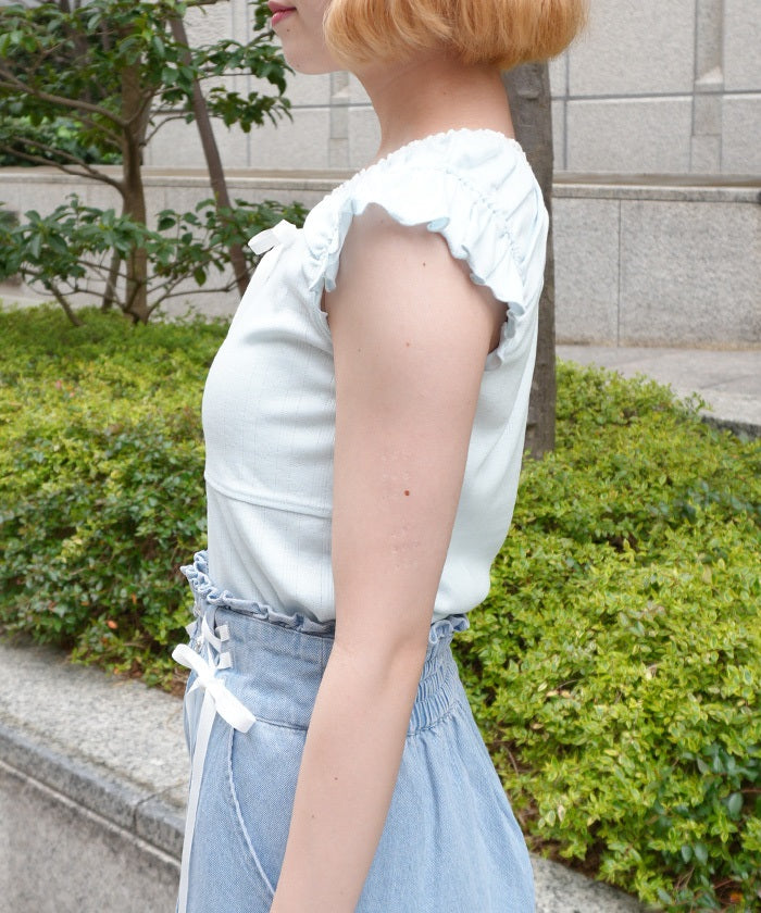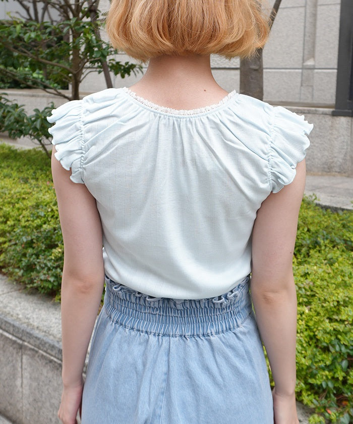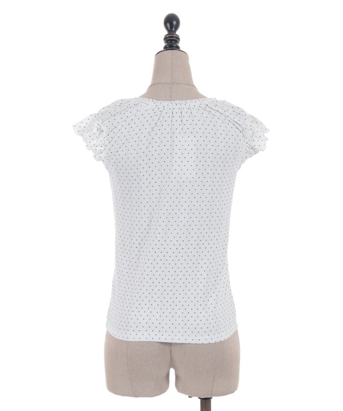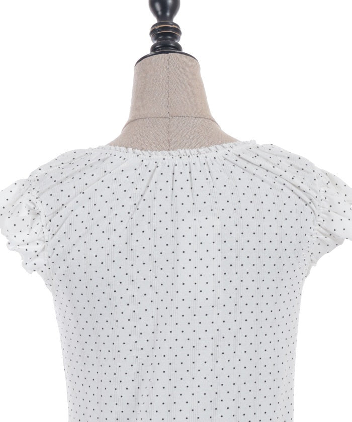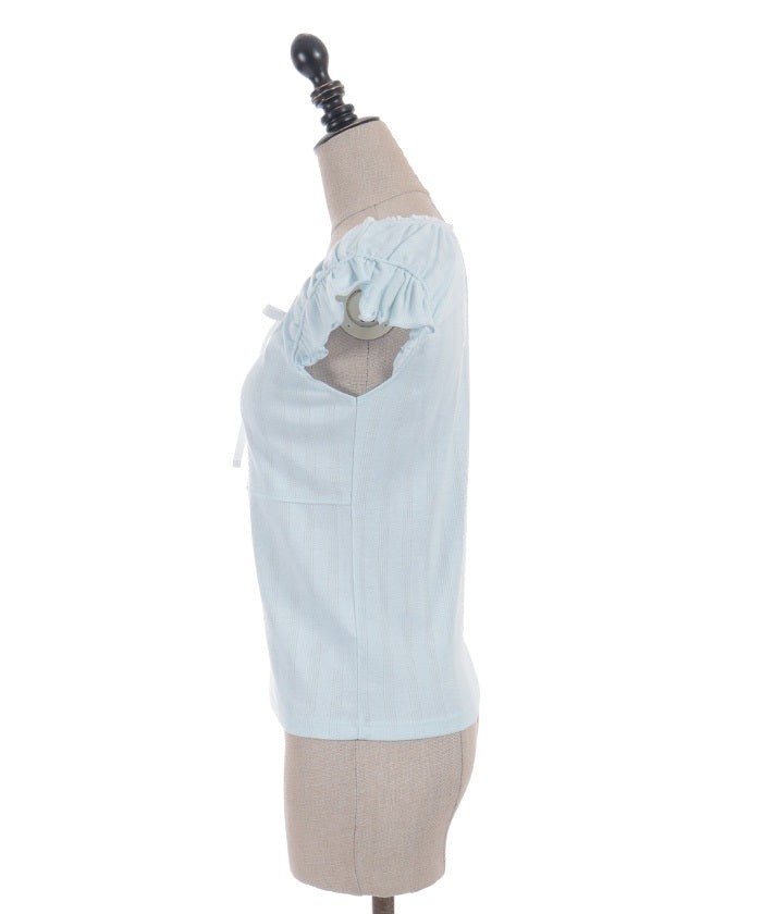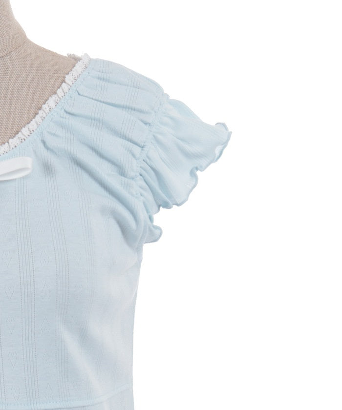 The gathered silhouette and shoulder ruffles subtly cover the shoulders.